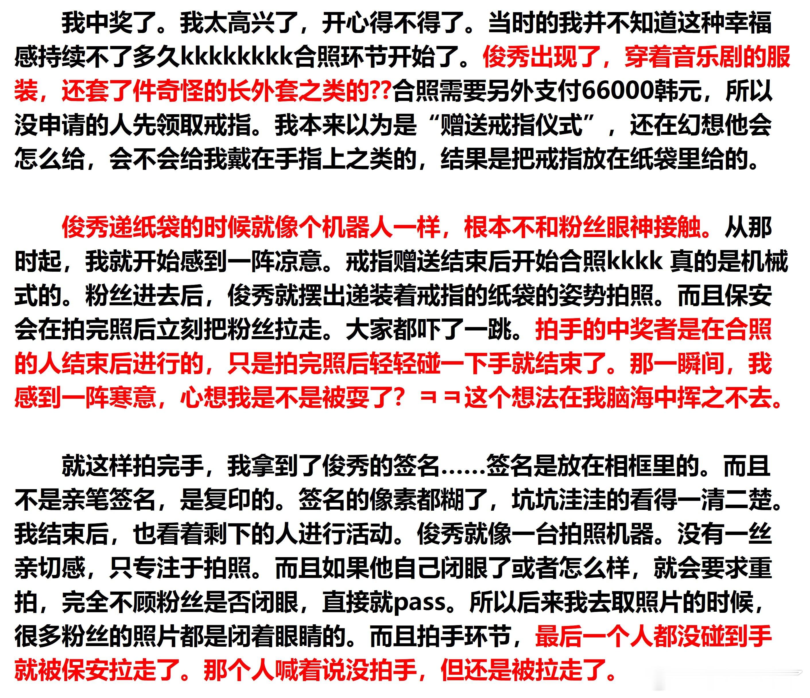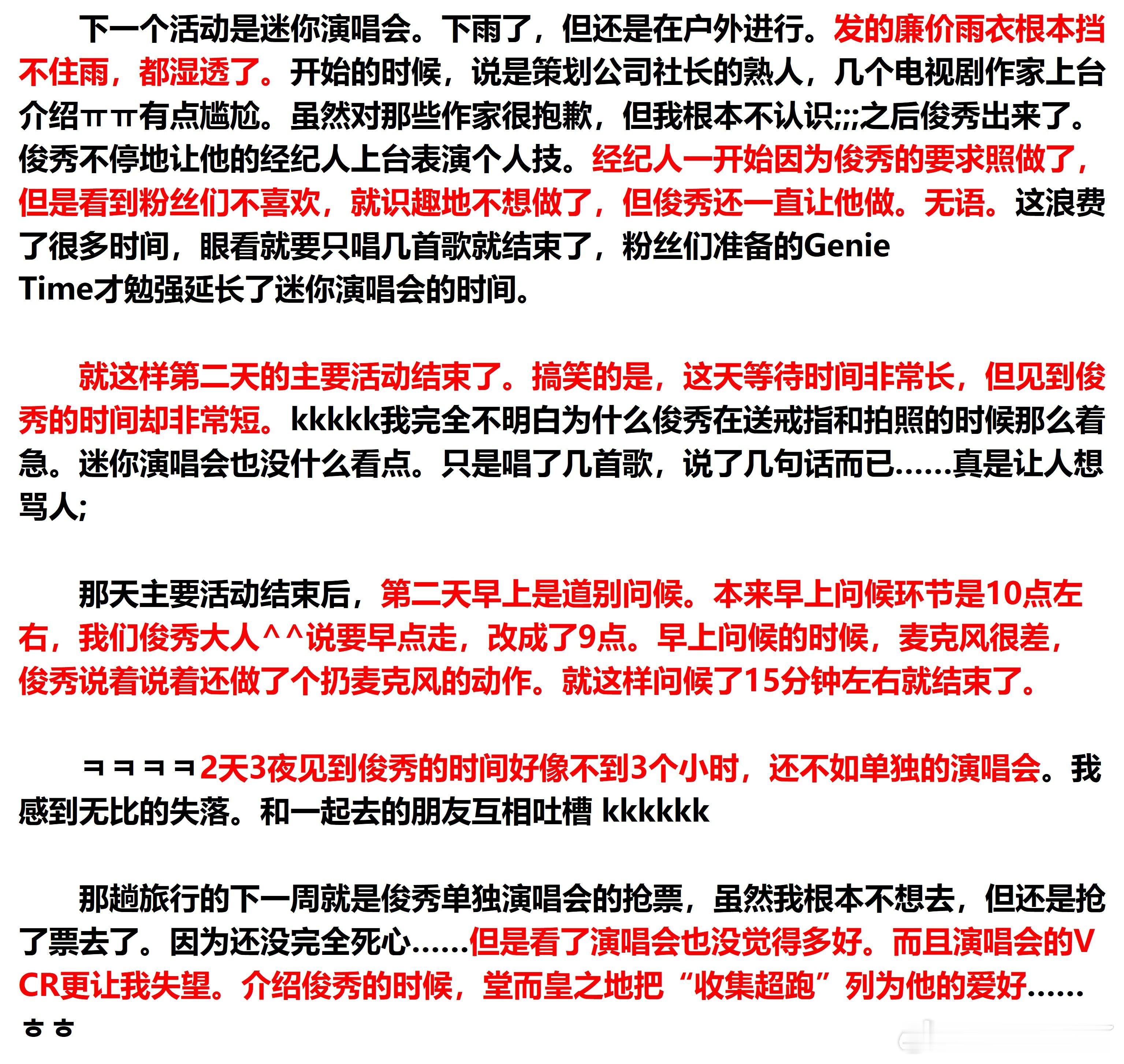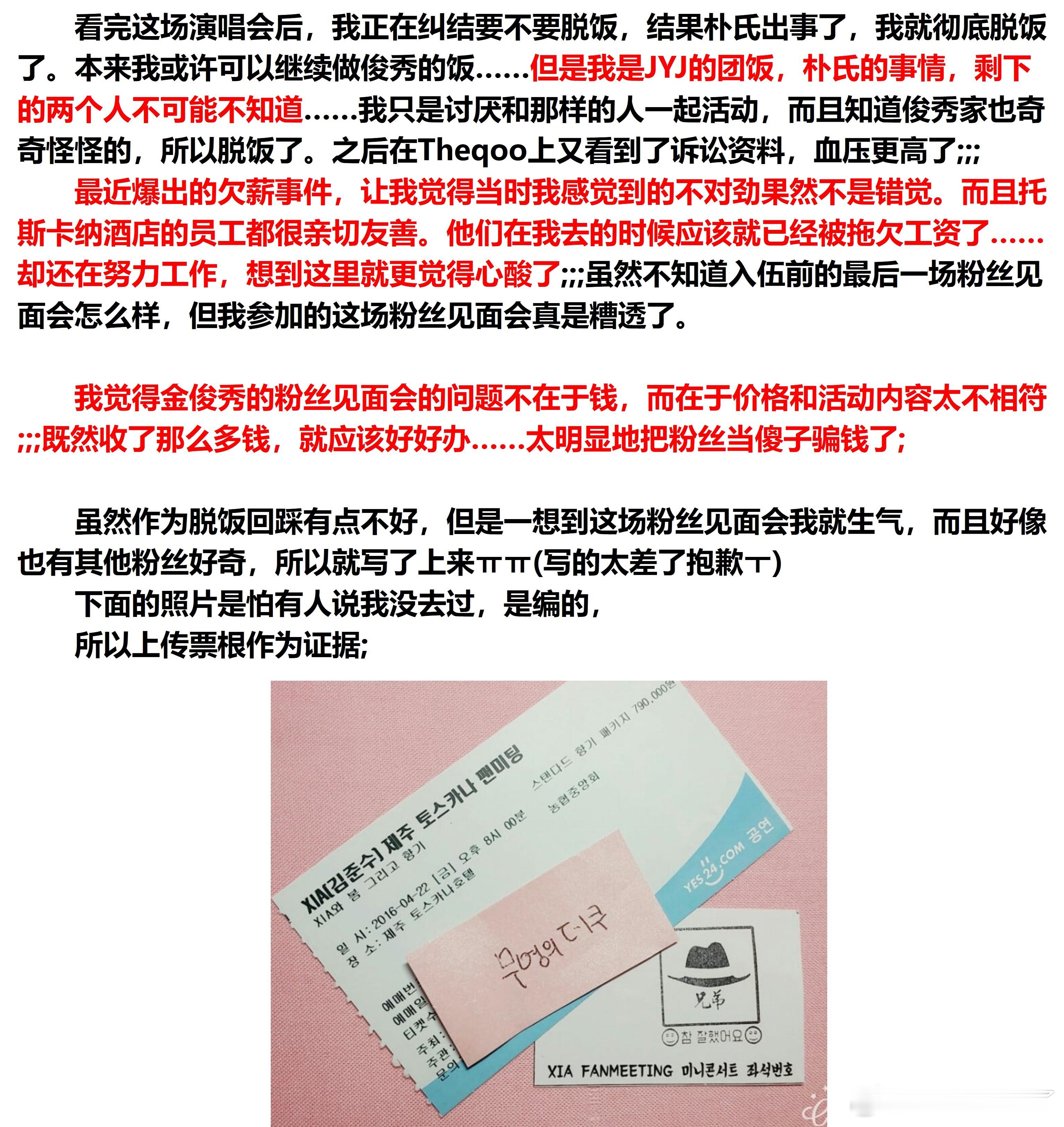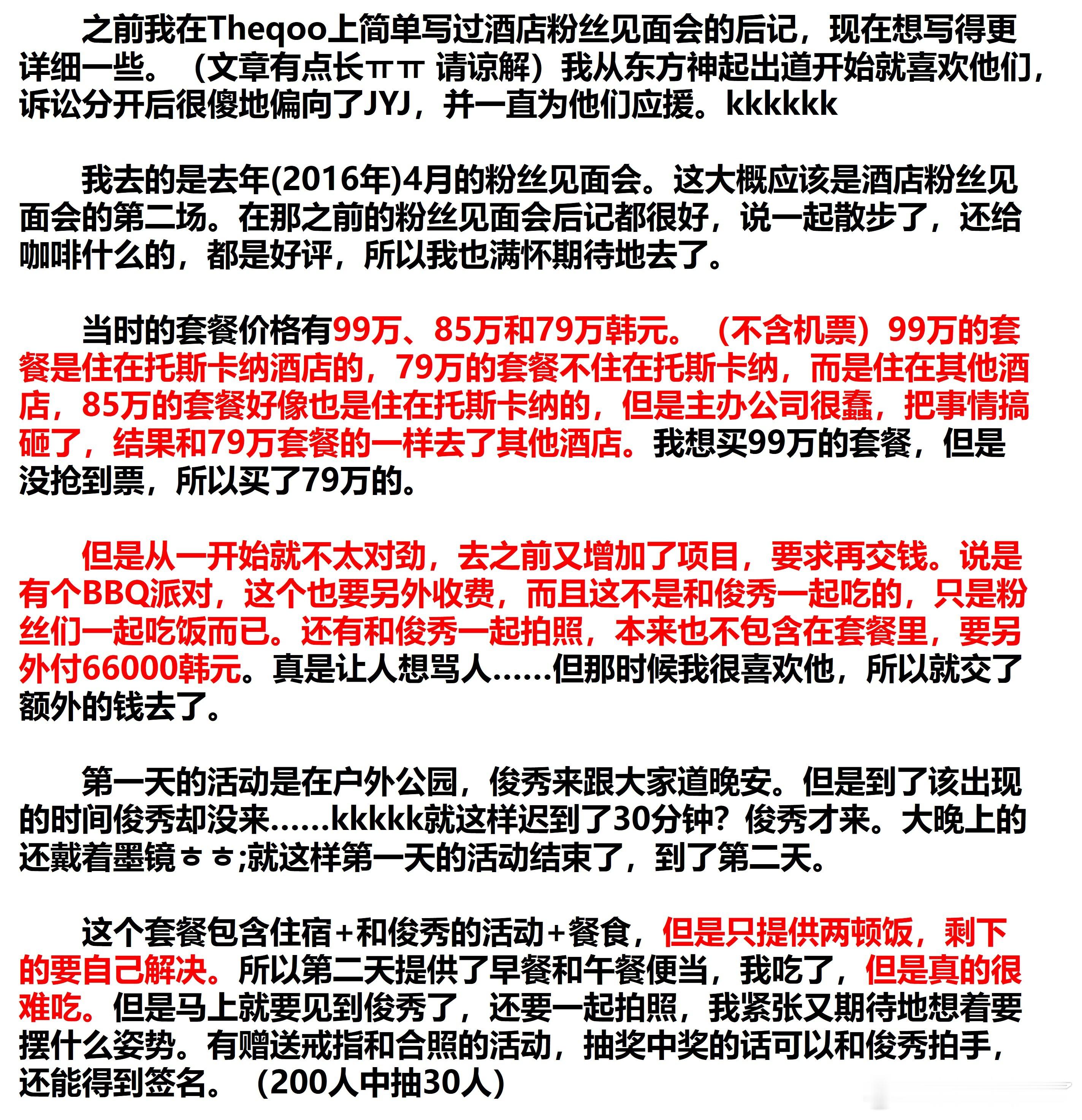图4开始是粉丝脱粉后回忆的16年粉丝见面会长文,只见到金俊秀本人不到3小时,全程态度敷衍,只提供早午餐,晚餐自己解决,还有很多需要临时额外付费的项目