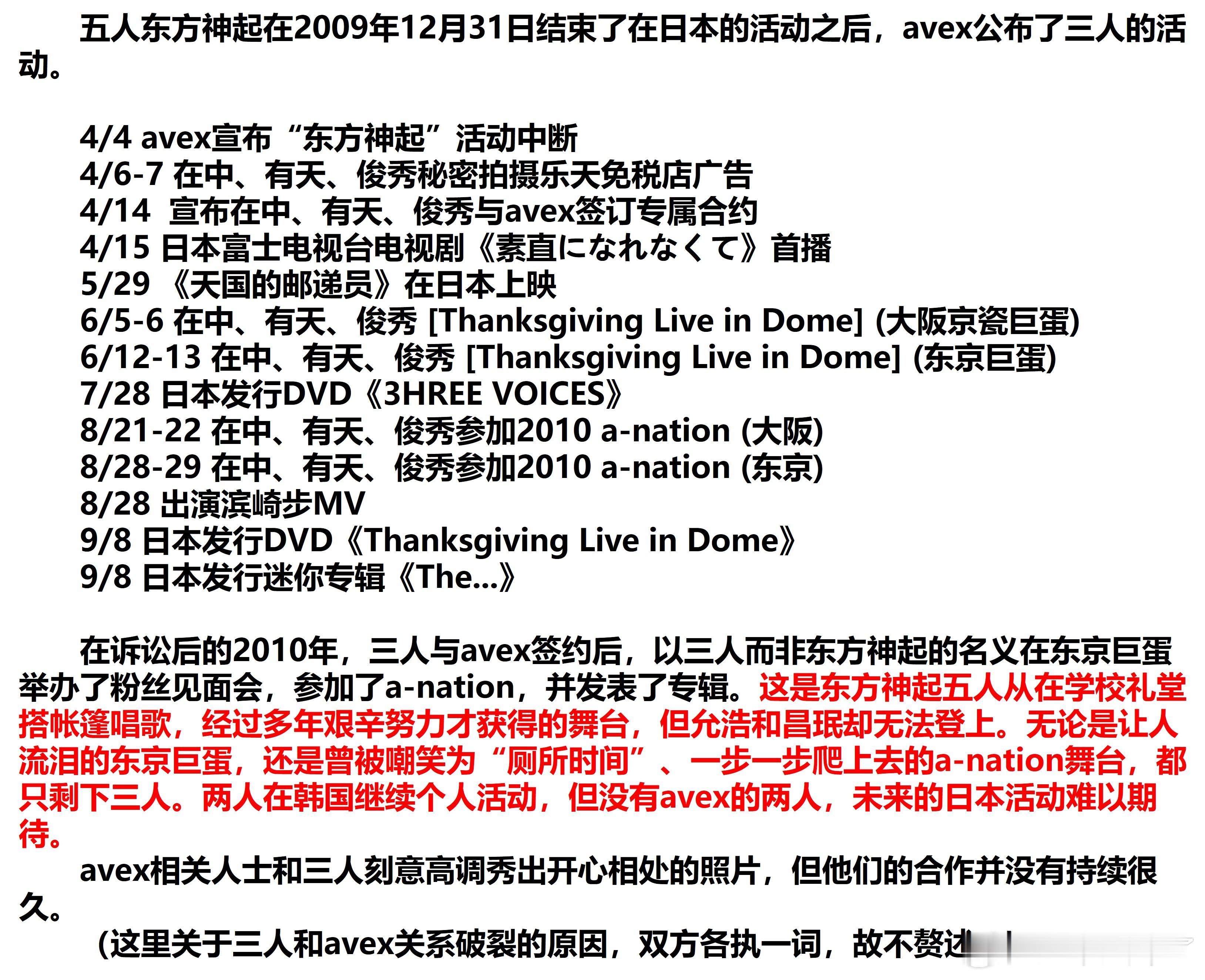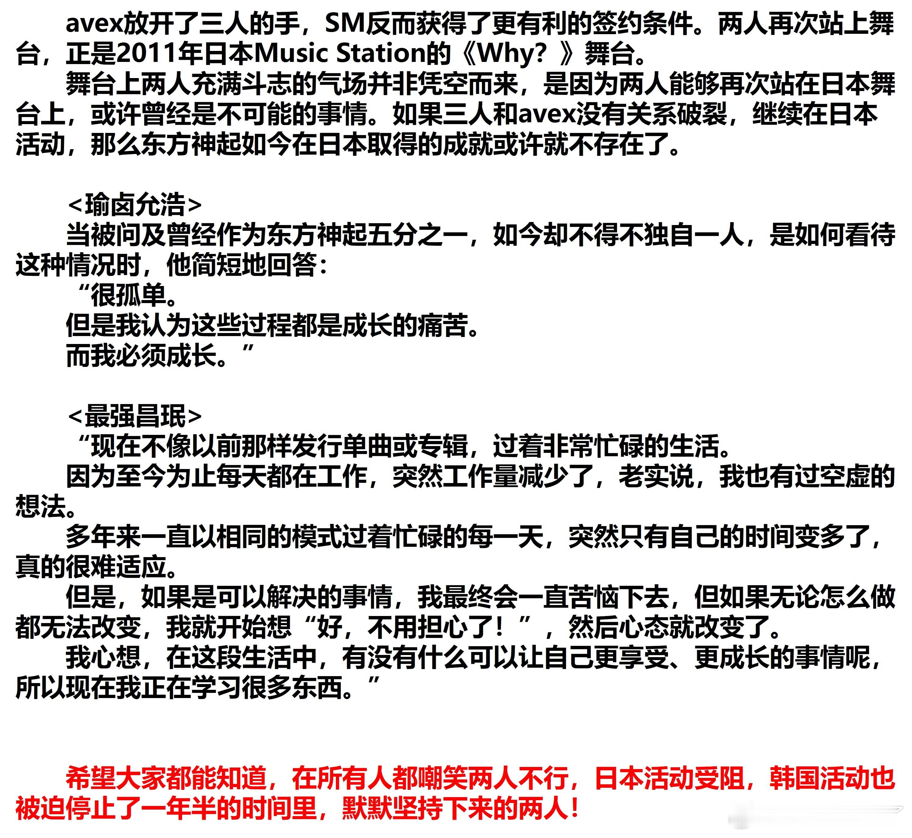 原贴主说因为JYJ三人和AVEX的签约,允浩昌珉要在日本表演需要三人的同意,东方神起五人从在学校礼堂搭帐篷唱歌经过多年艰辛努力才获得的舞台,但二人转却登不上去。后来JYJ三人和AVEX闹翻,二人转才能在日本表演