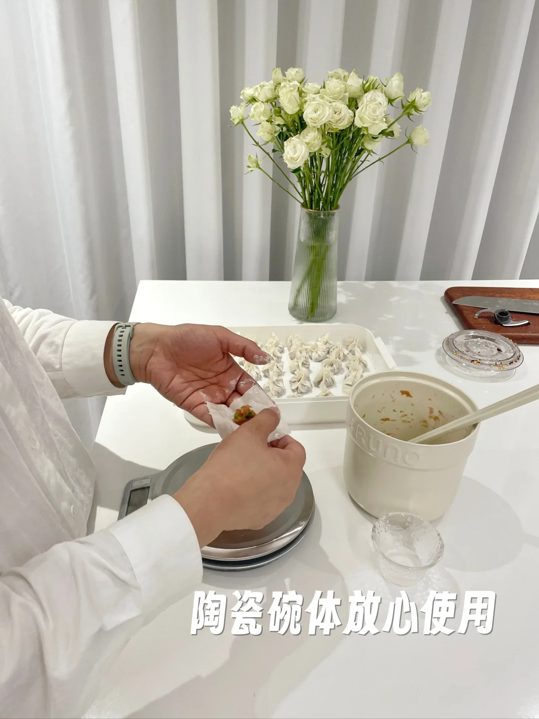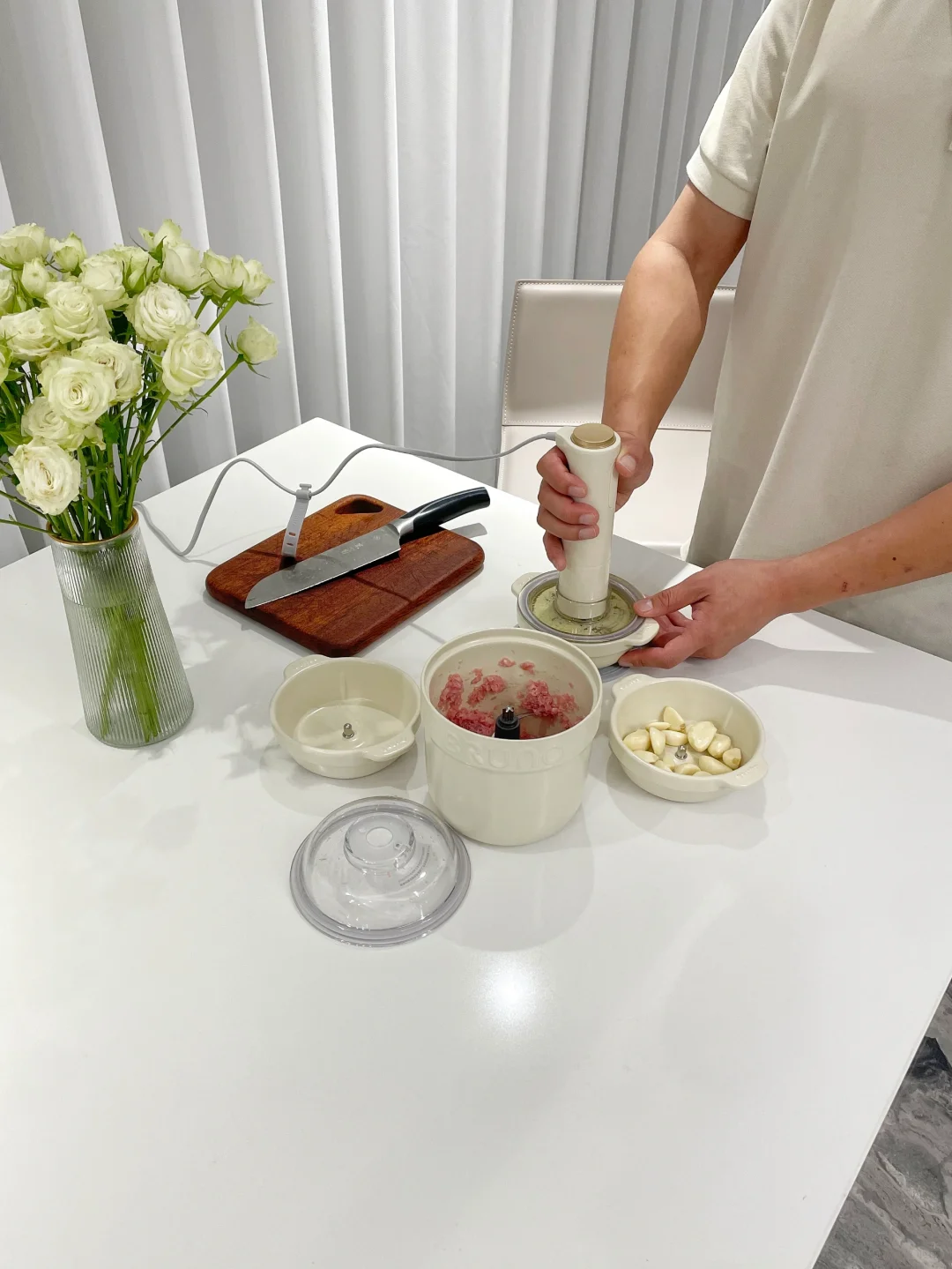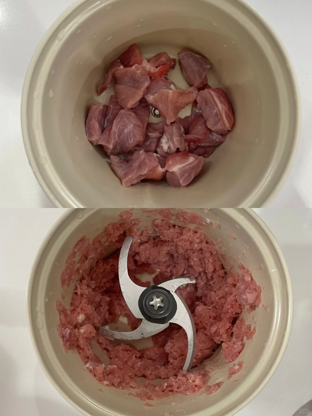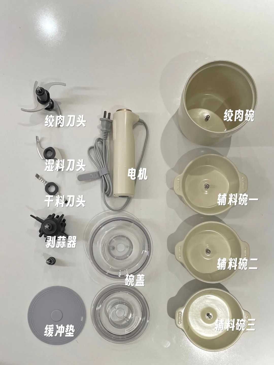 双11购入的佐料机已送达家中。 拆箱后,我着实被惊艳到了。奶白色的陶瓷碗体搭配极简设计的电机,整体质感十足。 收纳起来十分小巧,放在边柜上刚刚好。 人体工学手柄设计,使用起来极为顺手。300W大功率电机,绞肉只需几秒钟。 它自带4个碗和3个刀头,既可打肉也可打辅料,分开使用避免串味。 陶瓷碗不仅可直接用作味碟,打好的辅食还能直接放入蒸锅,用完后直接丢进洗碗机,彻底解放双手。 老婆又夸我东西买得好!😃