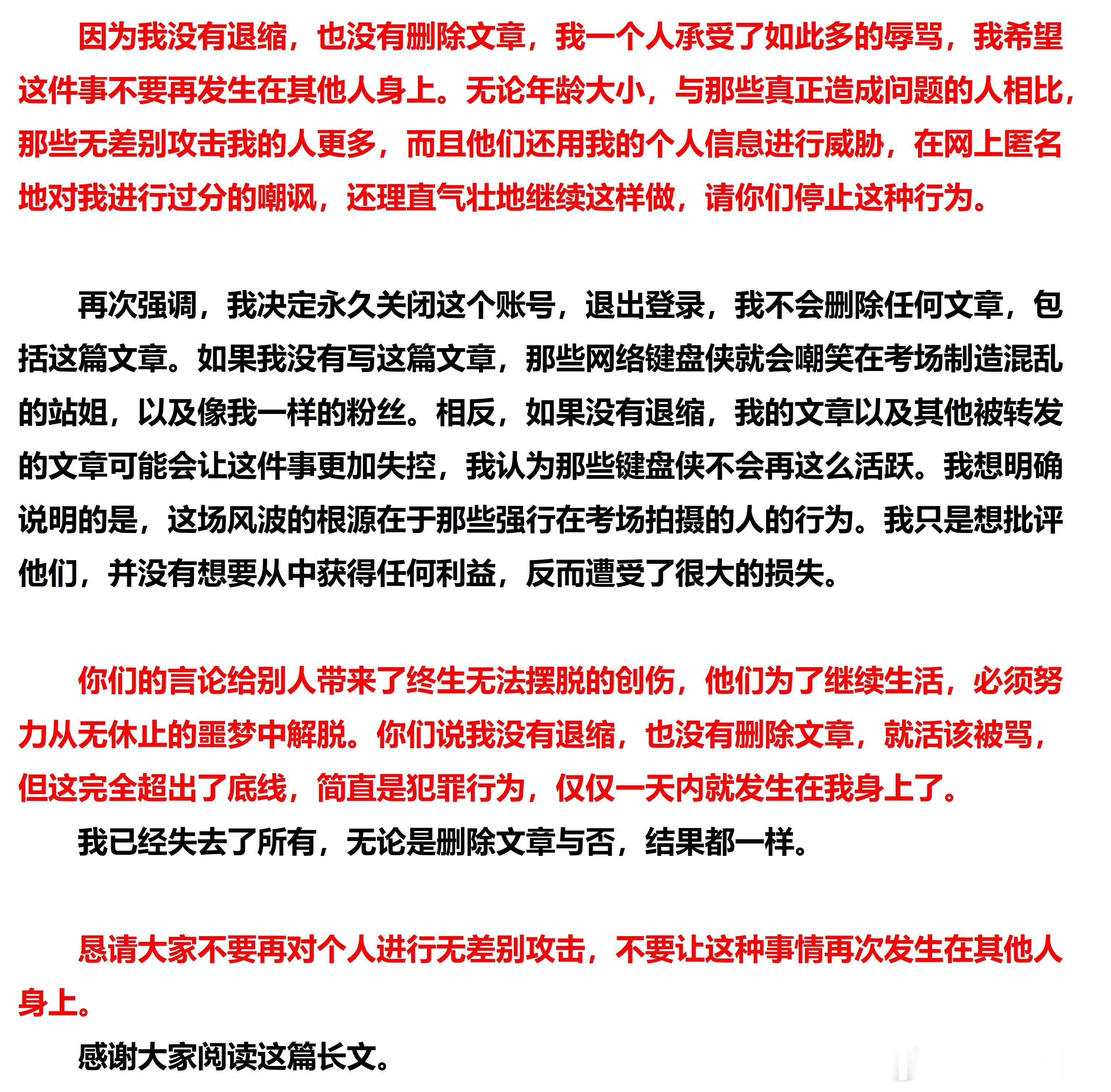一位理智粉指出了粉丝扰乱高考考场行为不妥,反而被部分粉丝攻击(图1-图3),个人信息被公开,电话私信骚扰[摊手],看到自己喜欢的爱豆出现在首页反而会害怕,最终决定不再用现有账号,发布长文(图4-图6),还是说自己没有做错,是去考场的私生和站姐有问题,希望以后不要有其他人再遭遇这种事了。