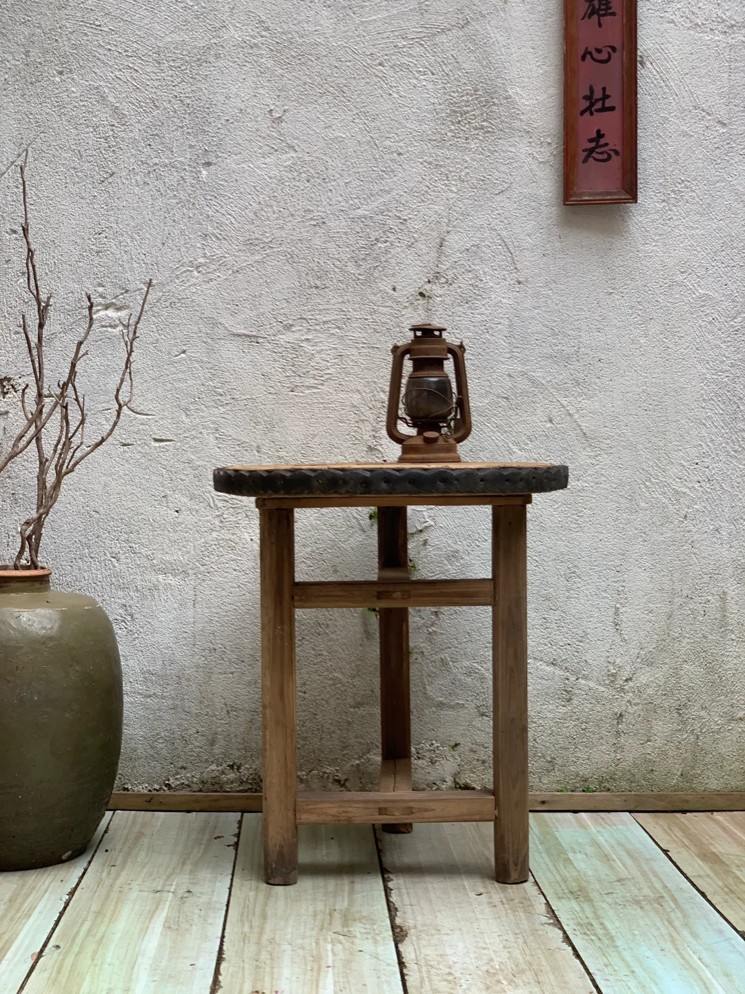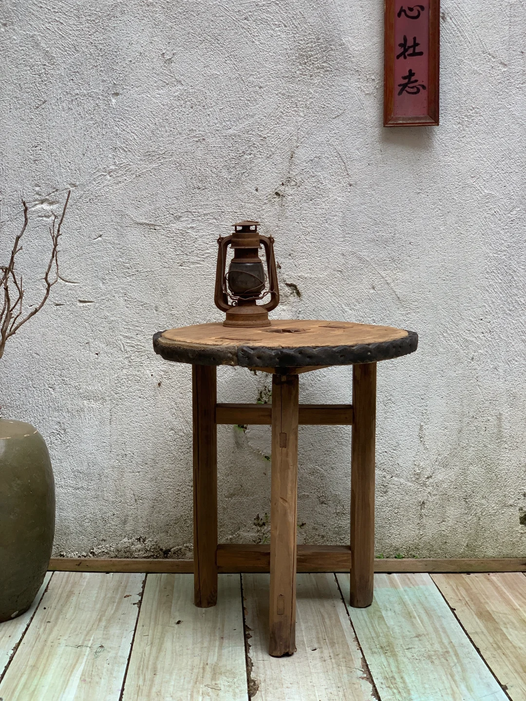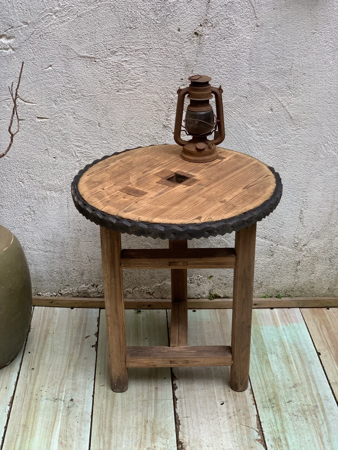 原木小圆桌;民宿、书房、茶室极简侘寂中古软装家具;摄影造景道具;58*58*66厘米高。老木轮改的桌面,三角木架,坚固厚重,正常使用。