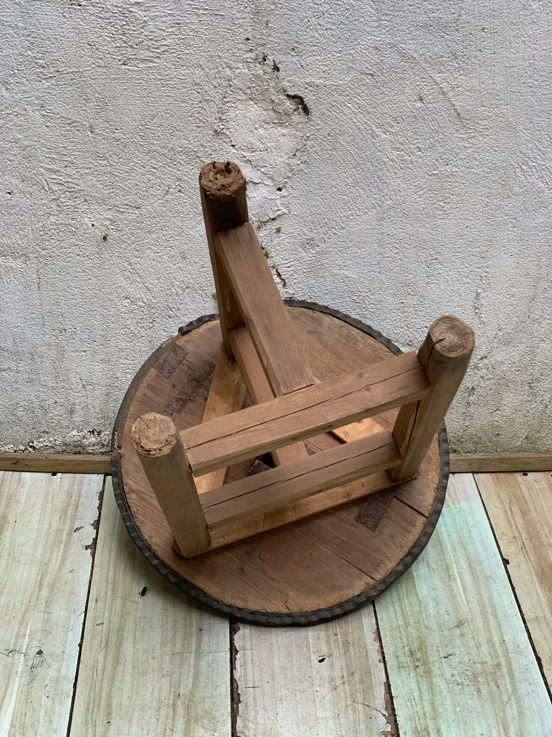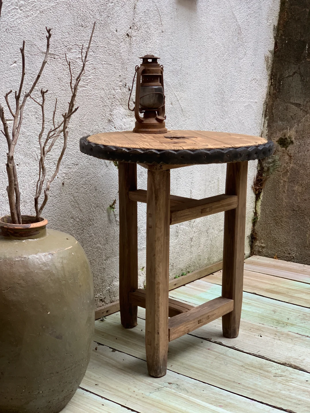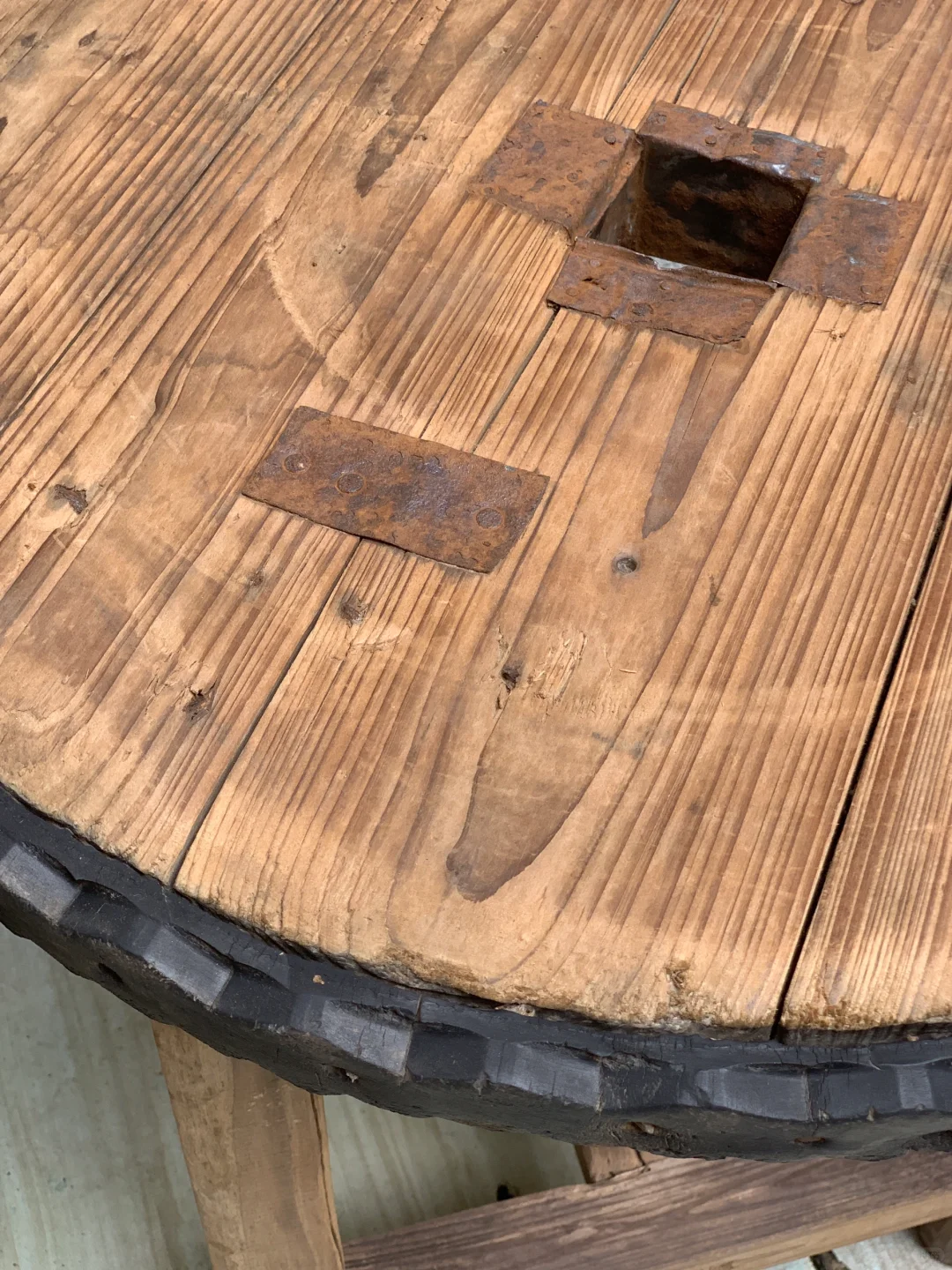 原木小圆桌;民宿、书房、茶室极简侘寂中古软装家具;摄影造景道具;58*58*66厘米高。老木轮改的桌面,三角木架,坚固厚重,正常使用。