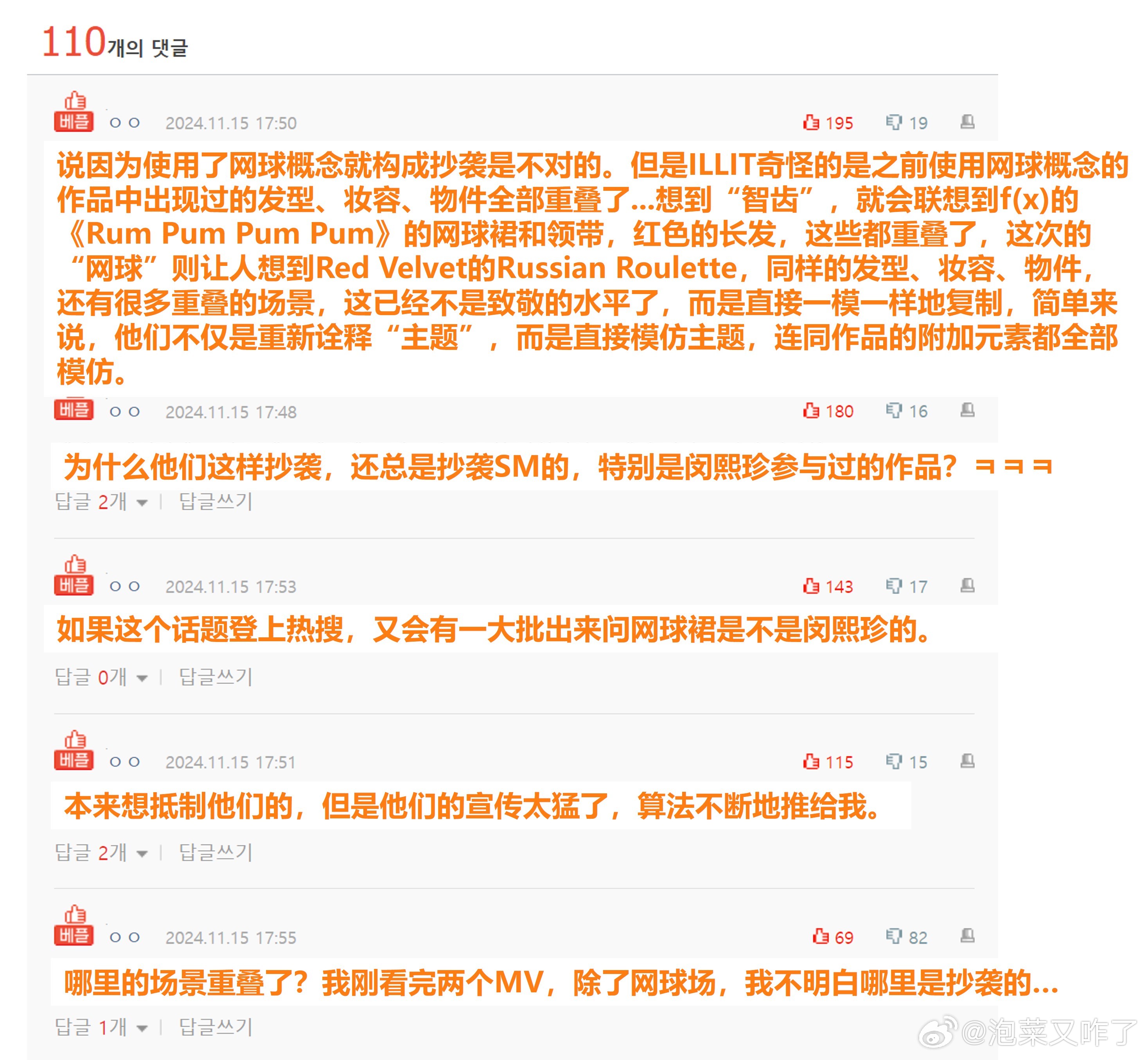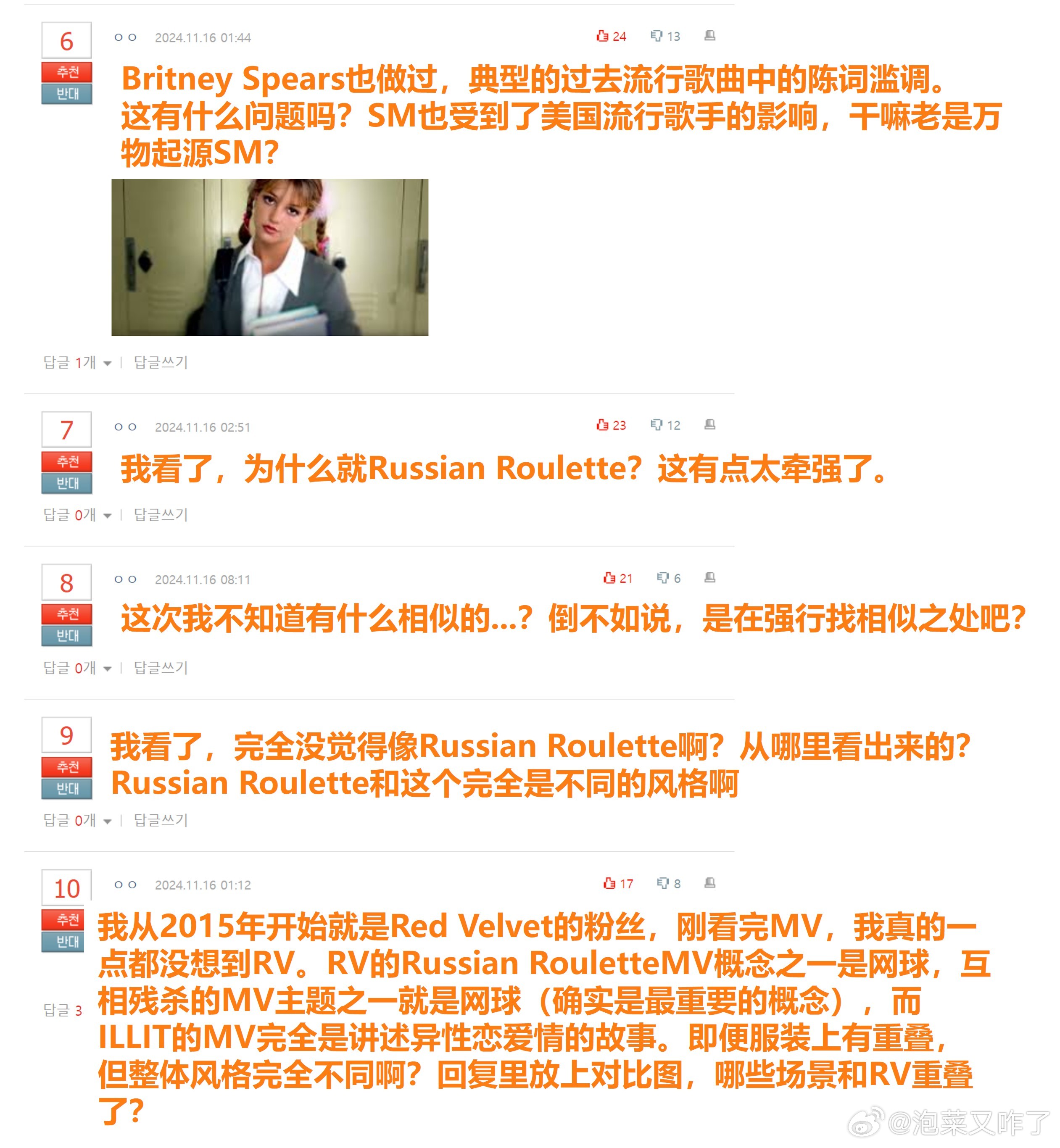 原楼主放出图2-图4的图,说ILLIT或者是创意总监许世莲为什么老是抄袭闵熙珍在SM里的作品,这次Tick-Tack 的MV出来了,和Red Velvet的Russian Roulette简直一模一样,Minju直接复制了涩琪,Iroha直接复制了艾琳,Moka复制了Yeri