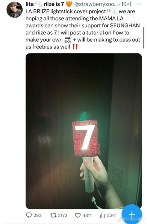 也有人预告要去美国MAMA高喊“RIIZE is 7”,还有要搞应援的但是没有资助,决定在其它应援棒上贴上数字7(图4、图5,甚至可能完全不是RIIZE粉丝)。