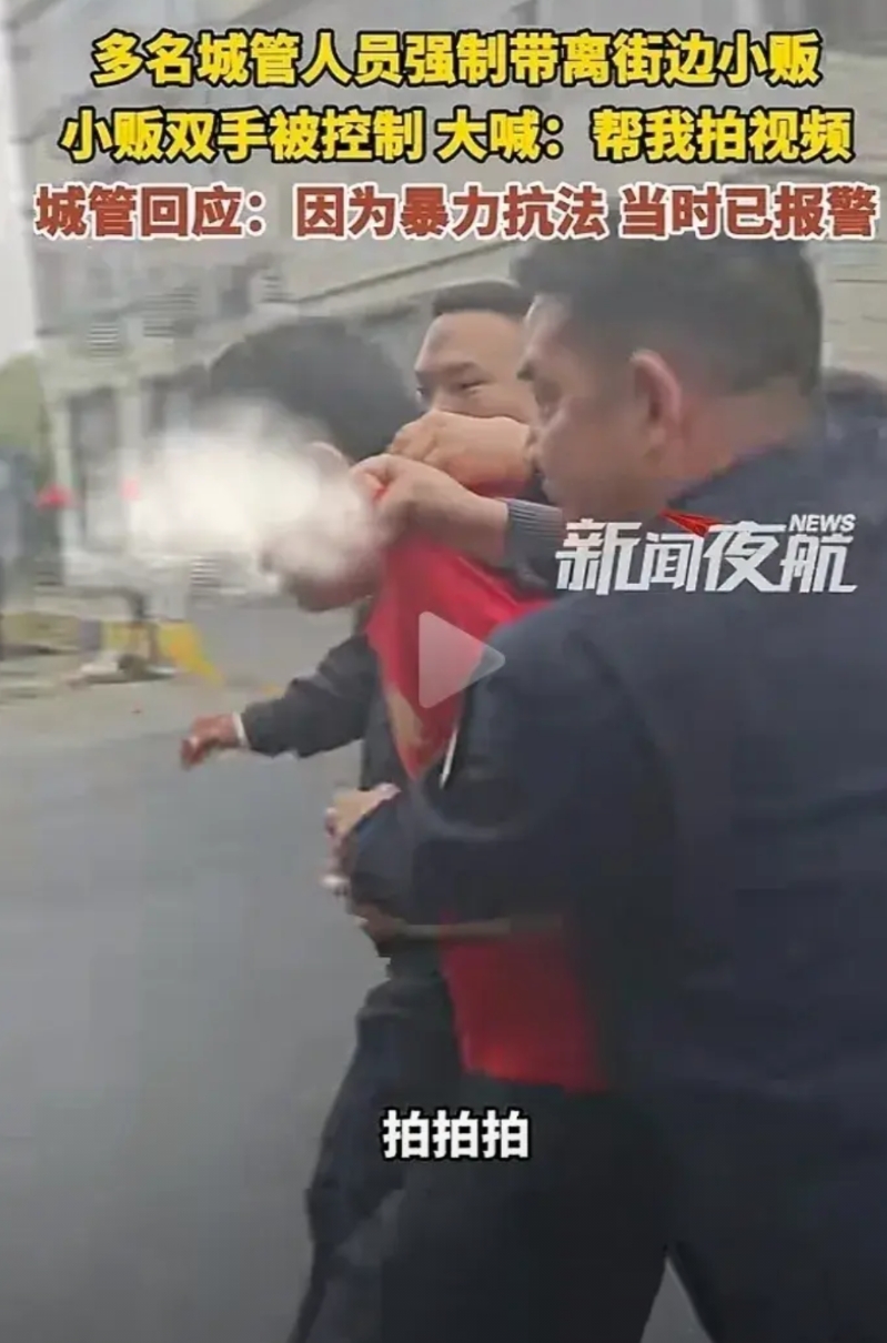 从现场来看,摊贩的手被城管执法人员牢牢控制住,他的反抗显得那么苍白无力。