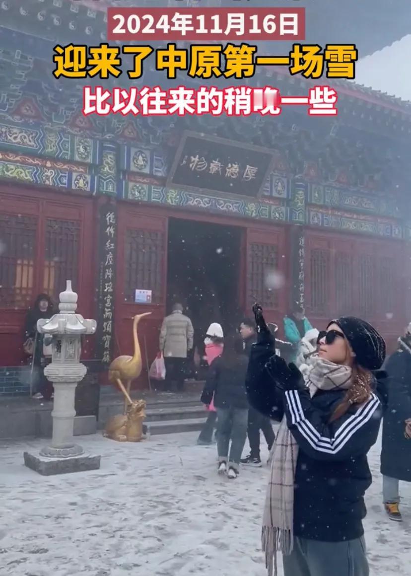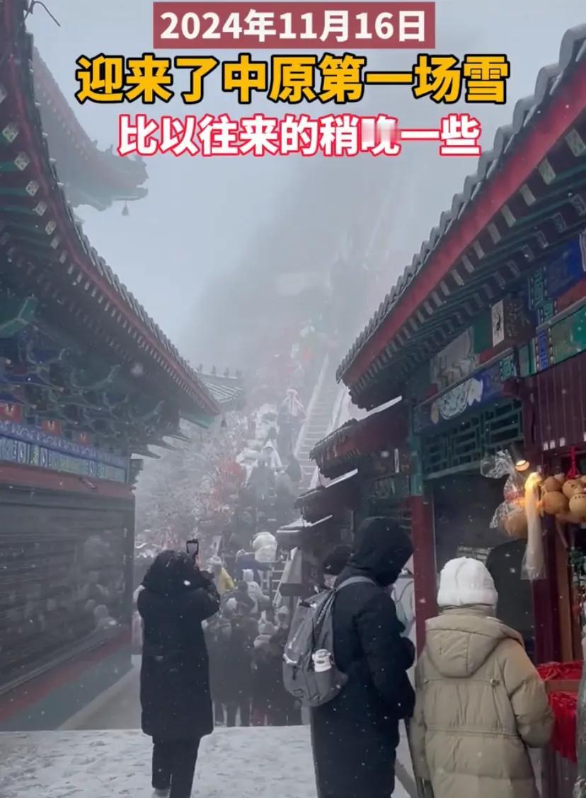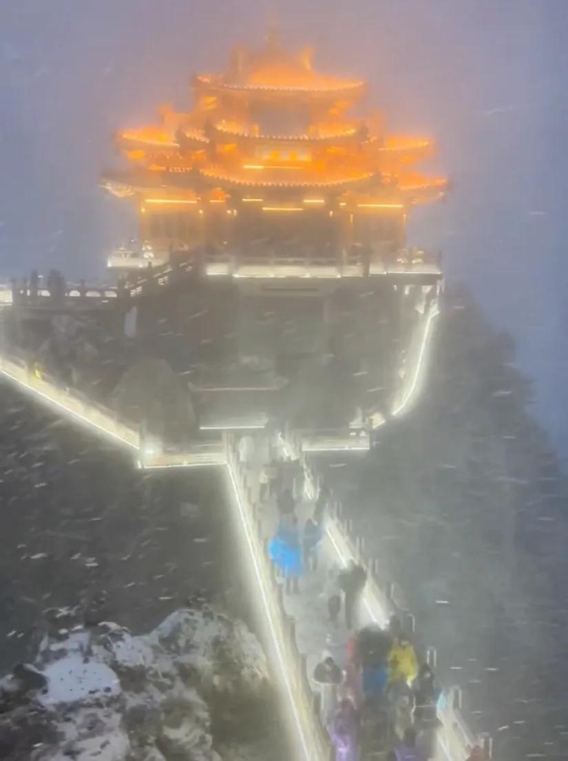 刚刚河南老君山下雪了 银装素裹,虽然气温降到了零度, 但是不少游客还是冒着风雪
