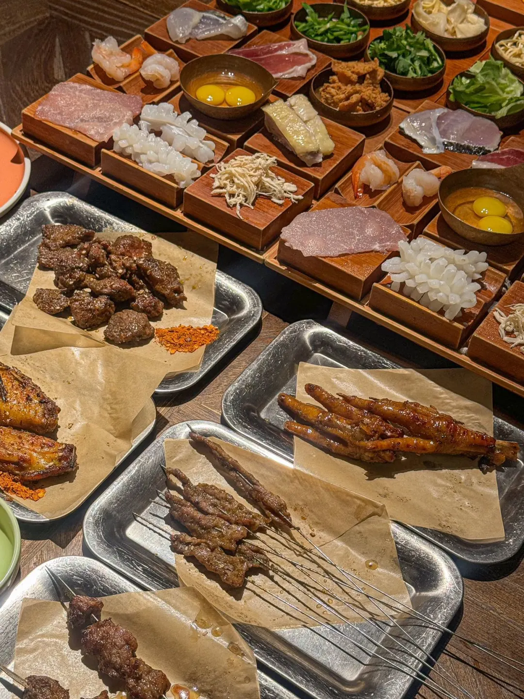 一家超有氛围好的云南米粉。 店内环境很chill~晚上来嗦粉🍜顺便还可以小酌一杯噢~ 九宫格的小料,仪式感十足。 金黄滚烫的高汤,加入爽滑的米线,真的是鲜啊! 不够记得可以免费续。 当然云南特色卤烤也1️⃣定要点。 卤烤鸡爪,糯唧唧的,满满胶原蛋白。 炭烤小黄牛粒,一口一块,肉感扎实有嚼劲。