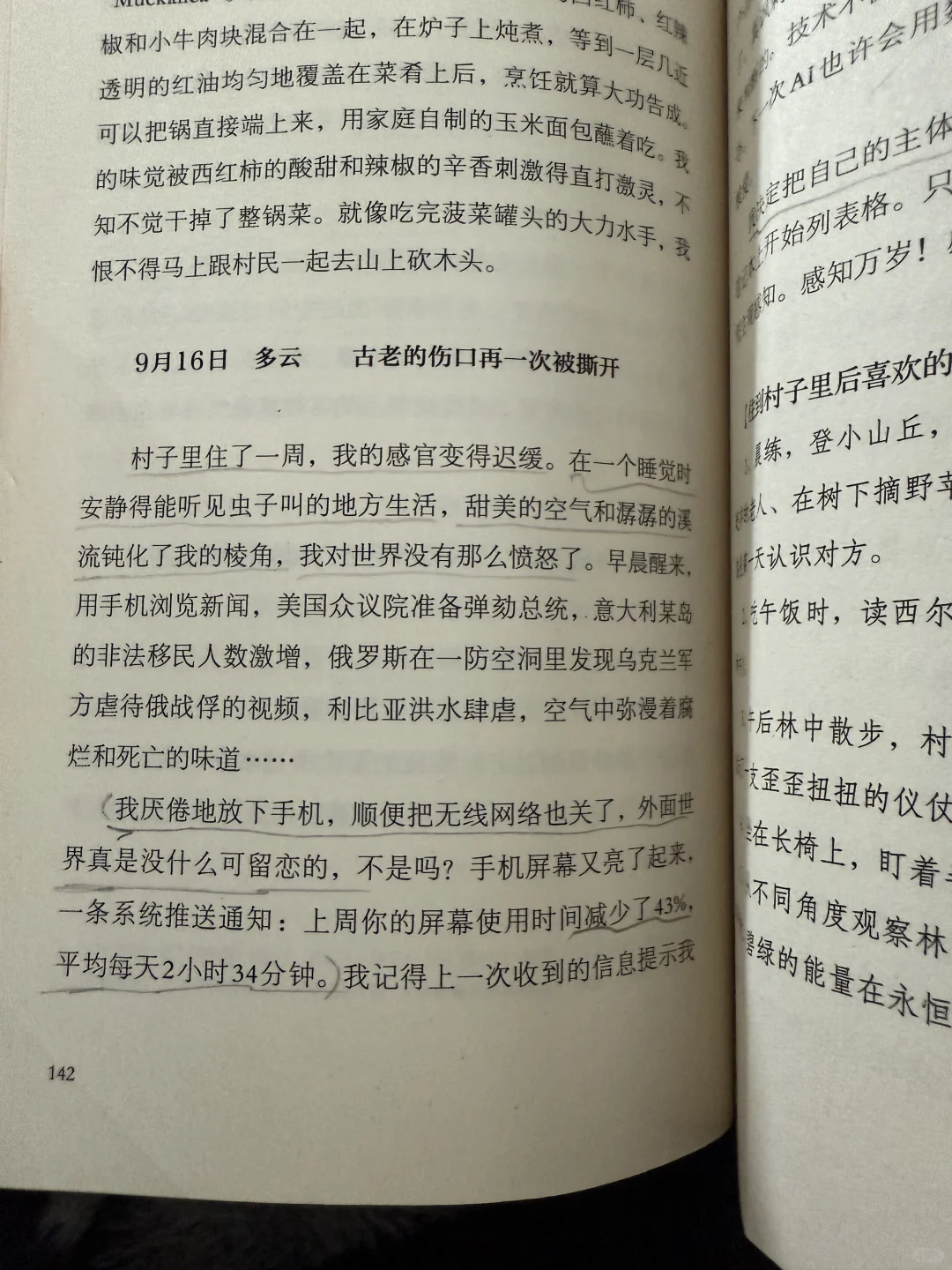 读书读到:“村子里住了一周,我的感官变得迟缓。在一个睡觉时安静得能听见虫子叫的地方生活,甜美的空气和潺潺的要流钝化了我的楼角,我对世界没有那么愤怒了。