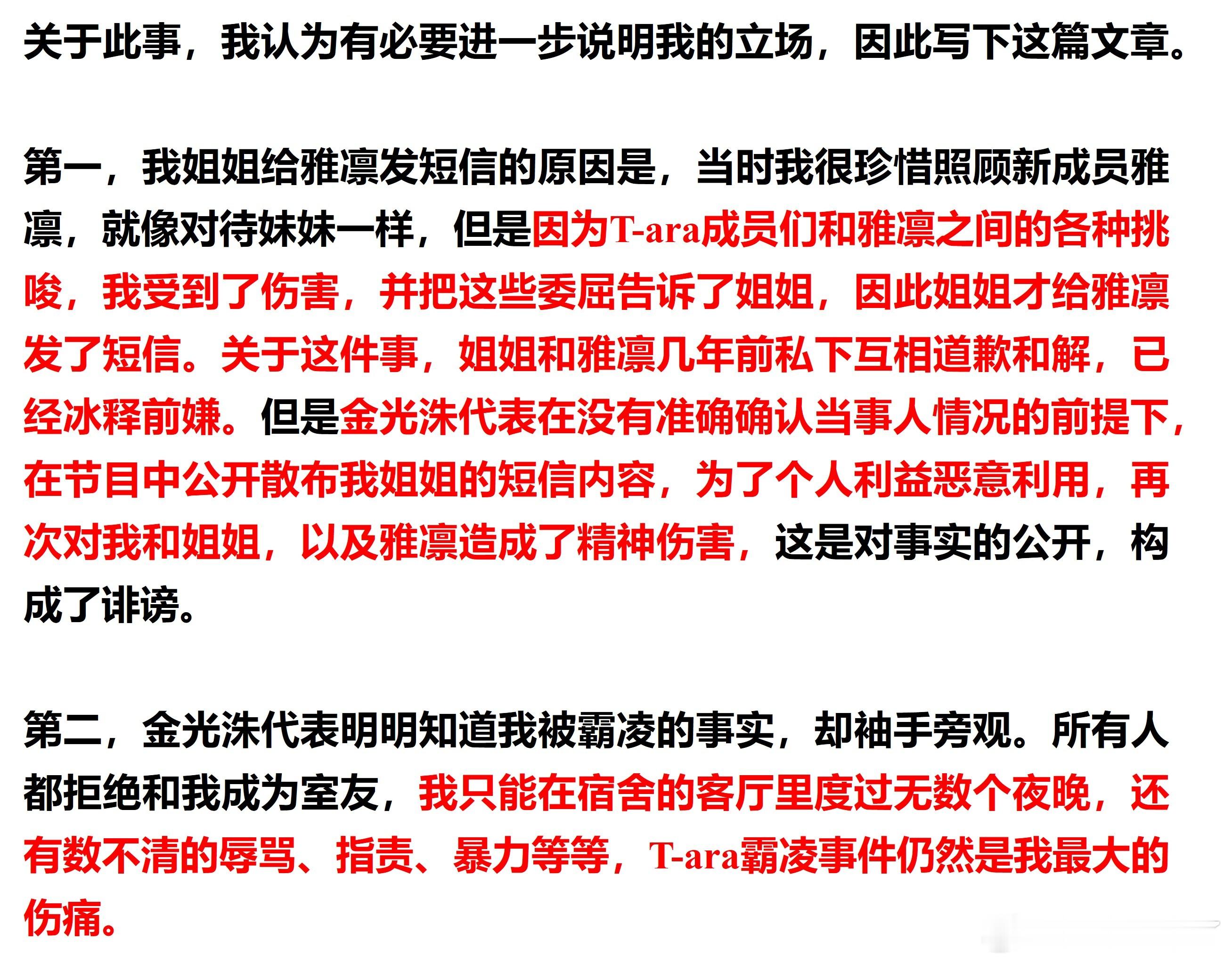 1,雅凛短信:自己疼爱雅凛却因为成员挑唆,我受到了伤害,并把这些委屈告诉了姐姐,因此姐姐才给雅凛发了短信。关于这件事,姐姐和雅凛几年前私下互相道歉和解,已经冰释前嫌。