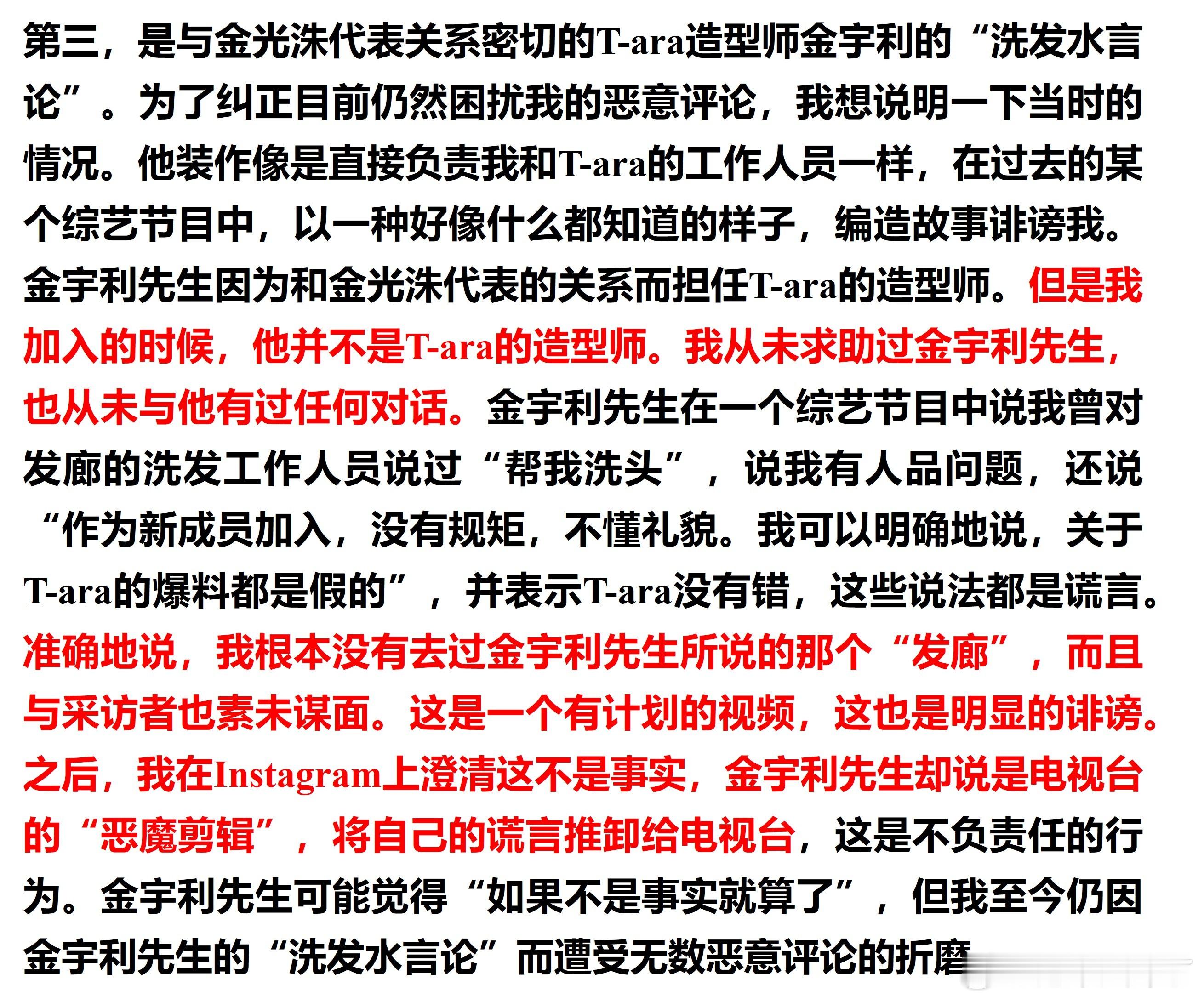 3,“洗发水言论”:自己加入的时候,他并不是T-ara的造型师,也根本没有去过金宇利先生所说的那个“发廊”,Instagram上澄清侯对方却把责任推卸给电视台