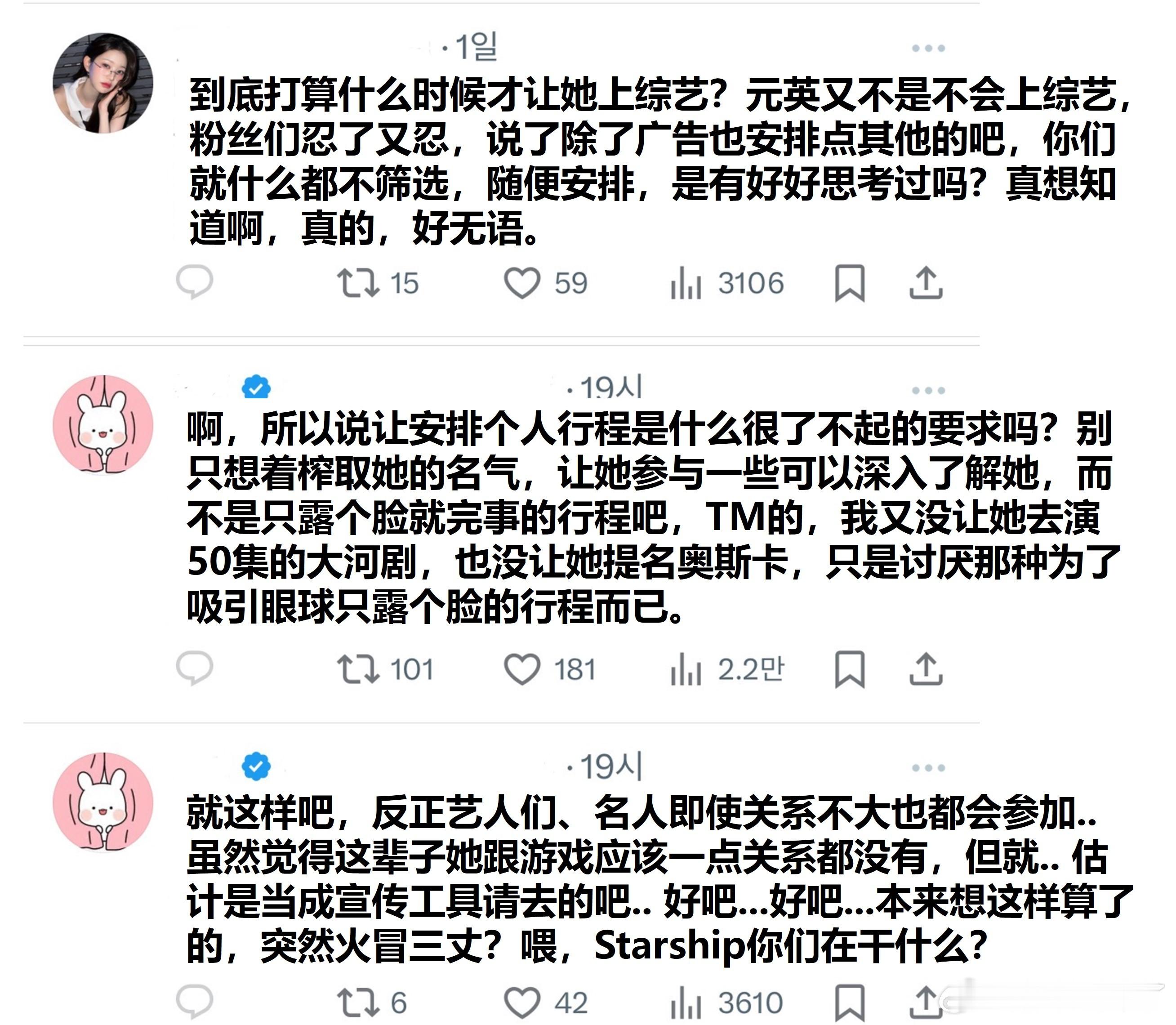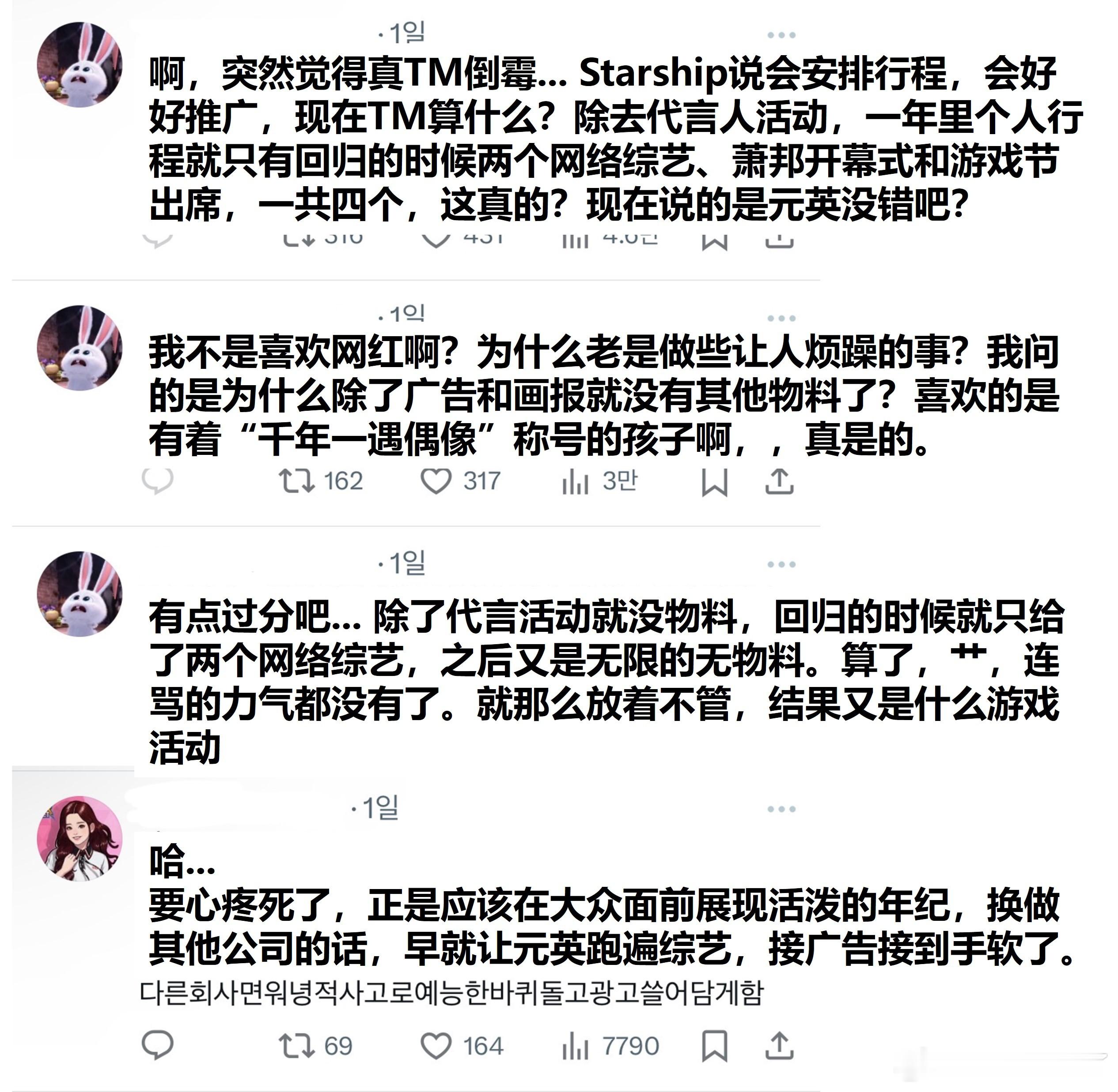 因为只有张元英今年个人活动很少,只有广告画报,推上大粉很不满,觉得starship对元英放任不管,活动太少以至于为了形象管理的说法也不合适,现在搞得元英像个网红