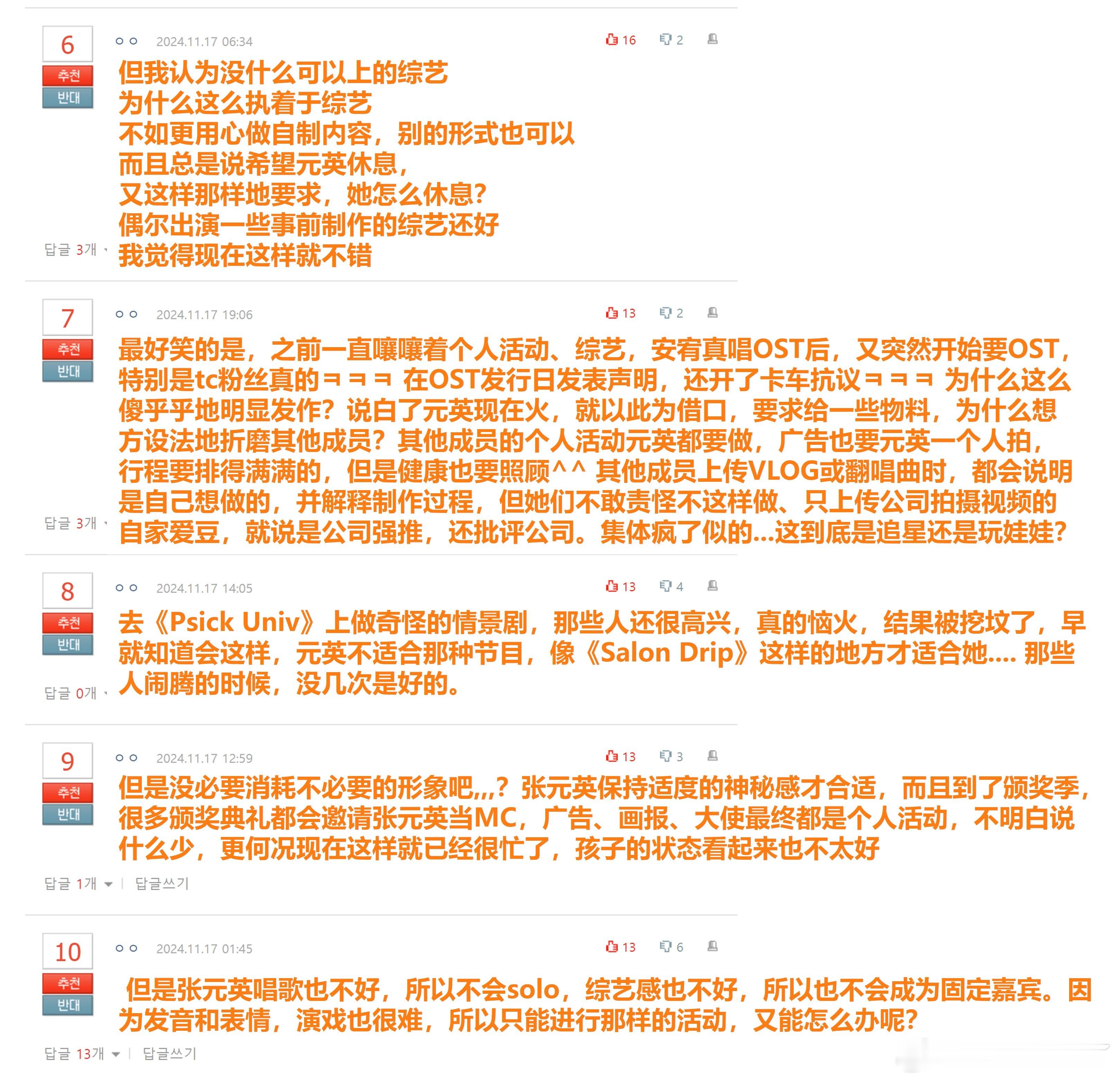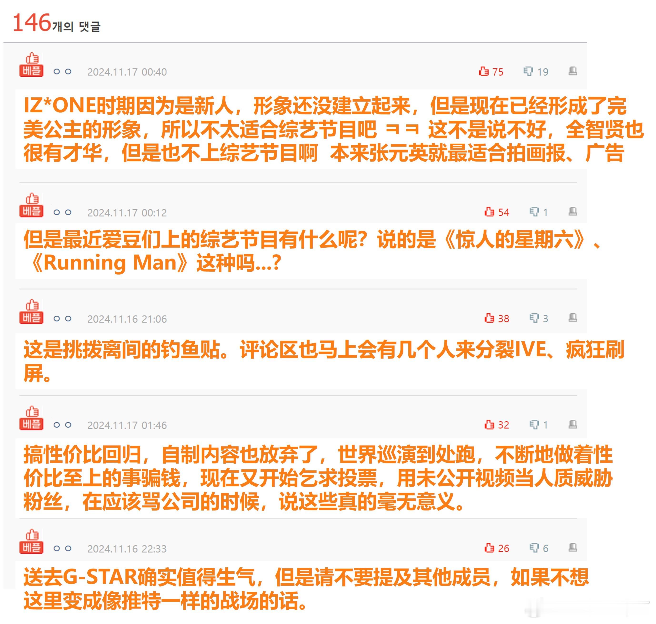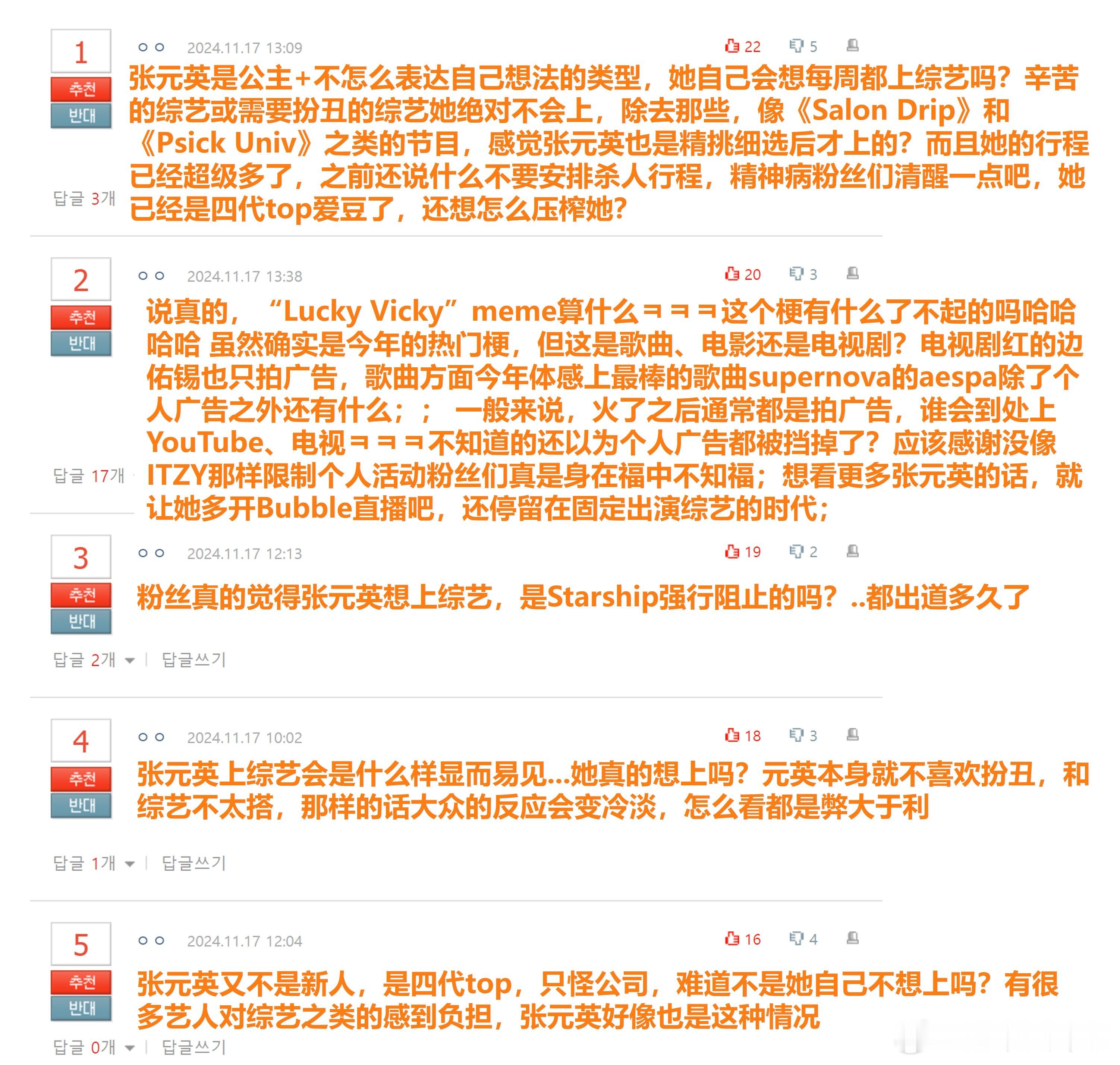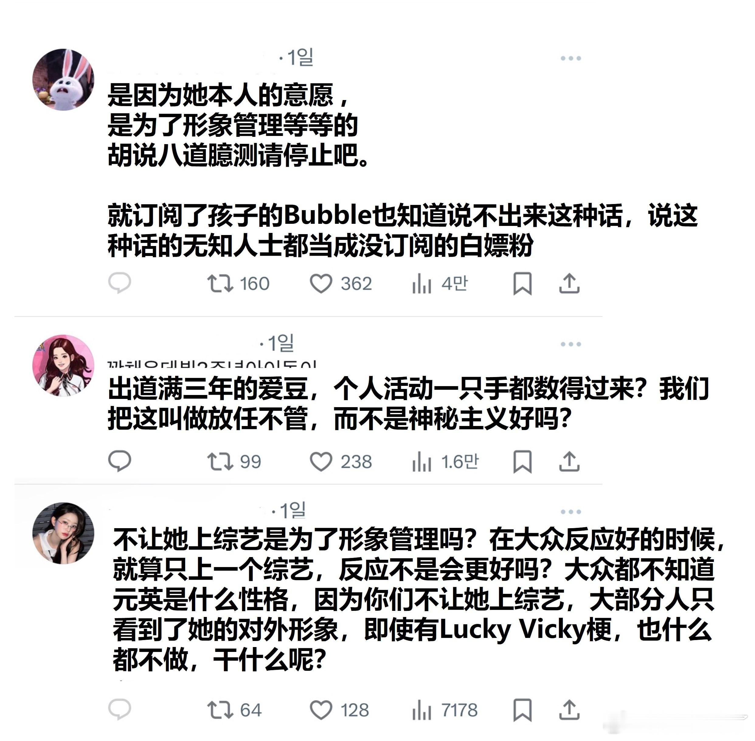 热评大部分表示元英就适合走偏神秘一点的路线,不适合估计也不愿意去参加综艺,适合拍广告画报这些 + 元英都是四代TOP爱豆了,还认为是starship不想让她参加这些活动吗,是本人的意愿