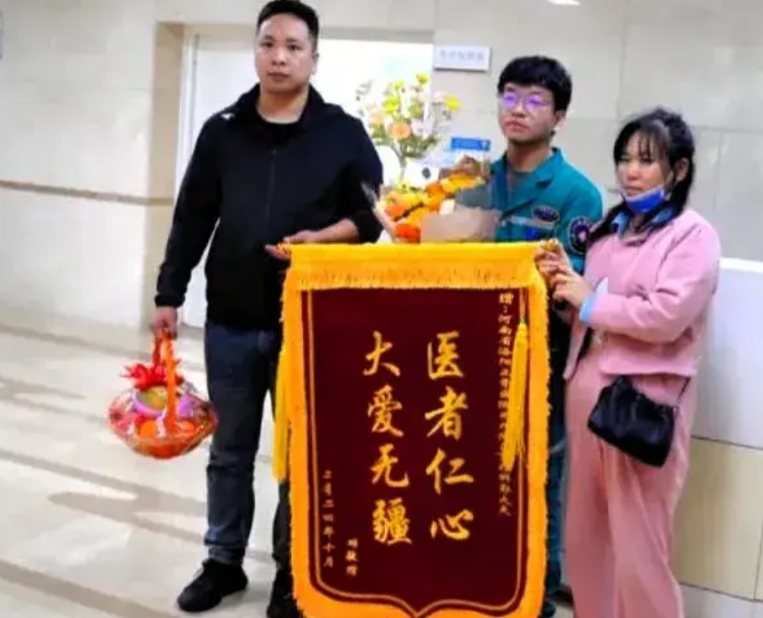 妻子手里捧着一面锦旗,上面写着“医者仁心,大爱无疆”。