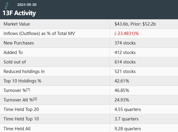 最新数据显示,野村Q3持仓总市值为436亿美元,上一季度则为522亿美元,环比下降16.5%。野村在Q3的投资组合中新增了374只标的,增持412只标的,减持521只标的,清仓614只标的;其中前十大持仓标的占总市值的42.61%。