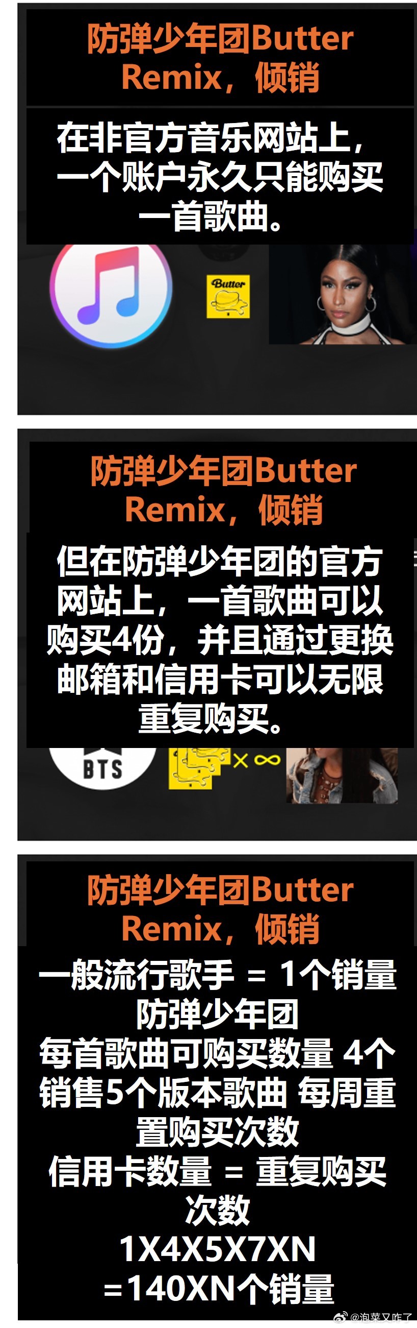3,虽然也有欧美歌手多版本倾销拿到热百第一(但不这样做一般也能2-5位),但所有拿到一位的歌曲都靠这种方式而没有大众基础的歌手,只有防弹,防弹的歌曲没有下载只靠流媒体就不行了,图5最后还总结了这个方法获得的下载销量是140N倍(N是指切换信用卡的次数)