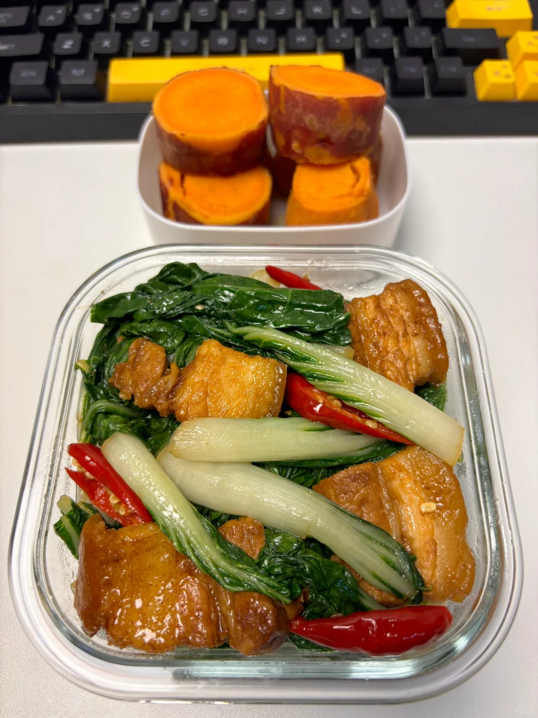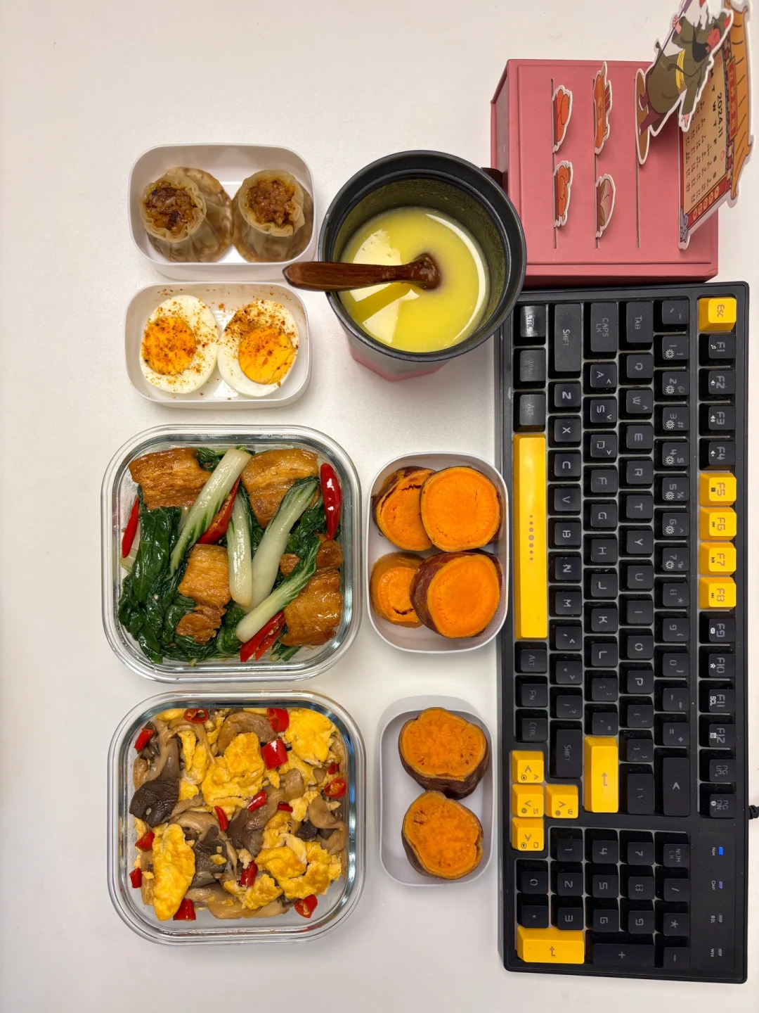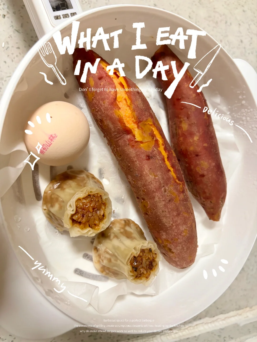 1⃣️早:烧麦、鸡蛋、玉米糊(2.3💰) 2⃣️中:五花肉炒小白菜、红薯(4.7💰) 3⃣️晚:平菇炒鸡蛋、红薯(3.3💰) 猪肉菜市场买的约2💰小米辣自己阳台种的0💰 合计:10.3💰