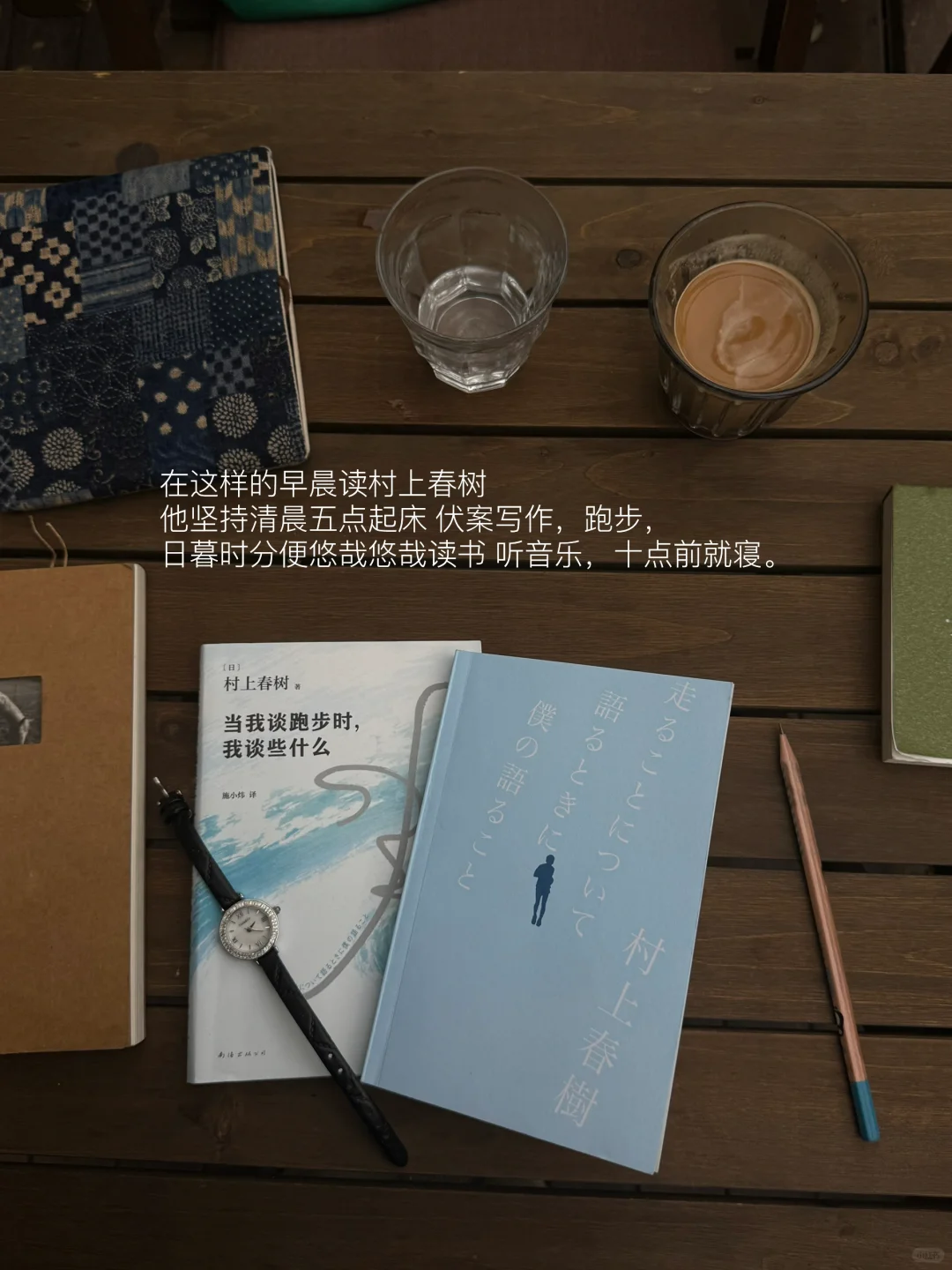 他坚持清晨五点起床 伏案写作,跑步,日暮时分便悠哉悠哉读书 听音乐,十点前就寝。