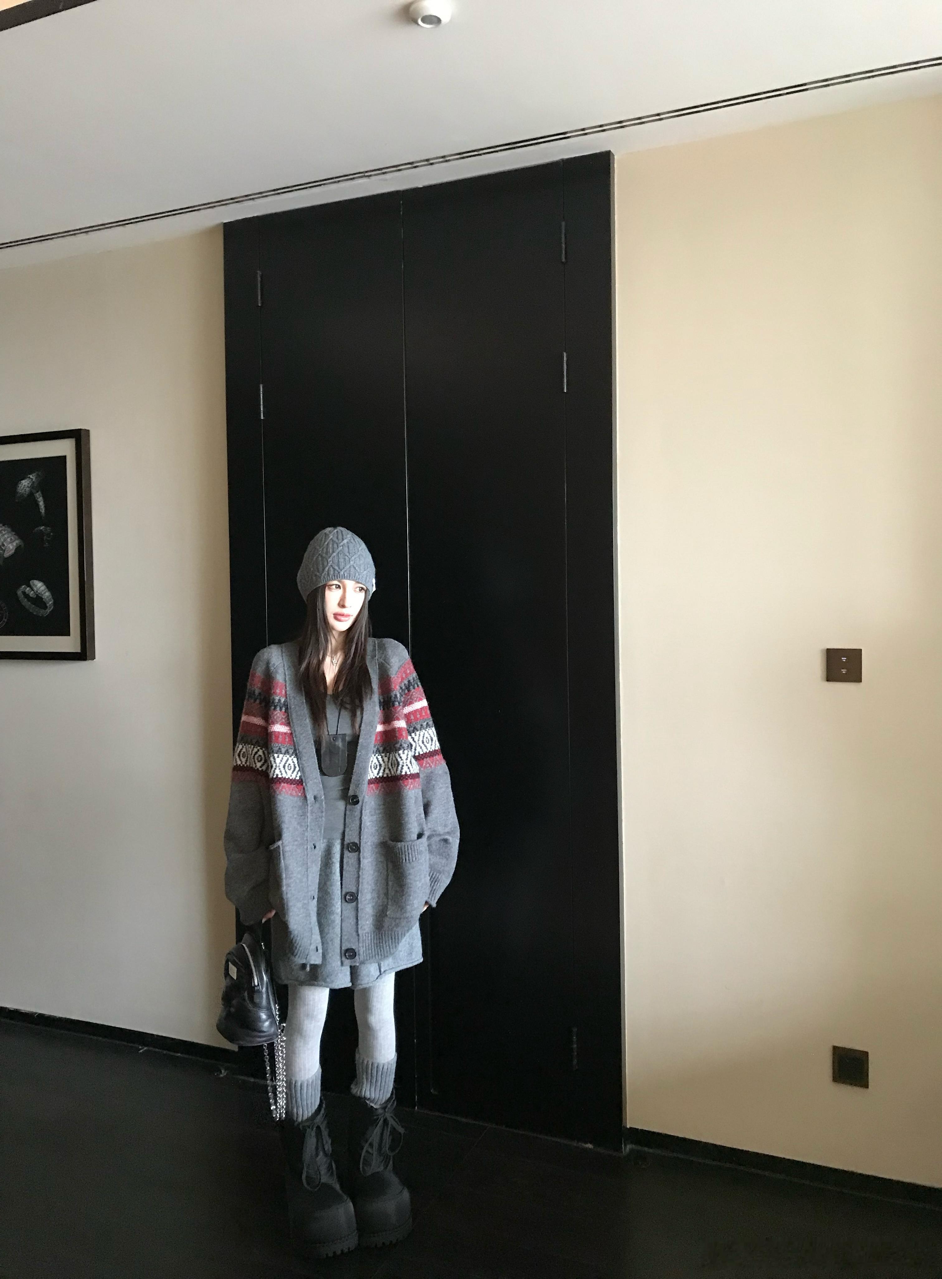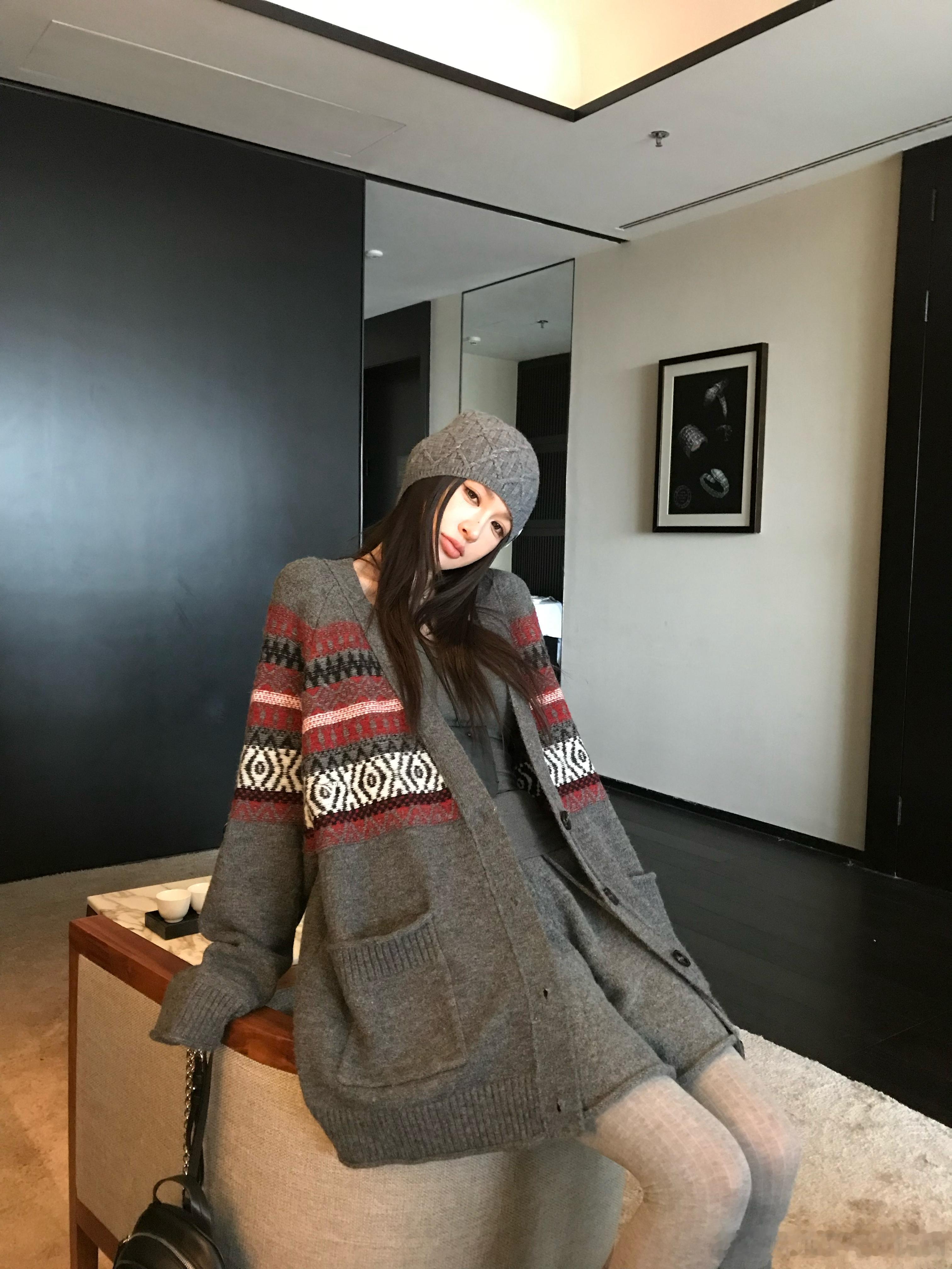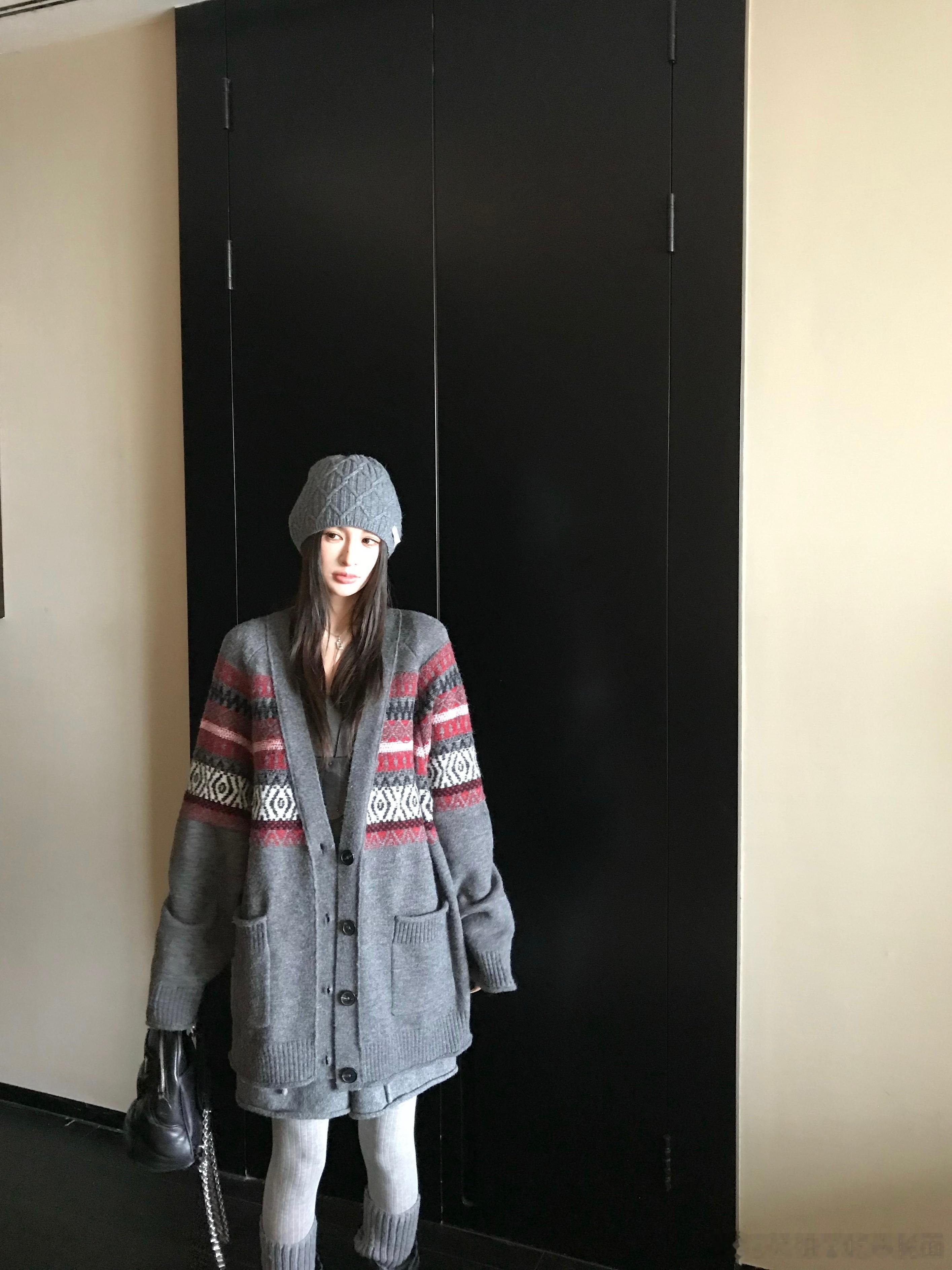 这期钟爱的费尔岛开衫灰红拼色撞色提花圆领开衫 费尔岛图案装饰很有层次感上身效果又