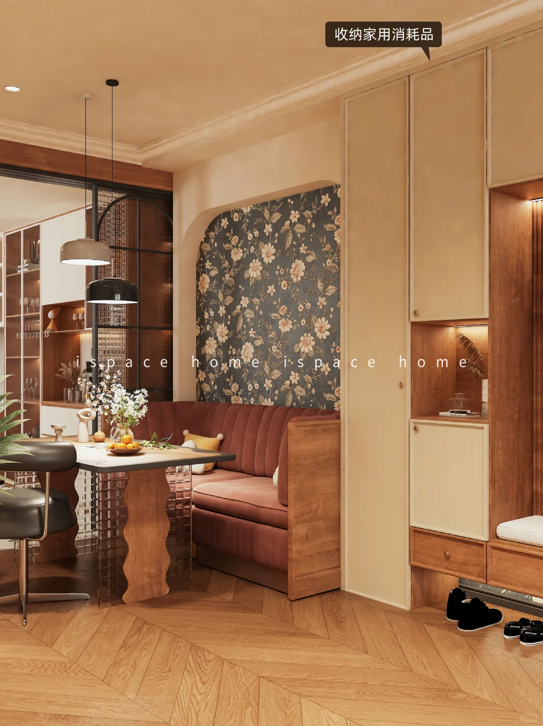 ✨抬高地面并外扩👉弧形地台衣帽间👔设置隐形门可通向主卧,换好衣服👗轻松入睡💤衣帽间安装拐角柜,不放过任何收纳空间,收纳力度Max!