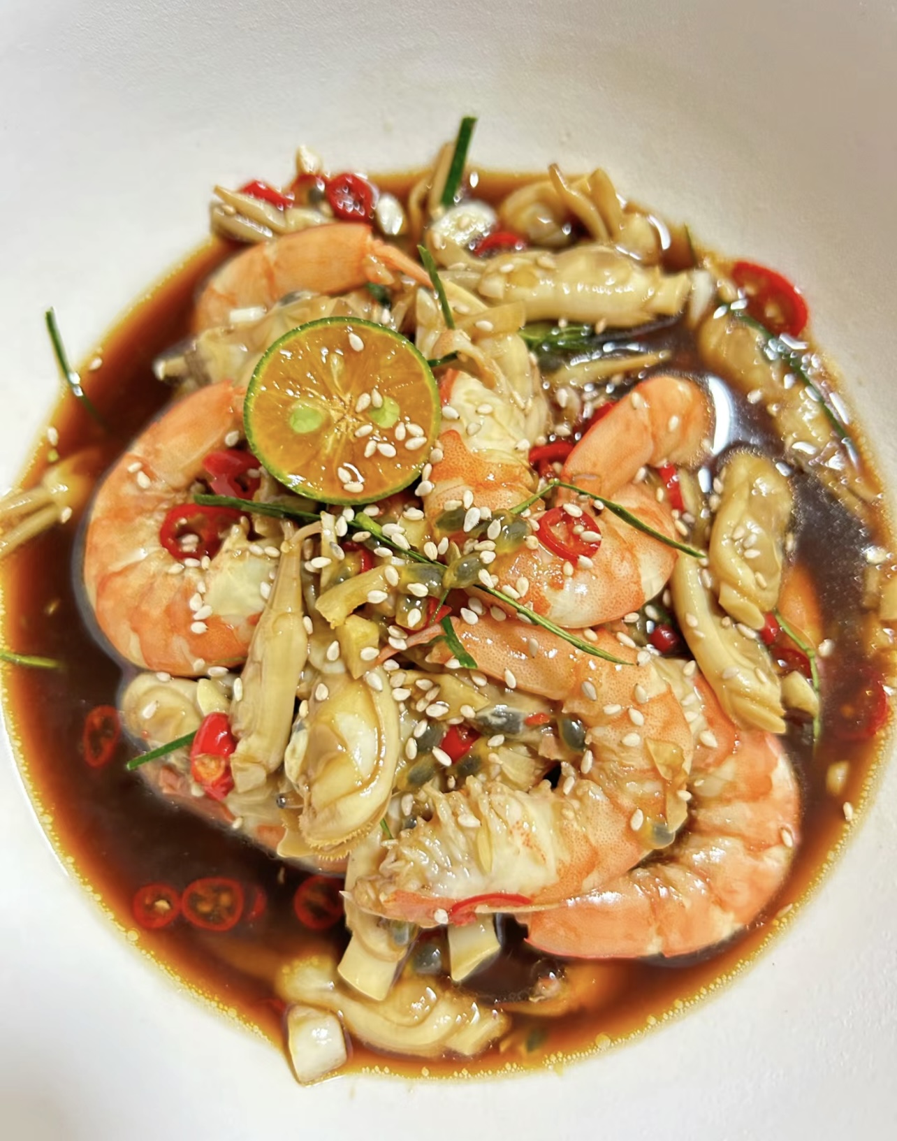 首先,准备好新鲜的食材。虾是这道菜的主角,一定要挑选那些活蹦乱跳、外壳透明有光泽的鲜虾,这样才能保证虾肉的鲜美和紧实。除了虾,我们还需要一些蛏子来增添口感的丰富度。配料方面,小米辣、蒜末、百香果、青柠和柠檬叶是必不可少的,它们将为这道菜注入灵魂。