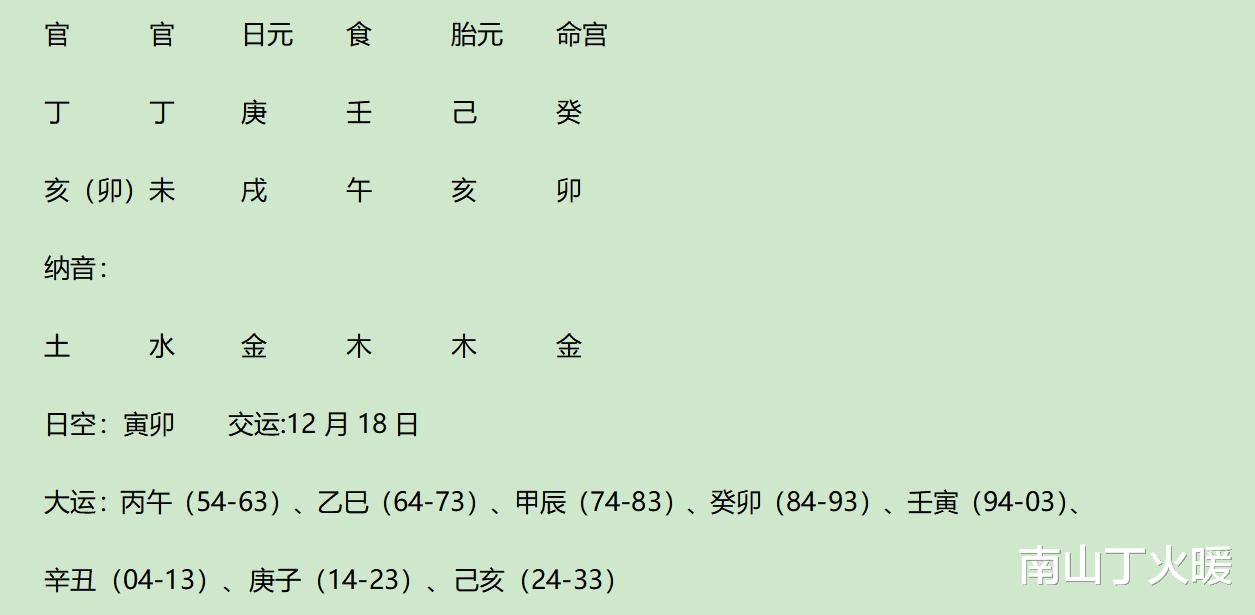 此年,己印生辛劫,辛劫生壬食;大运丑与胎元亥拱子,流年卯与大运丑夹寅,小限亥与月支未拱卯。