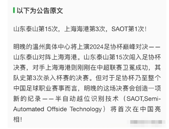 另外,半自动越位技术将在足协杯决赛中首次亮相中国!