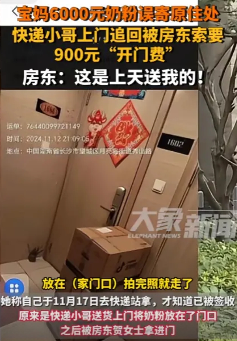 长沙,一宝妈给1岁宝宝网购6000元奶粉,因搬了新家忘记修改地址,导致奶粉误寄原住处,快递小哥上门追回,不料却被房东索要900元开门费!房东:这是上天送我的!小哥只好报警处理。