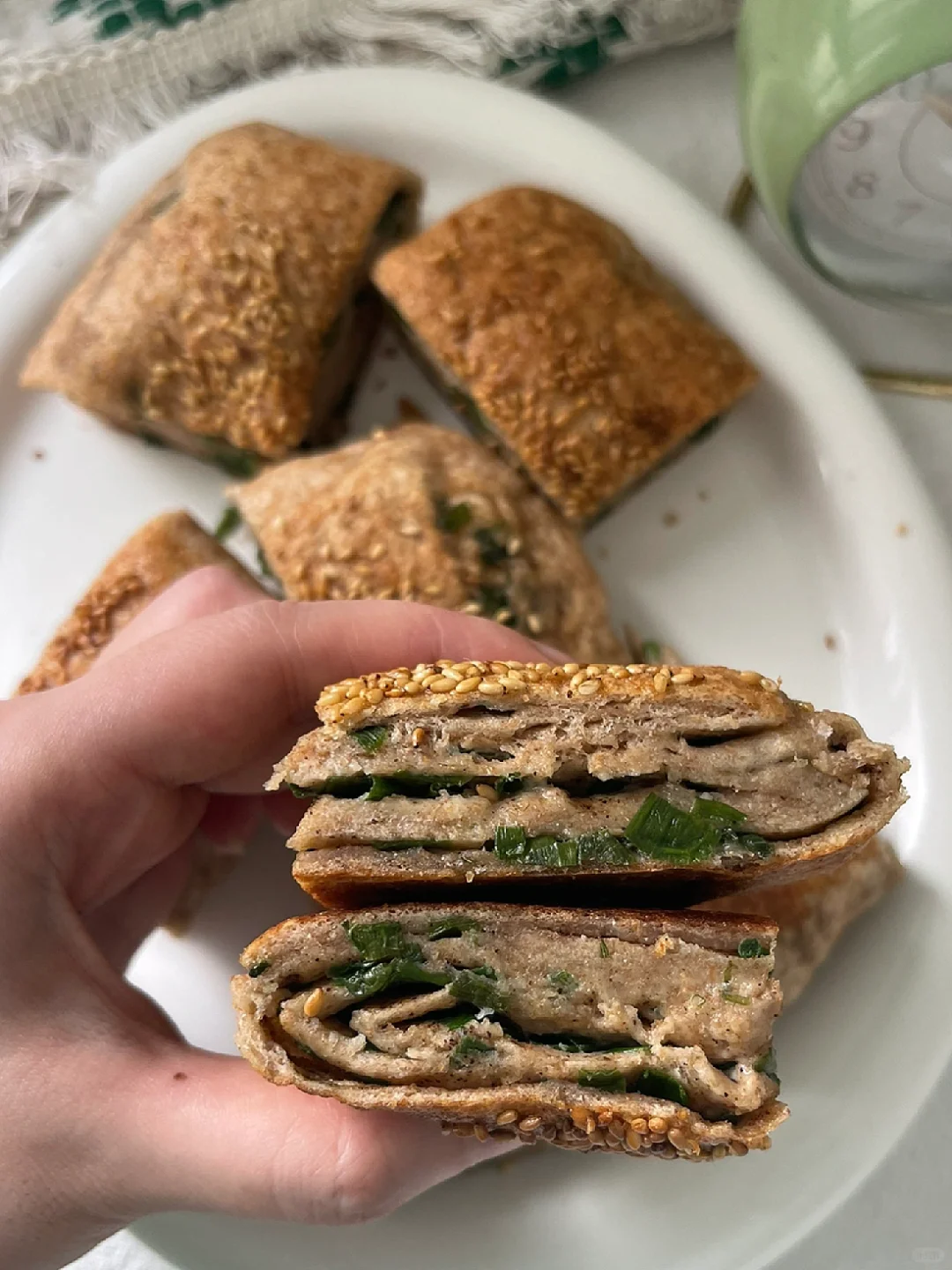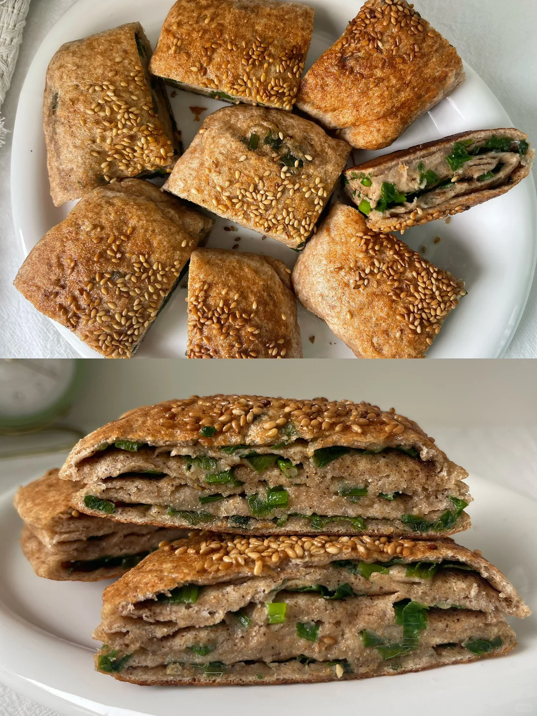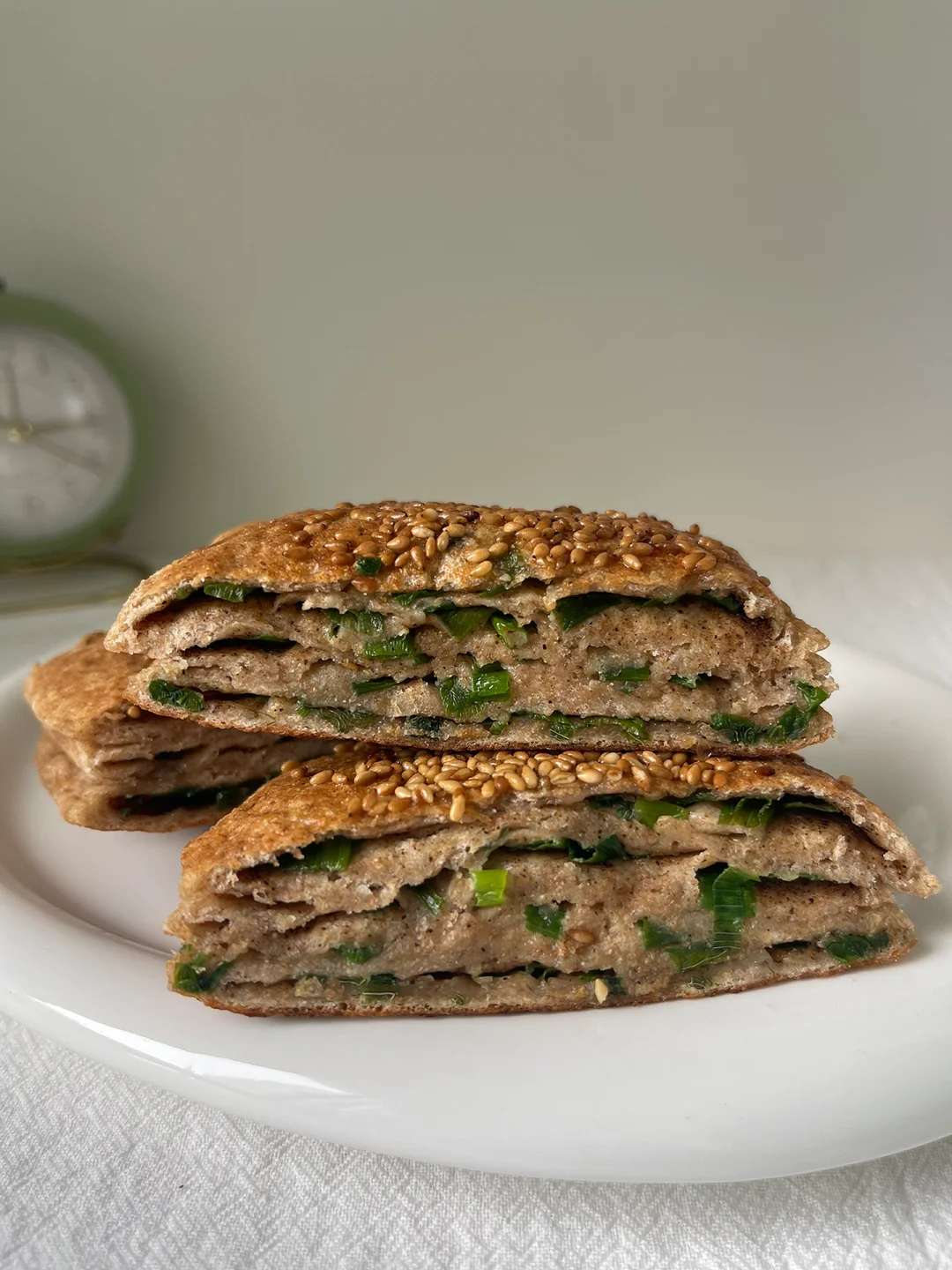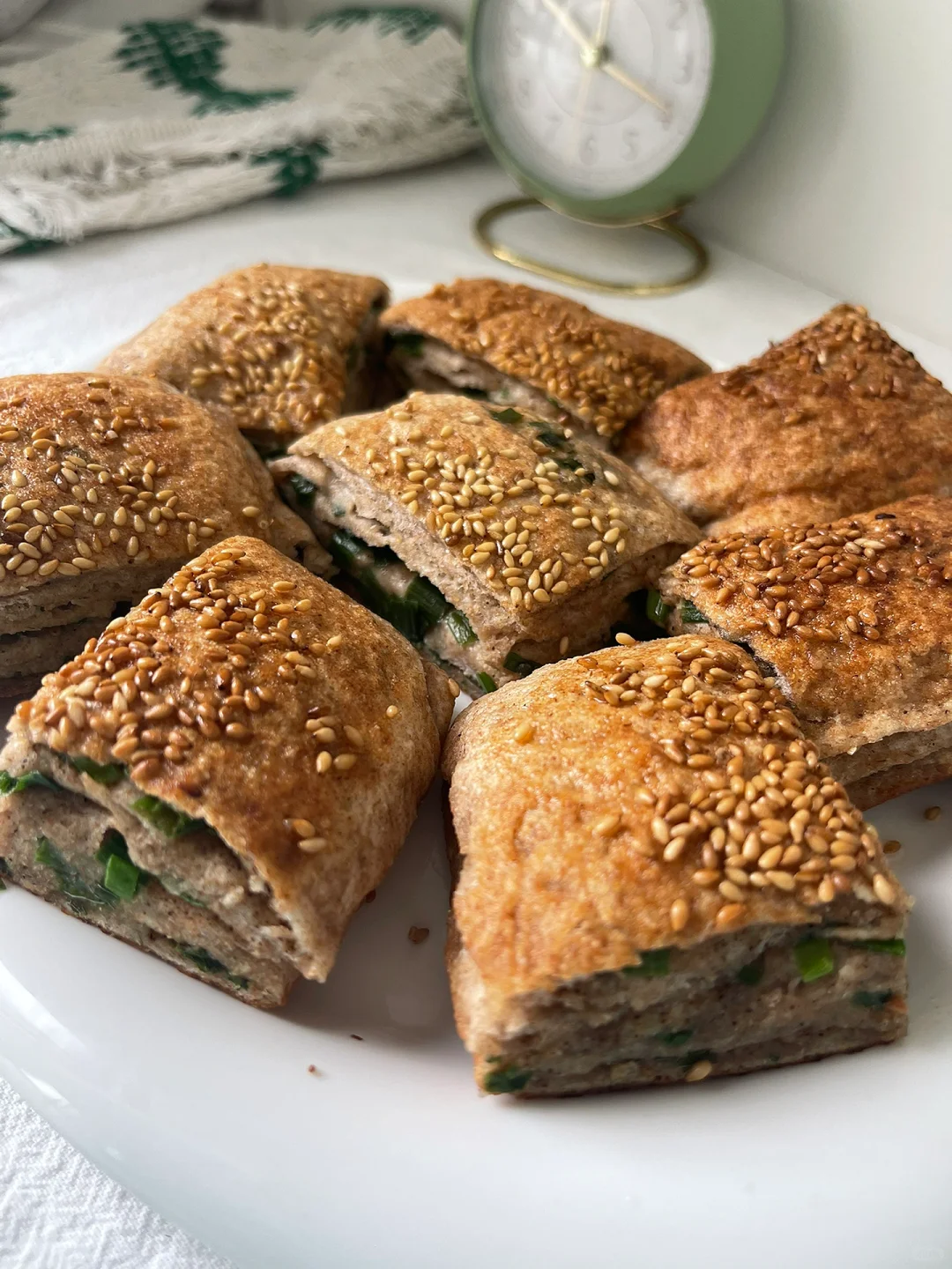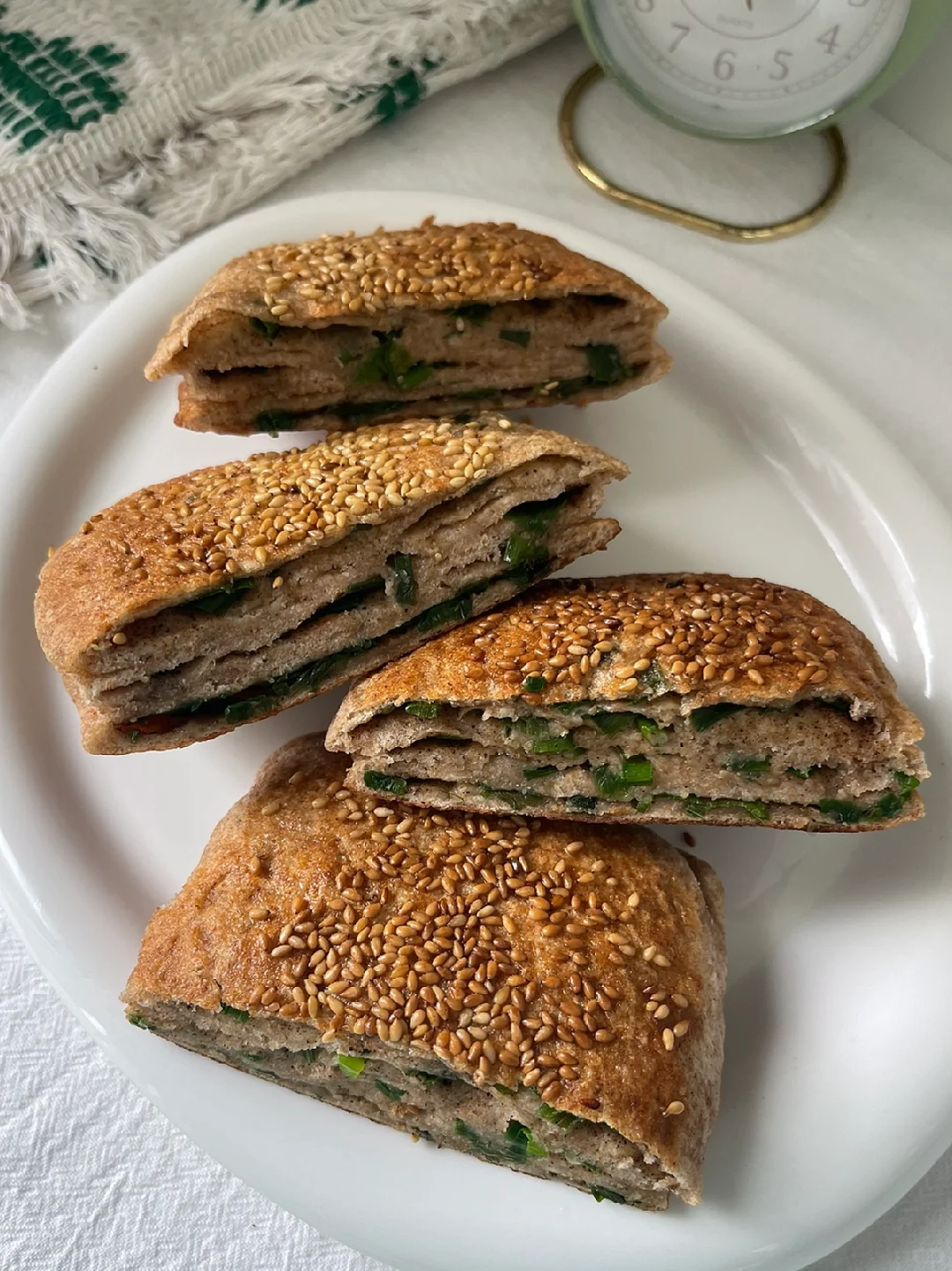 全麦面粉150g、普通面粉50g、酵母粉3g、温水60g、盐2g、白芝麻些许