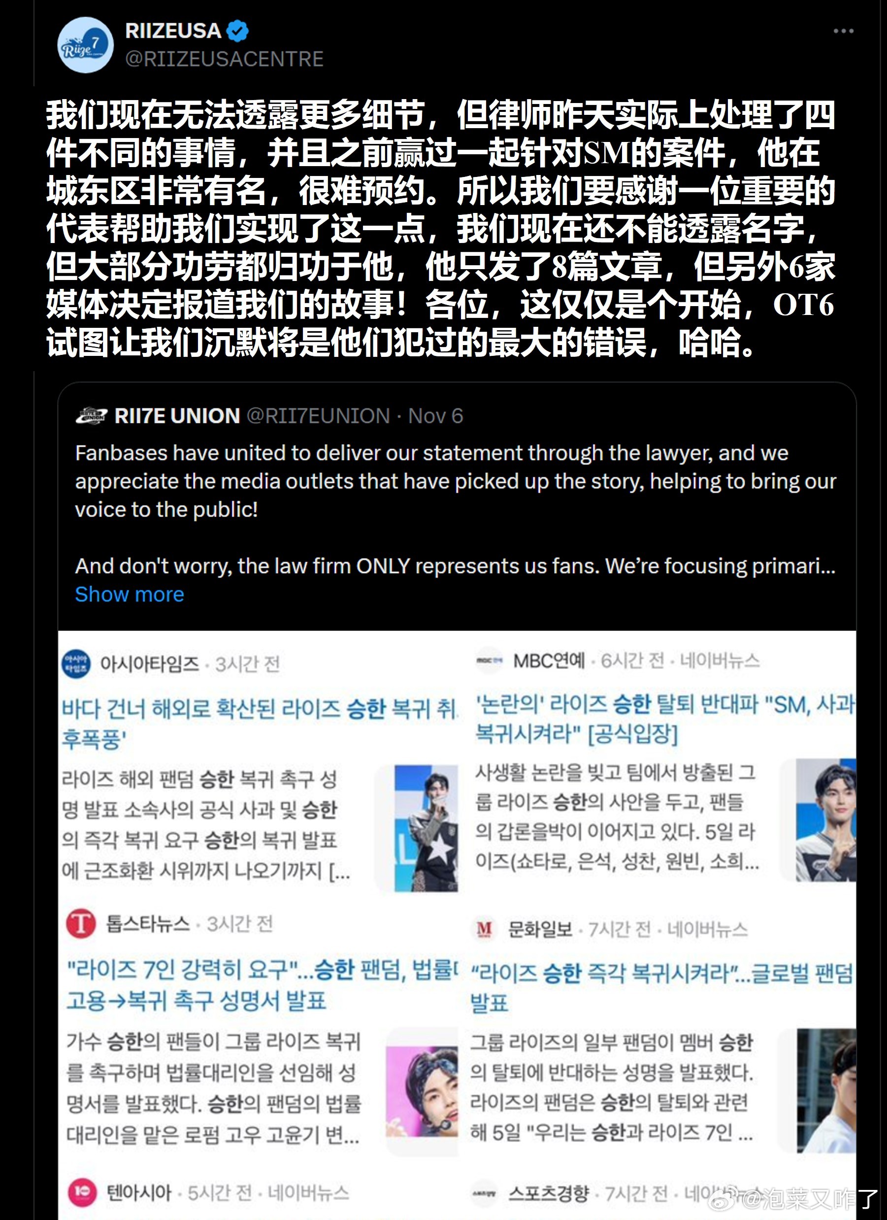 RIIZE反向营销更多新线索指向HYBE:无端的新闻联动+请的律师和HYBE公关部长认识(也是CBX解约时MC梦的代理律师),SM赶紧干活!