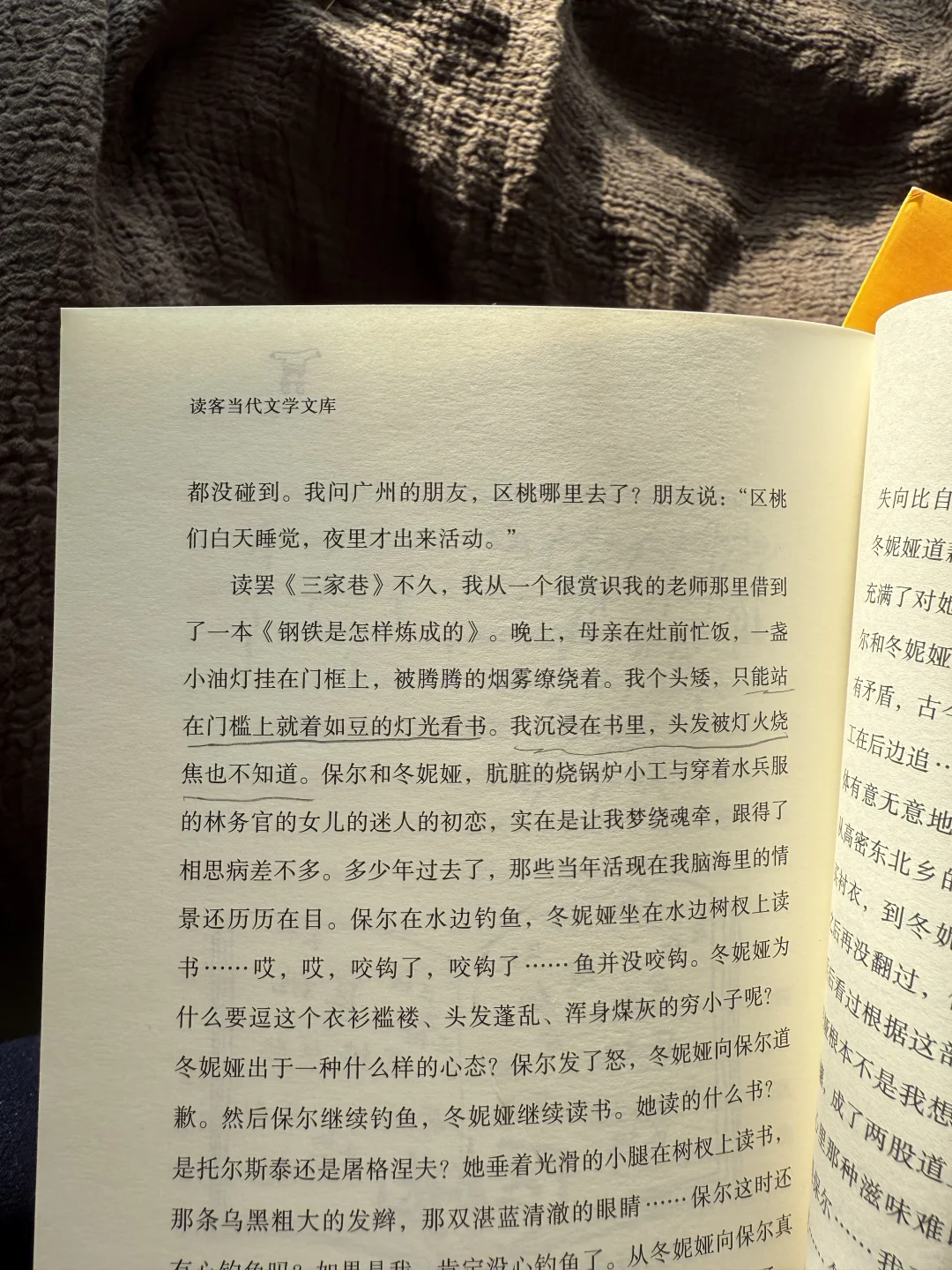 “母亲在灶前忙饭,一盏小油灯挂在门框上,我站在门槛上就着如豆的灯光看书。沉浸在书里,头发被灯火烧焦了也不知道。”