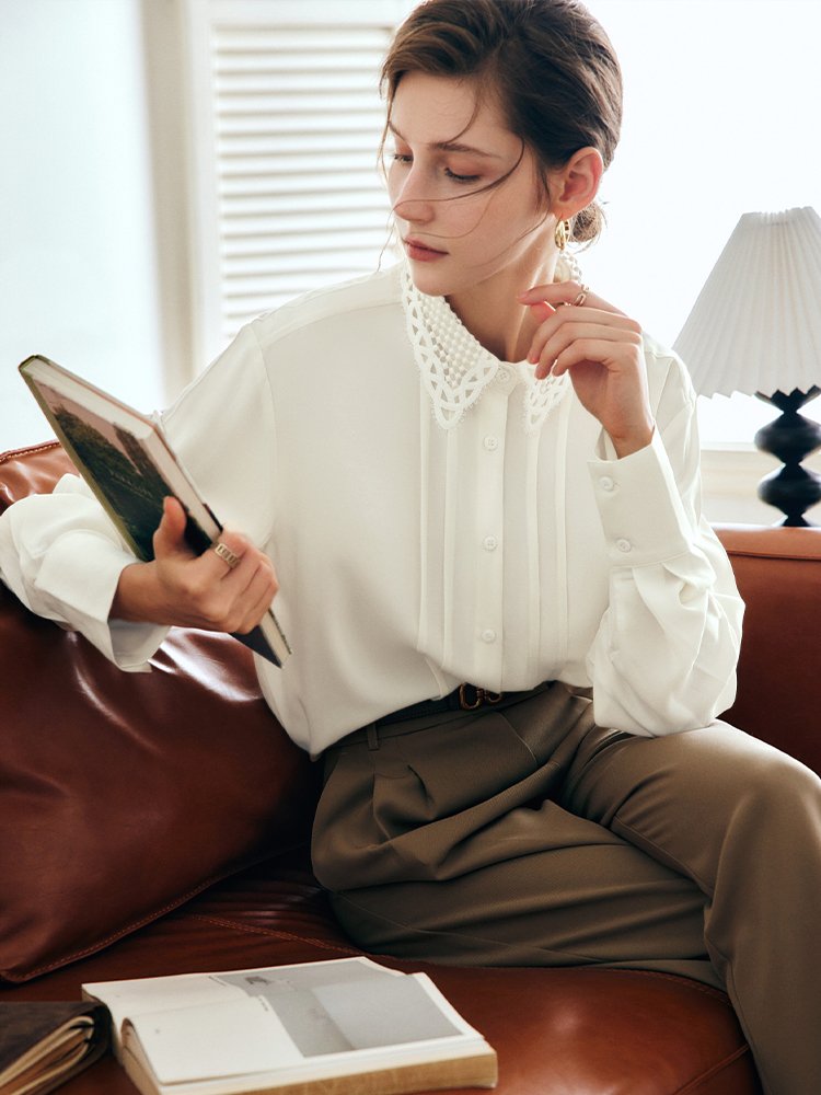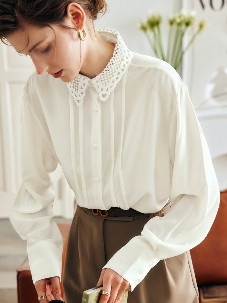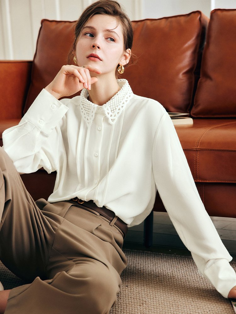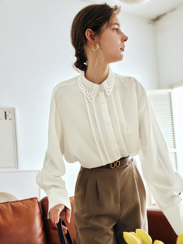 甄选進口仿真丝面料,柔软丝滑;舒适细腻,垂坠感好,有隐隐的光泽感;奶油杏色调与仿真丝材质莞美融合;水溶拼接衬衫领,丰富了层次感和造型感;雅致精美感太浓郁,优雅又温柔;胸前竖条压褶设计,丰富细腻,立体显瘦;门襟简洁单排扣,美观大方,穿脱方便;承包了精至通勤的高光时刻