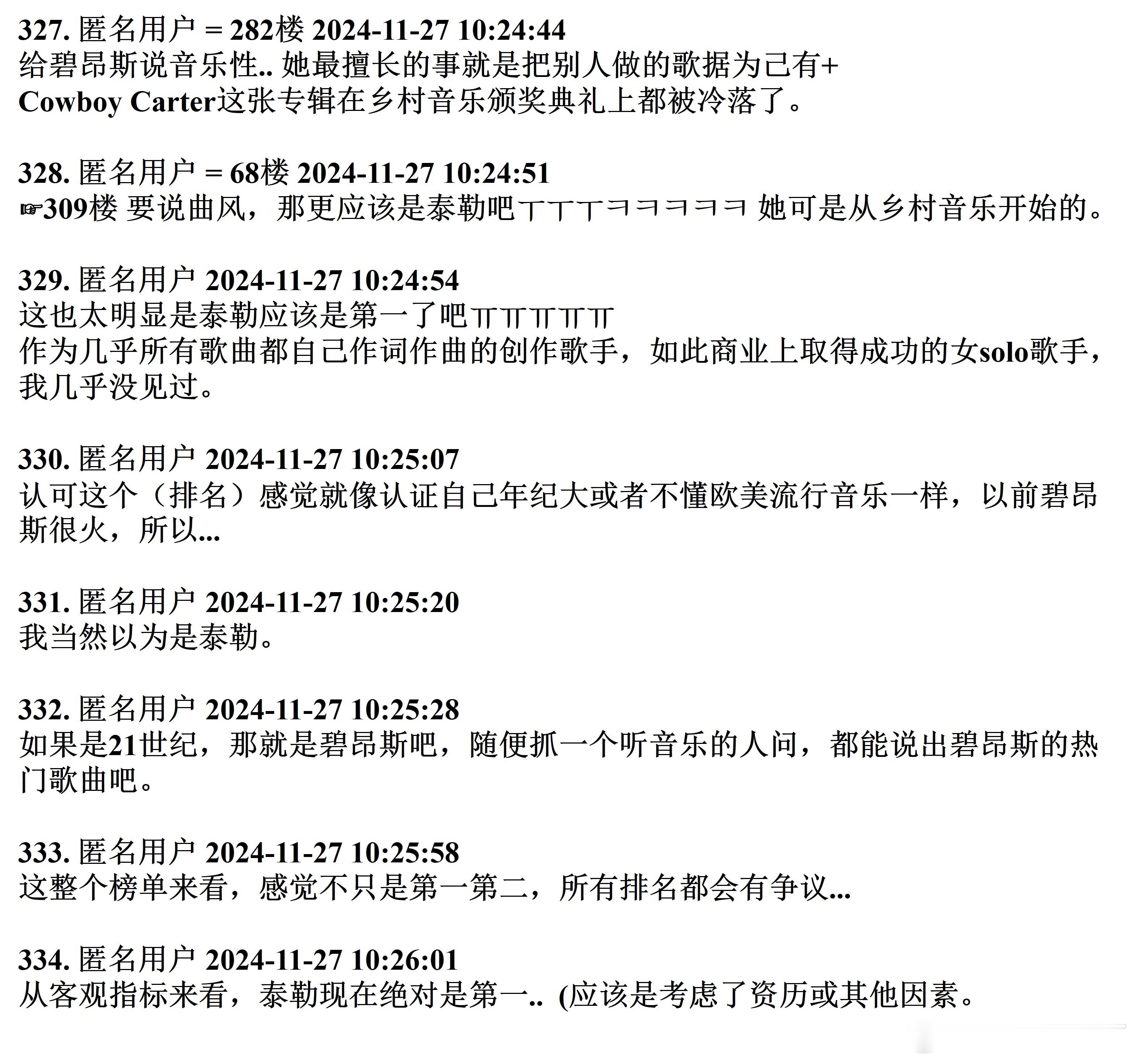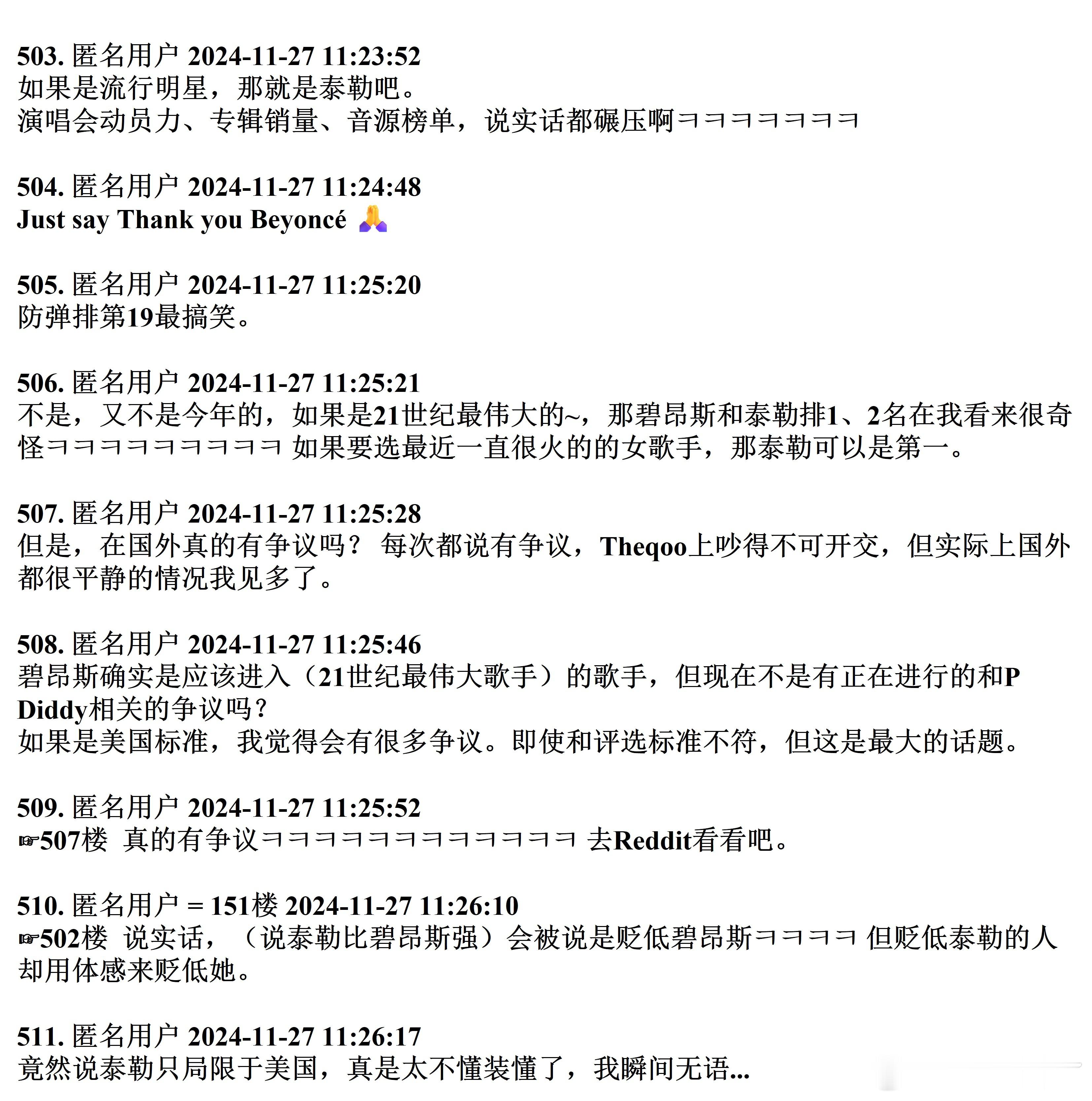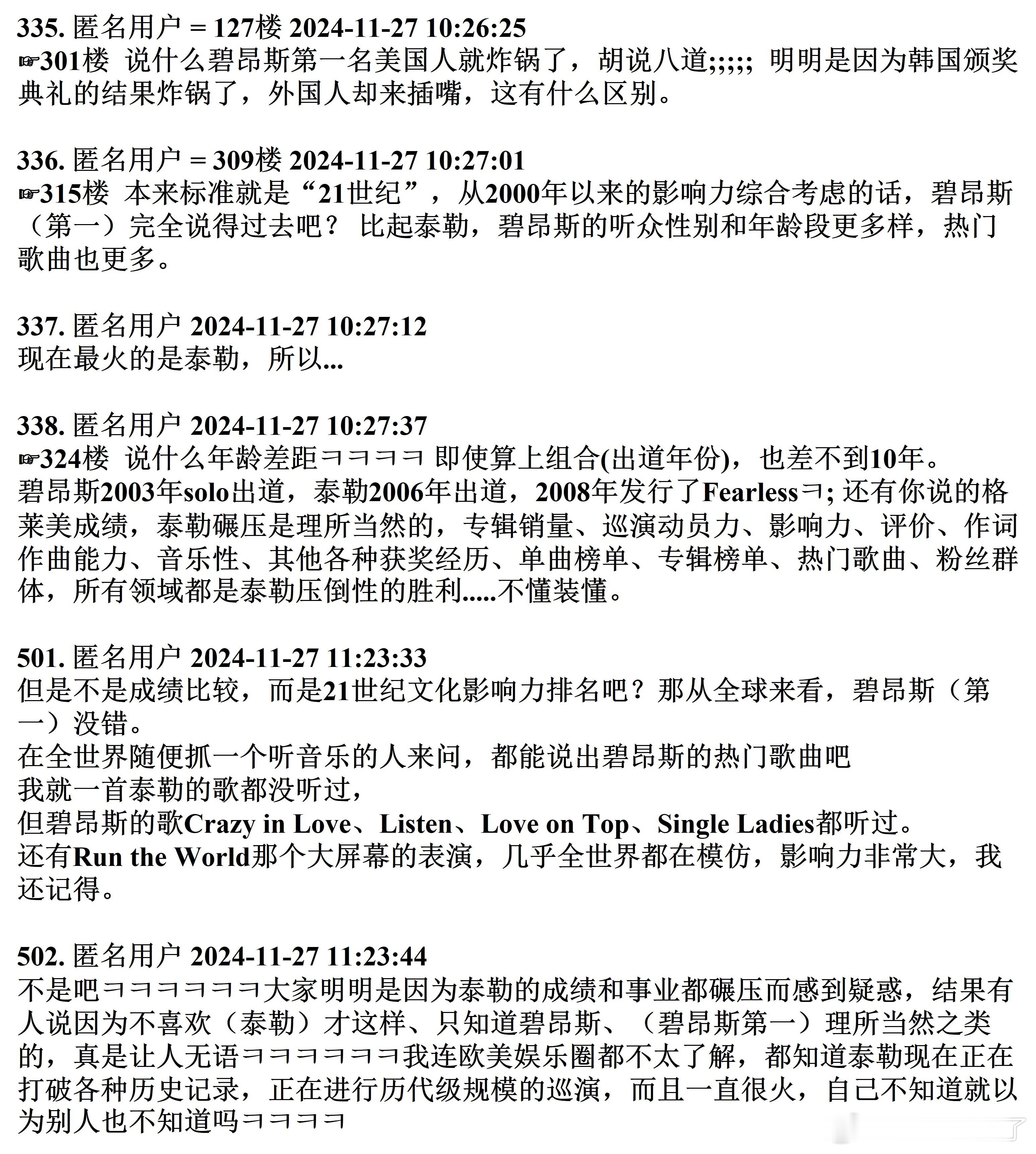 原楼主说因为泰勒第二,碧昂斯第一,外网吵起来了
