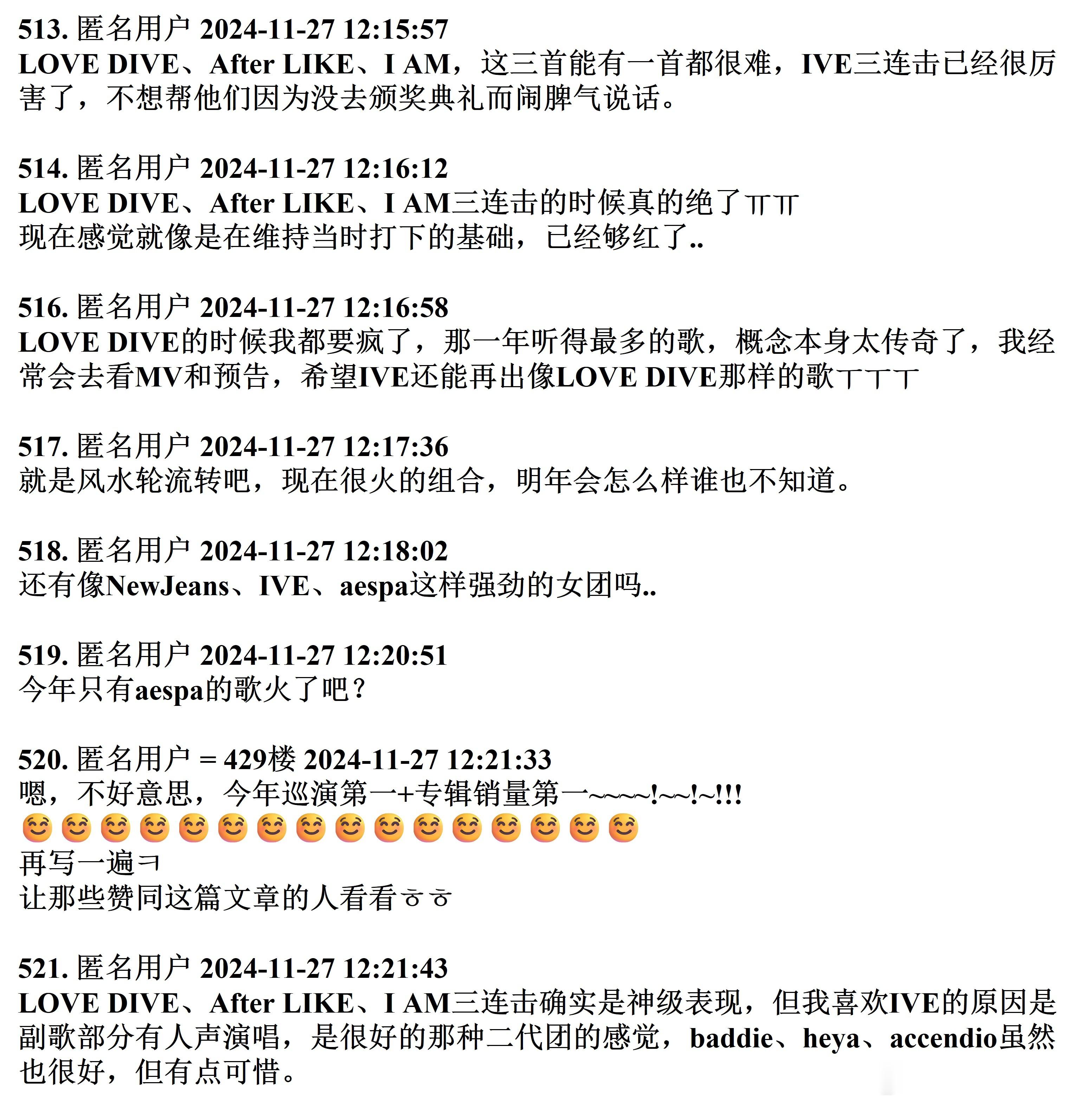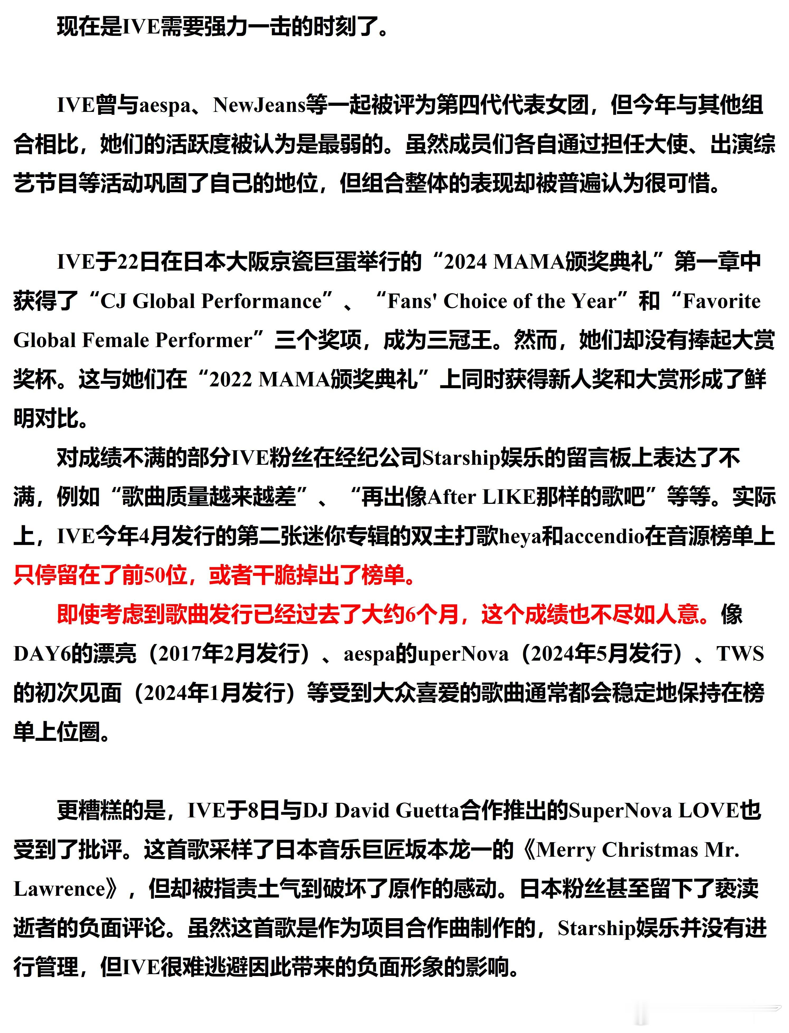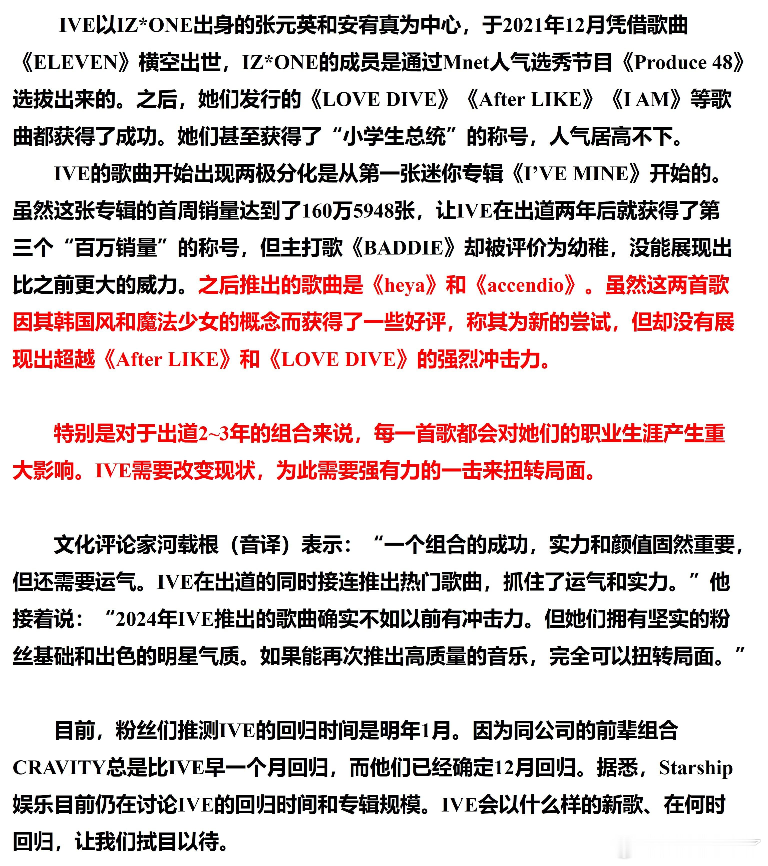 评论区有觉得是HYBE写的(不过其实这家媒体经常狙击HYBE),蛮多人表示I AM之后得质量不比从前,不过要求每年歌曲都是love dive I AM级别也不太现实,总体上感觉评论对芙今年表现还满意的?基本上都觉得只要有好歌就能再回去