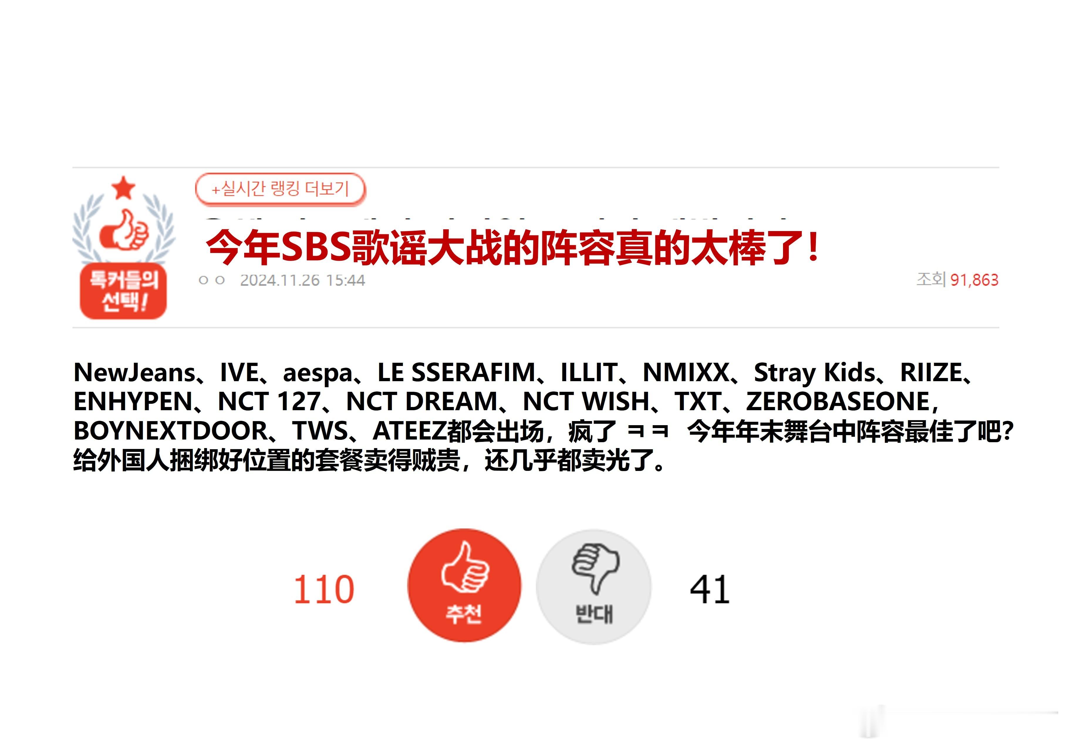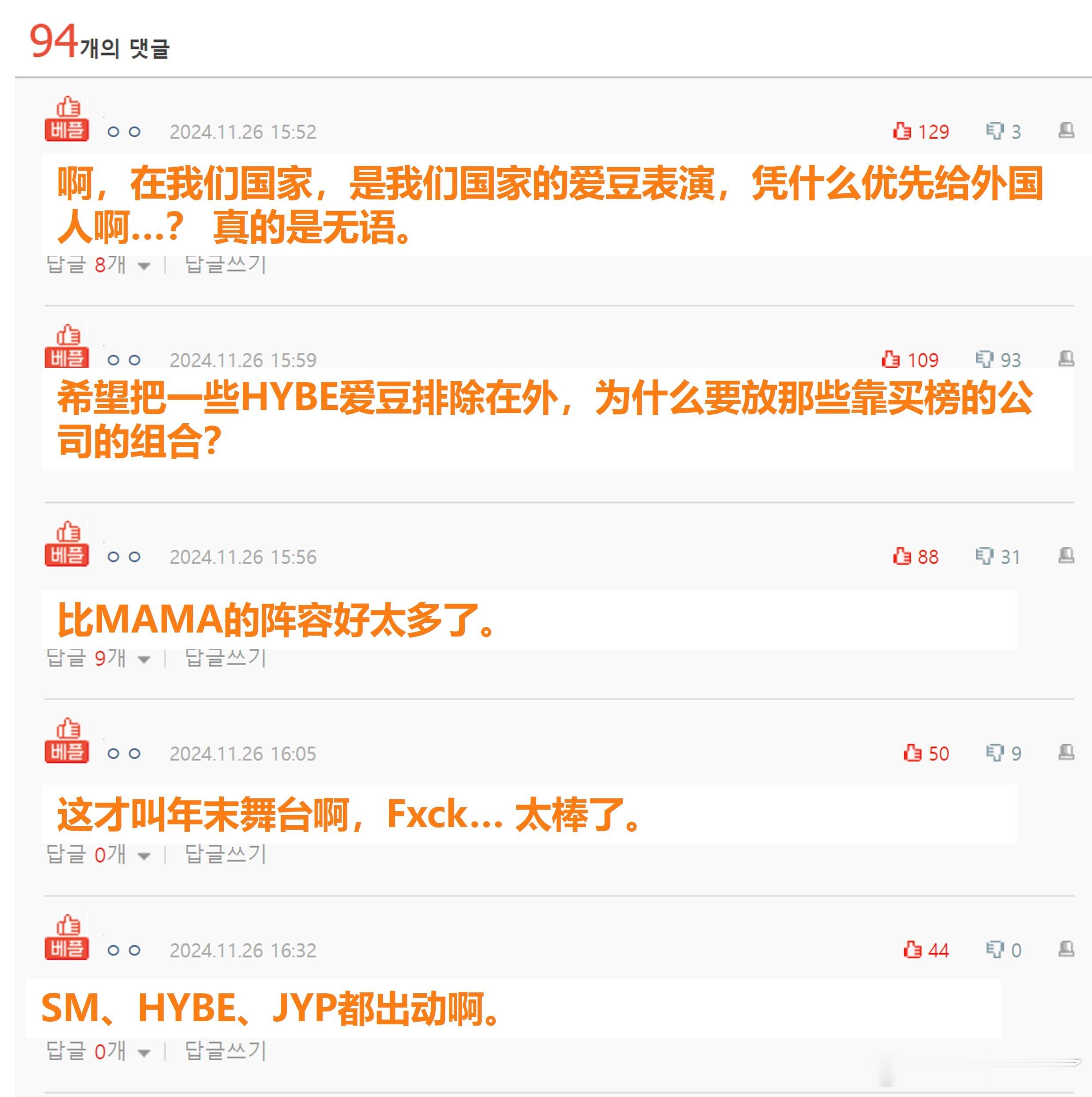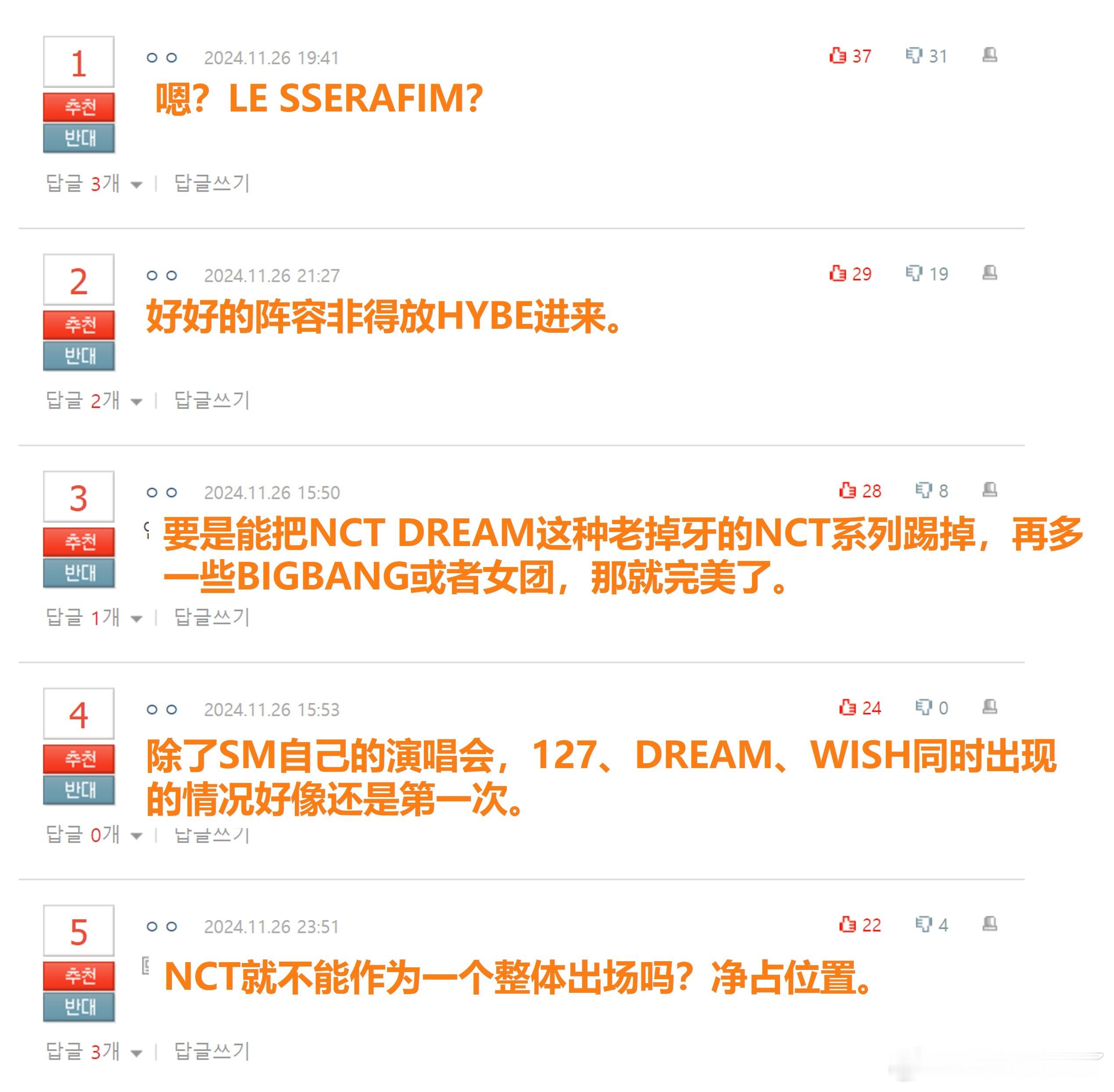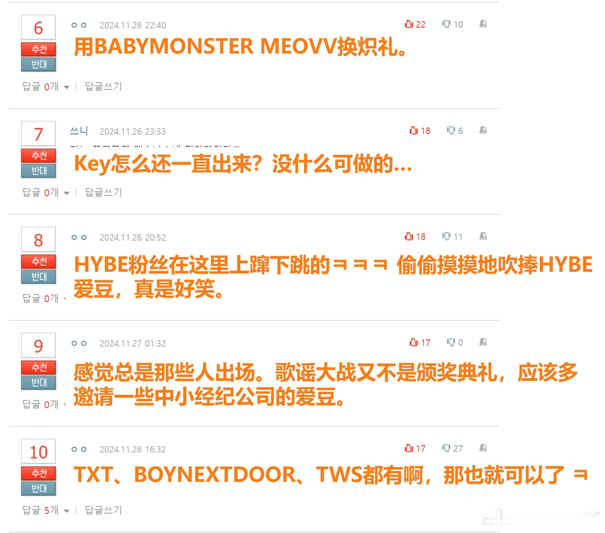 看热评nhr虽然觉得阵容不错,但是对于HYBE爱豆的出现比较不满,还有觉得NCT占了太多位置,不如作为NCT整体出来(但是这样会变成超长舞台吧),还有中小公司的爱豆太少了