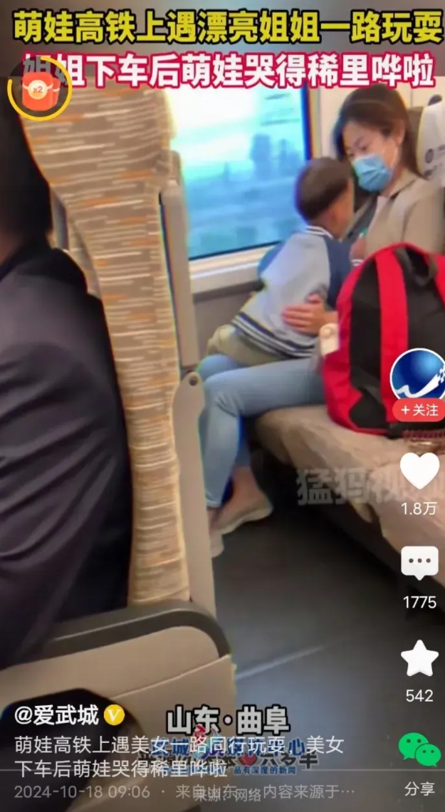后面的宝妈心里嘀咕着,这一别也不知道何时才能相遇了,高铁车厢里这一幕确实是太温馨了!