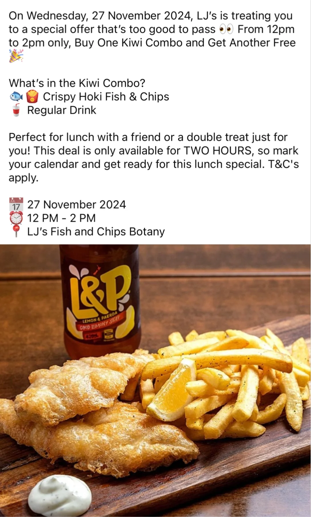 [拔草R]LJ FNC Botany,炸鱼薯条套餐买一送一,优惠时间11.27一天
