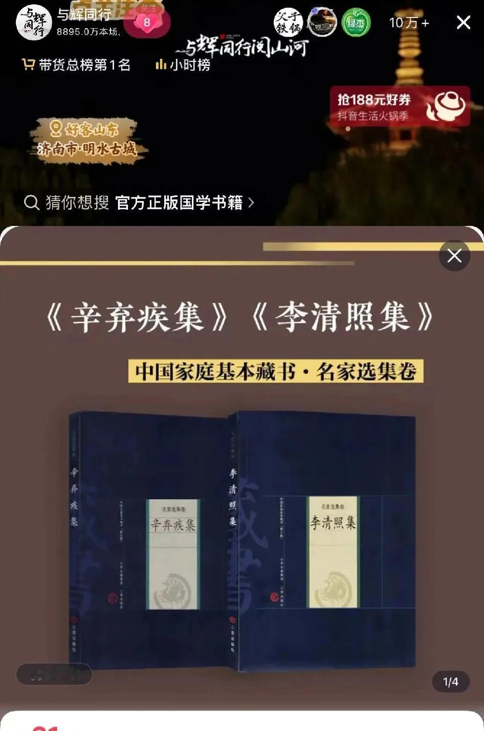 董宇辉山东行轻轻松松半小时又卖了两万多本书? 今晚的讲书两个字“精彩”,实在是太精彩了!那语速、那逻辑、那词、那句,听得一愣一愣、一笑一笑、又恍惚又痴迷,一会仿佛坠入云朵里,一会仿佛自己正沉浸其中,不懂这是啥感觉! 说辛弃疾,少年英雄,二十年闲居、壮志难酬。 说李清照,超越那个时代的少女,轻快、灵动、有趣。 …………… 听着脑瓜都大爆炸了!猜想很多人都会像我一样迷.糊? 董宇辉讲书咋这么逗,既有如此深度又咋这么有趣呢!不太明白! 时间飞逝一般,眉飞色舞地讲了一会书,就已经卖了一万多套,两万多册!真乃卖书小王子,全网无敌! 现在还没回过神来,有同感吗?