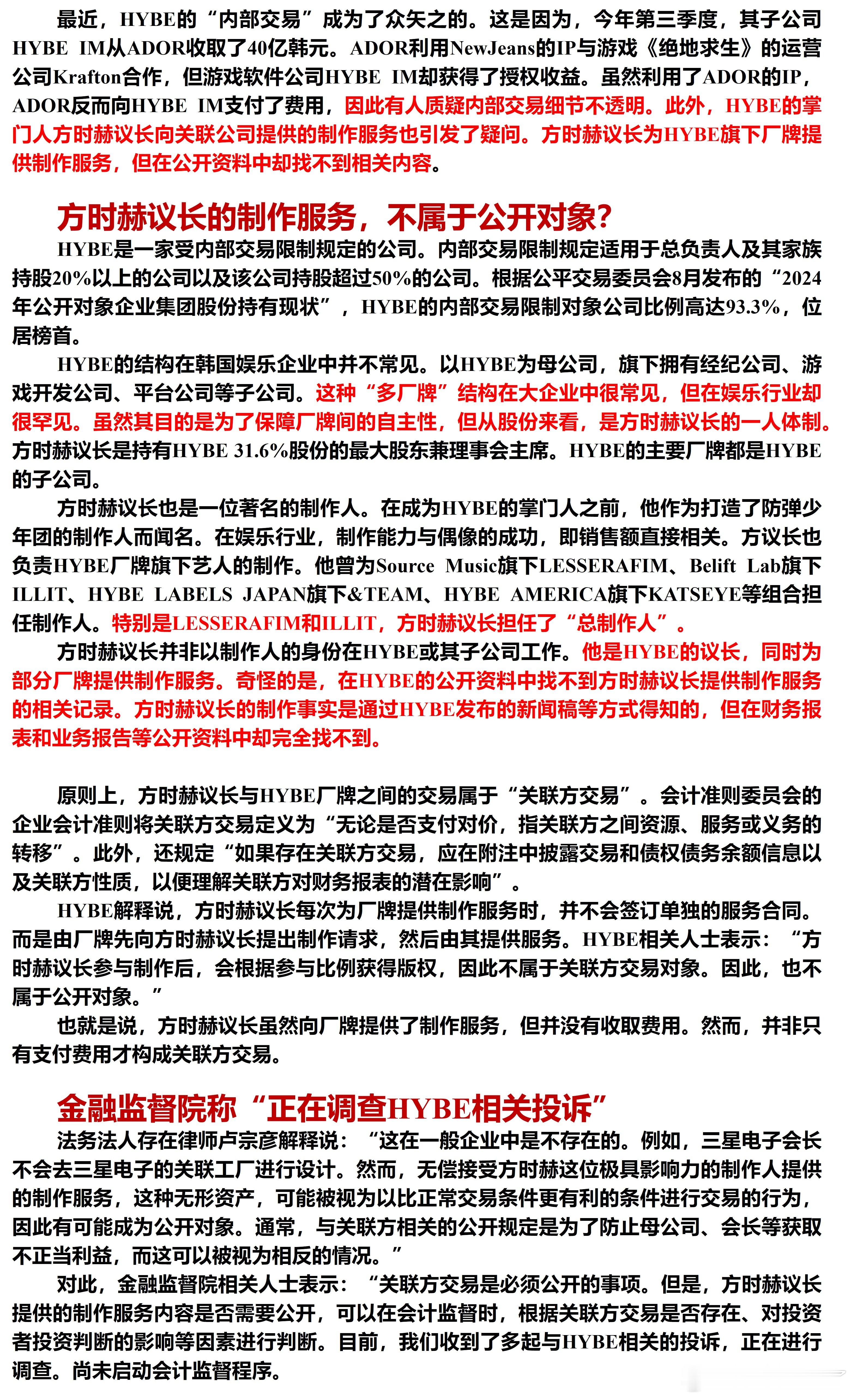 关联公司免费制作?HYBE、方时赫的“内部交易”为何未公开?