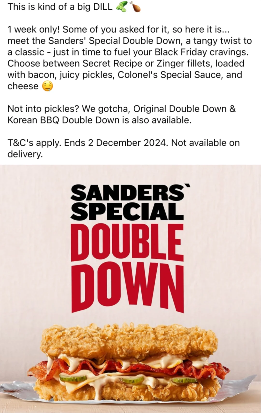 纽村肯德基,咱们的“老朋友”Double Down限时回归啦[哇R][哇R]! Secret Recipe or Zinger fillets, loaded with bacon, juicy pickles, Colonel's Special Sauce, and cheese 🤤 如果您不喜欢泡菜,还有其他选择,比如原味和韩式烤肉味[耶R] 适用截至2024年12月2日。不适用于送货服务[失望R]小伙伴们记得去品尝[耶R] 关注我,下一篇更精彩