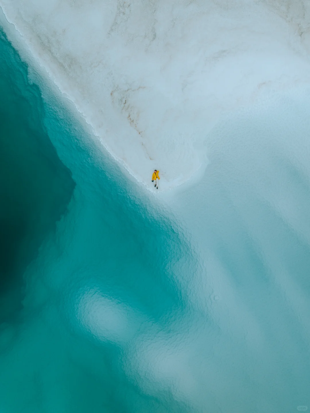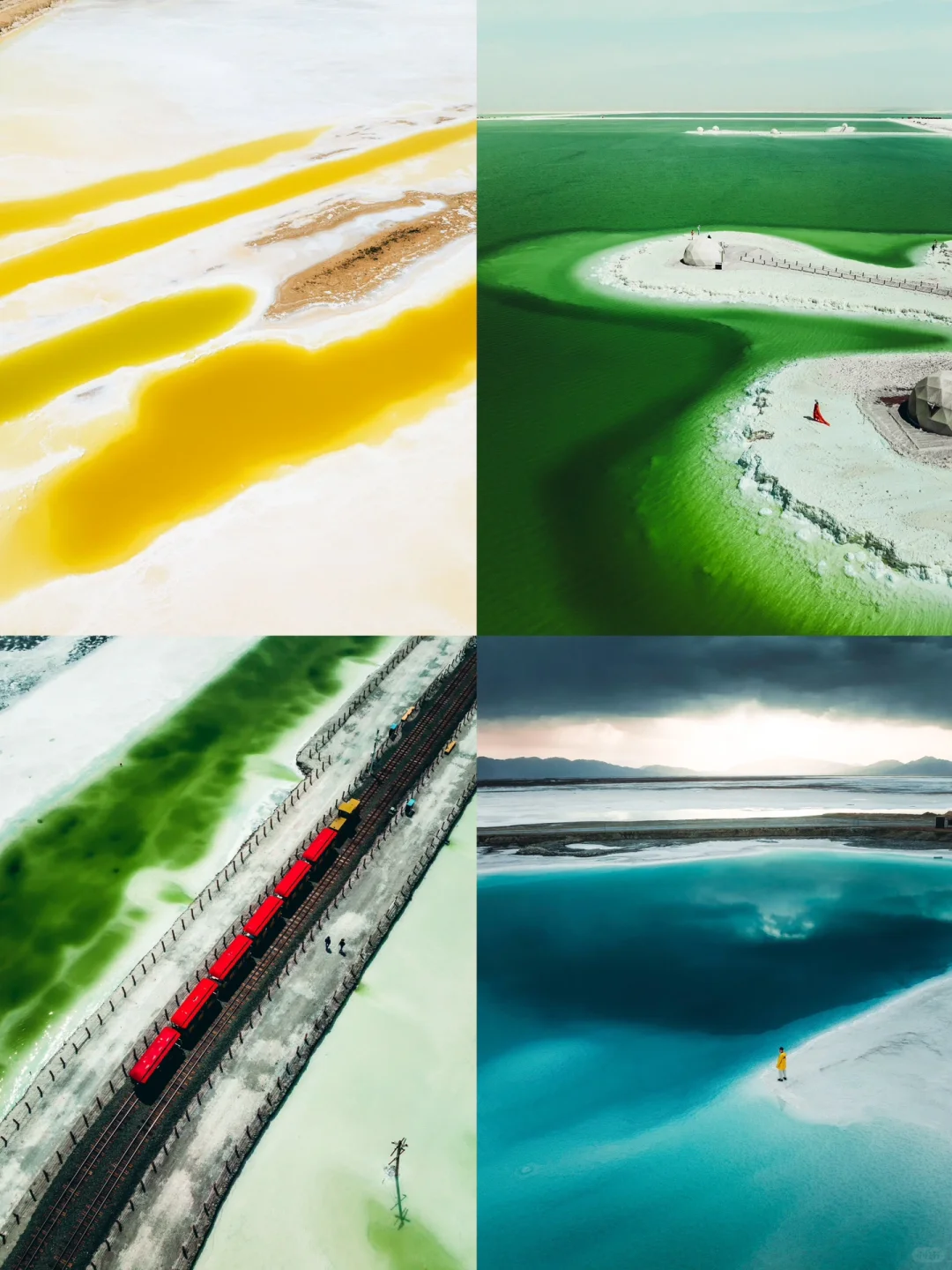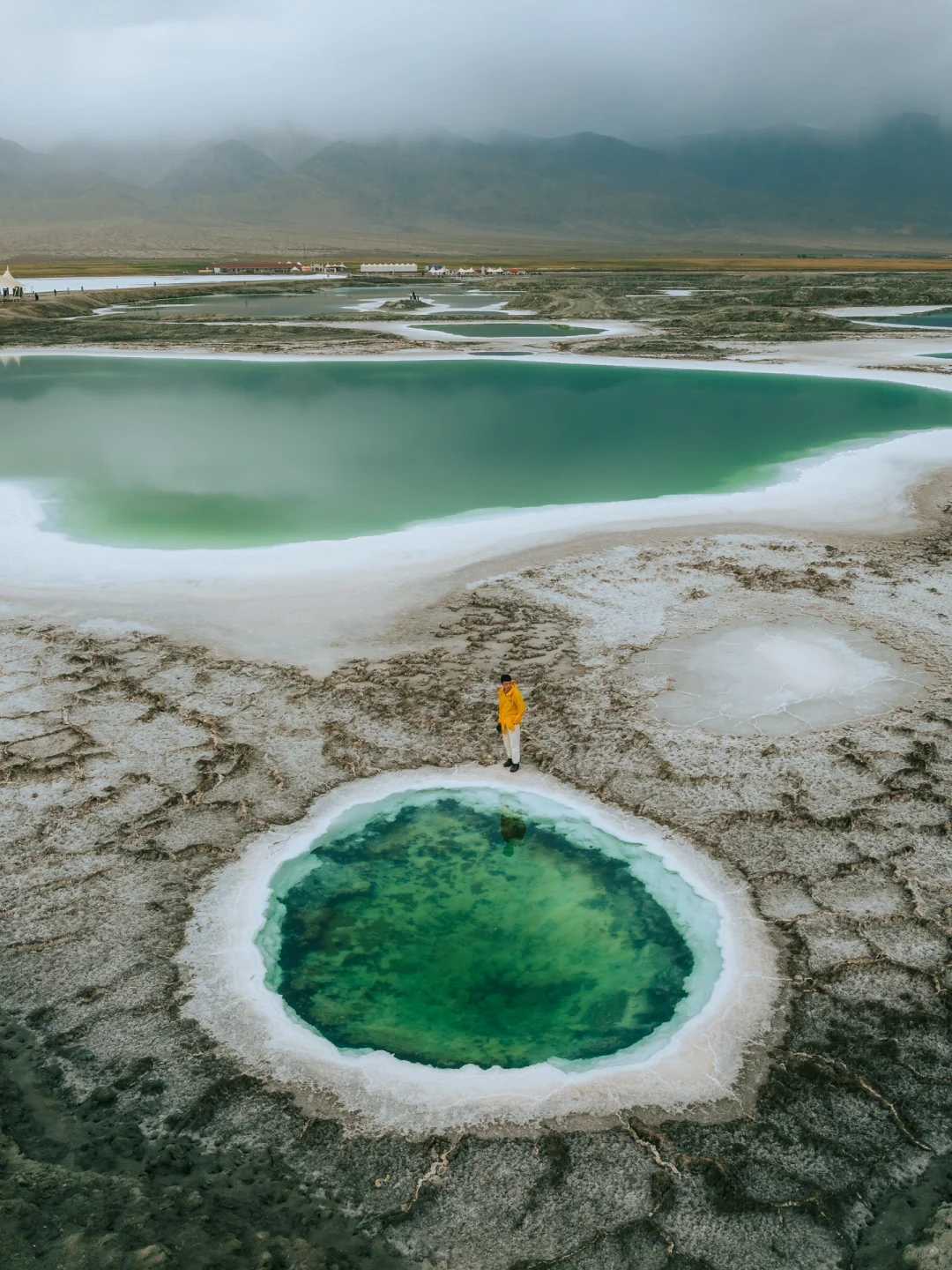 出发翡翠湖,湖水深浅不一的盐池,宛如一块块翡翠,建议穿着颜色鲜艳的衣服拍照!