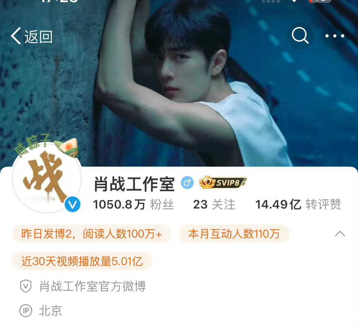 肖战工作室本月互动人数 肖战工作室近30天视频播放量 肖战工作室近30天视频播放量5.01亿,本月互动人数110万,不愧是顶流啊!