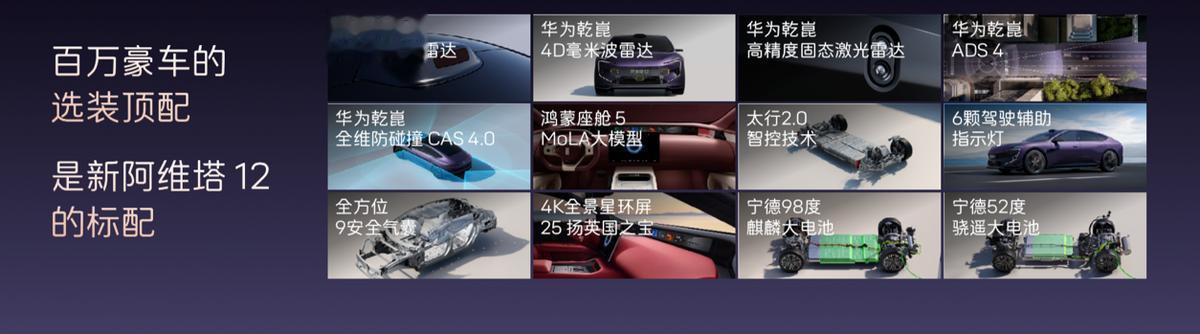 新阿维塔12定位未来智能豪华轿车,面向时代精英人群,主打豪华、智能、旗舰级出行体验。新车全系标配12项顶格配置,涵盖华为乾崑智驾全系统、太行智控2.0、35.4英寸4K全景星环屏、25扬英国之宝音响、全车9安全气囊等,百万豪车顶配选装功能悉数标配。同时推出六大限时购车礼遇,购置税补贴礼遇、配置升级礼遇、老车主升级礼遇、ADS高阶包抵扣权益、贷5年首2年0息金融礼遇、万元用车无忧礼遇,入门即满配,彻底打破豪华门槛。