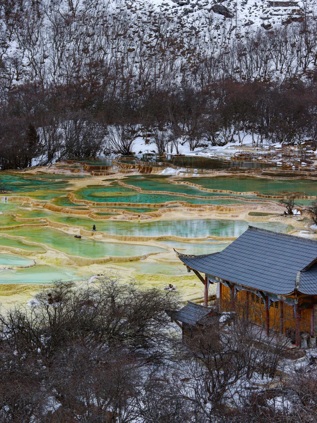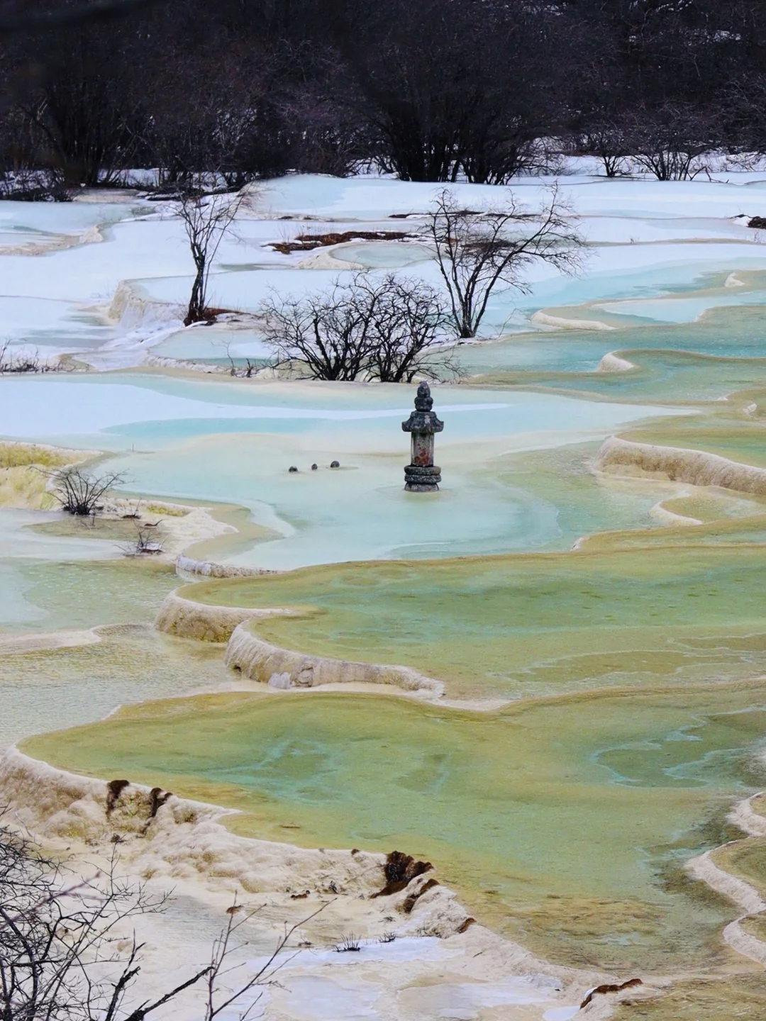冬天的黄龙由于高海拔游人会稀少很多,但结了冰的“人间瑶池”五彩池却更显韵味。蓬台的冰瀑、覆盖满雪的雪宝顶都是只有冬天才能看到的奇观。