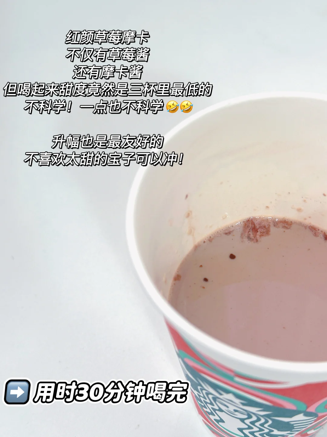 红颜草莓摩卡,不仅有草莓酱,还有摩卡酱,但喝起来甜度竟然是三杯里最低的!不科学!一点也不科学🤣🤣