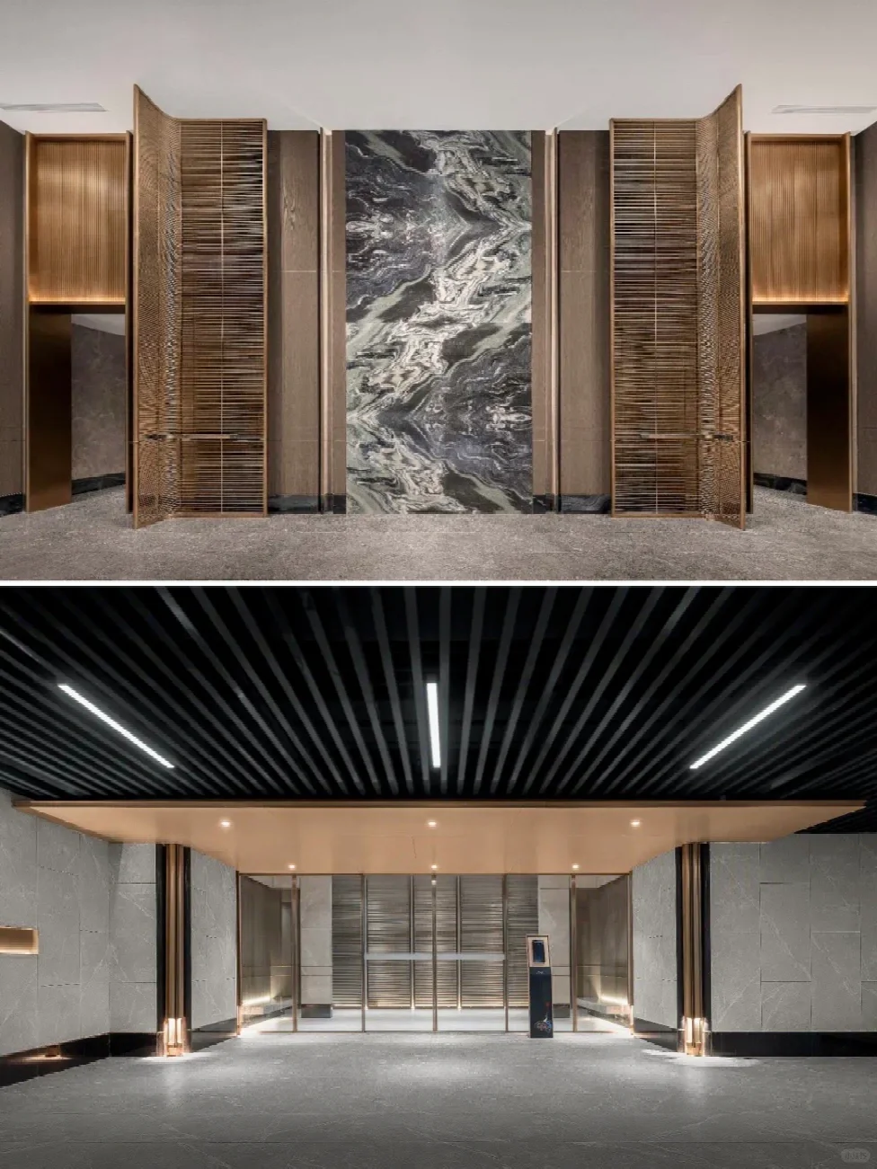 ✔️入户单元|首层入户挑高约6米,竖向艺术大理石墙面,地面通铺石材,两侧金属屏风,电梯厅为鱼肚灰石材,地下入户大堂金属吊顶