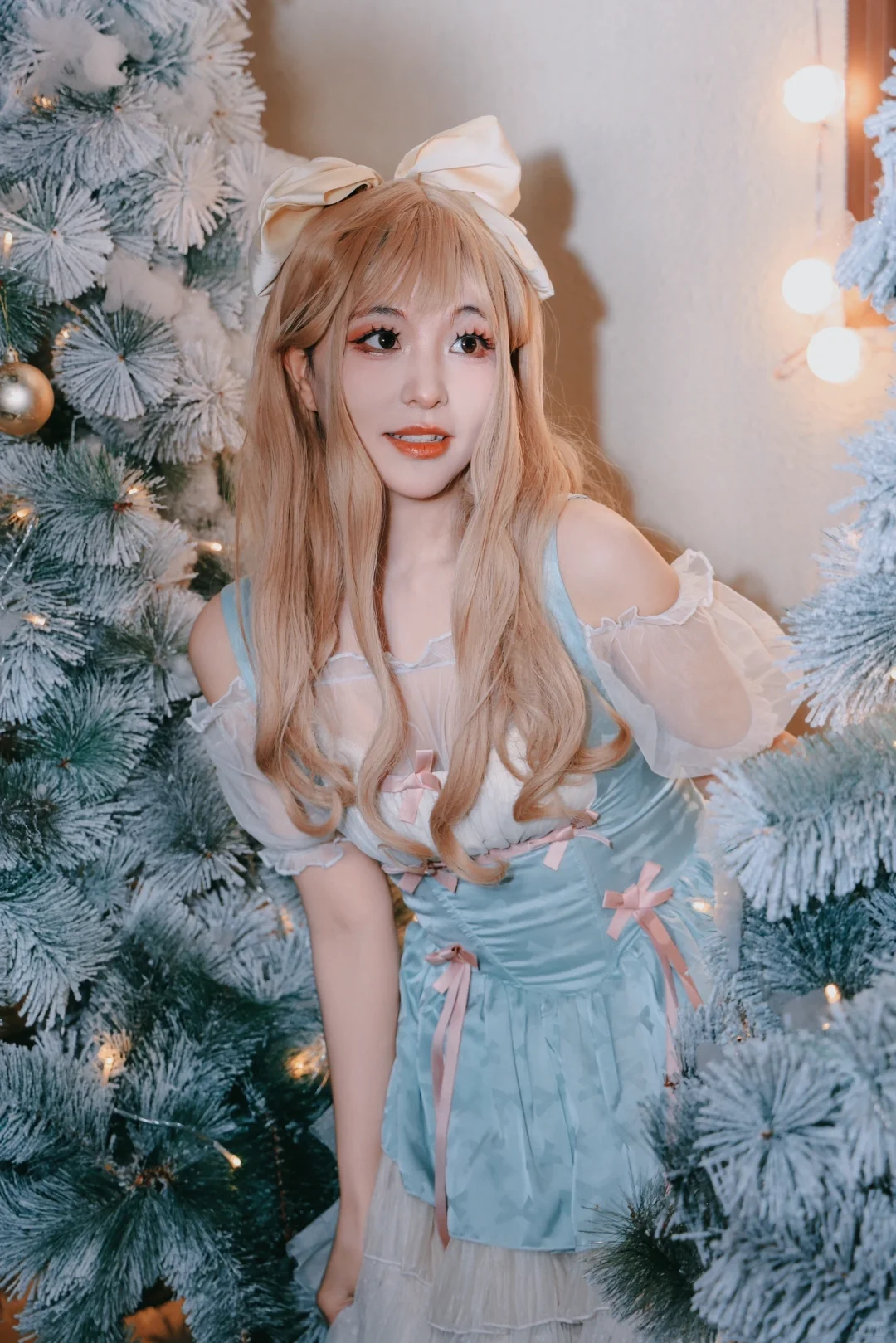 大红色的蝴蝶结,不大的圣诞树