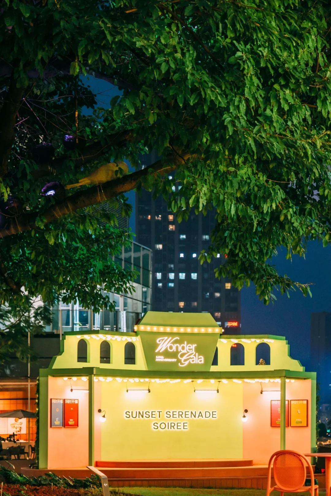 周围也拉起了彩灯,人气和氛围都很棒