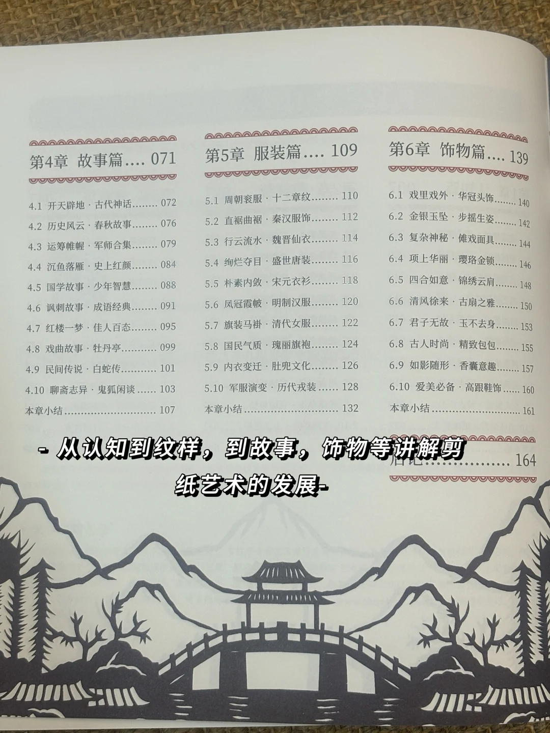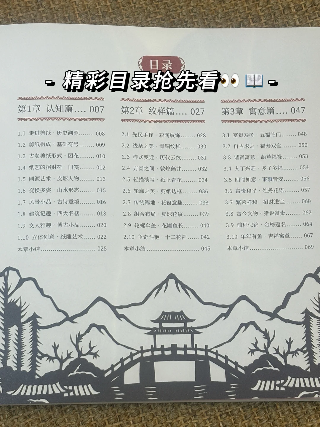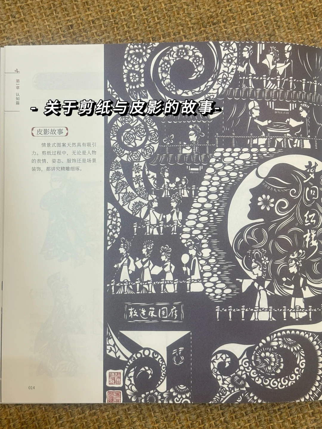 1️⃣ 认知篇,主要讲述剪纸的起源、发展,剪纸的折叠方式,剪纸图案的基础符号,困花、门笺等不同的剪纸形式,并用剪纸表现皮影人物及山、水、楼阙等事物。