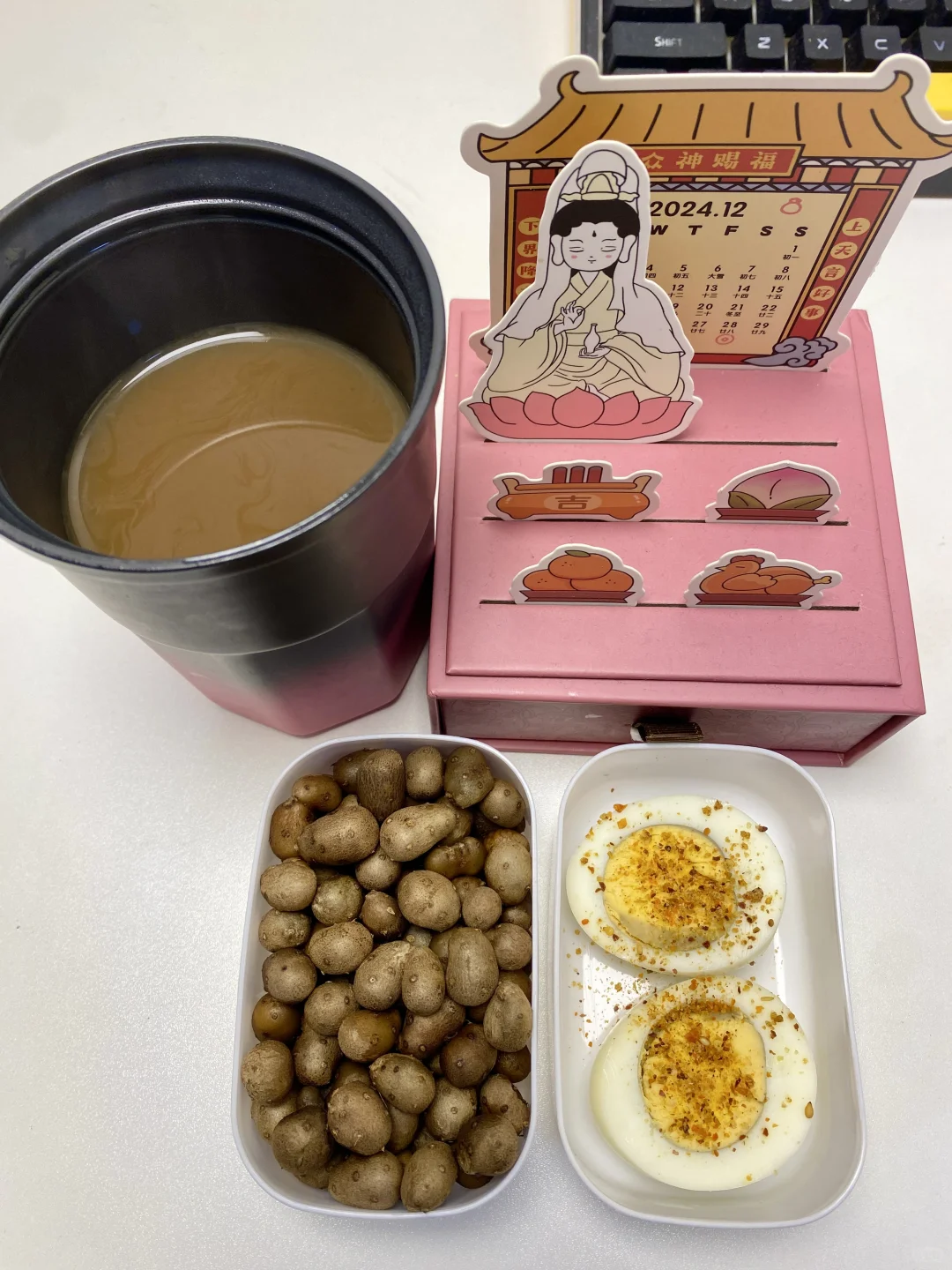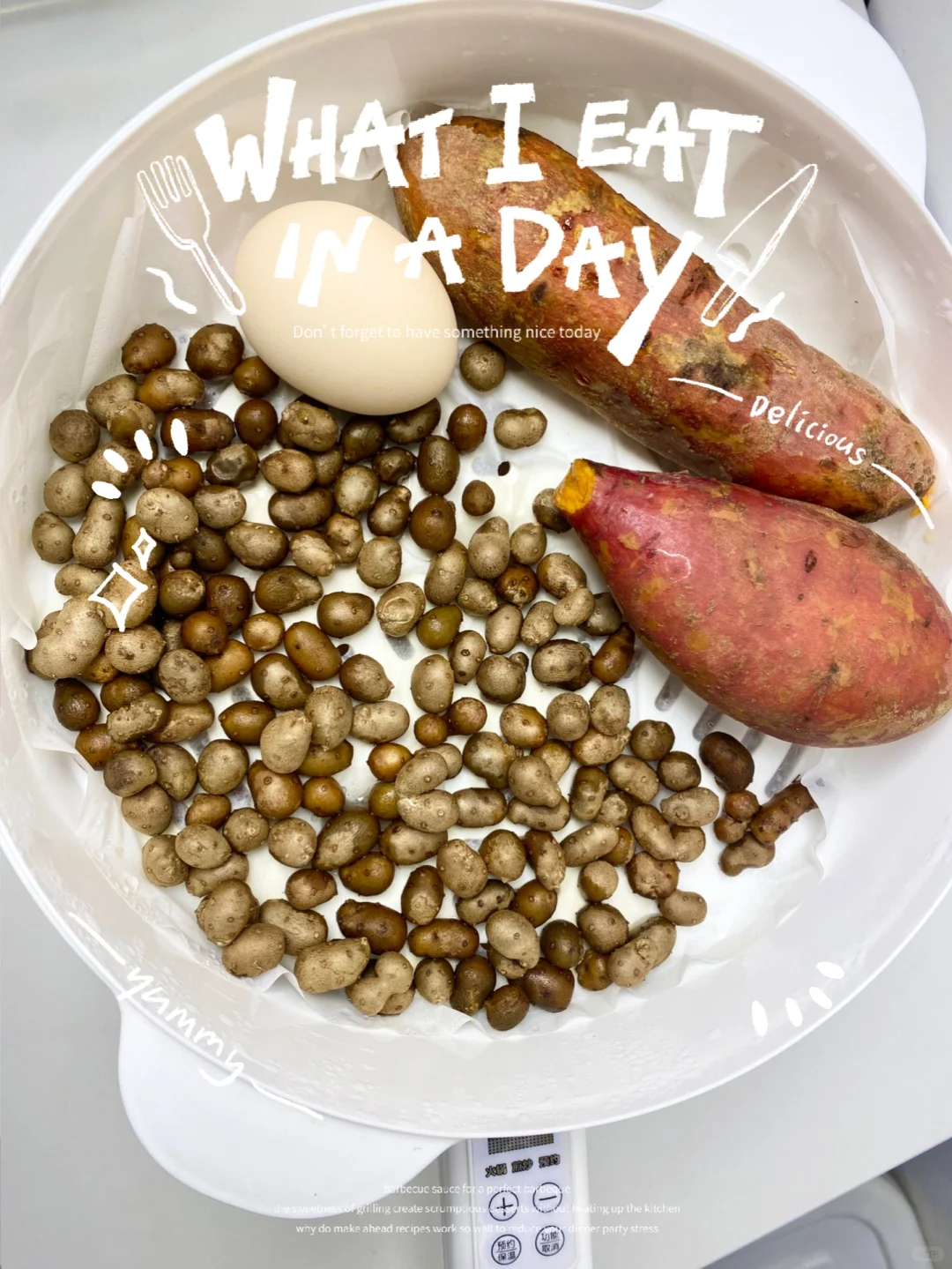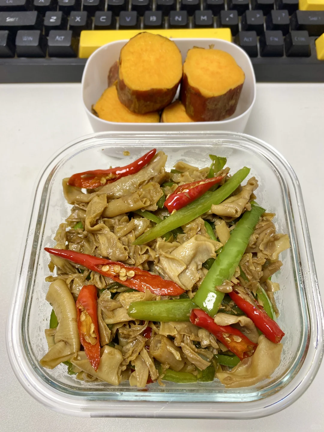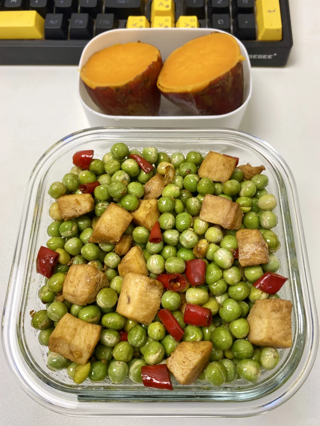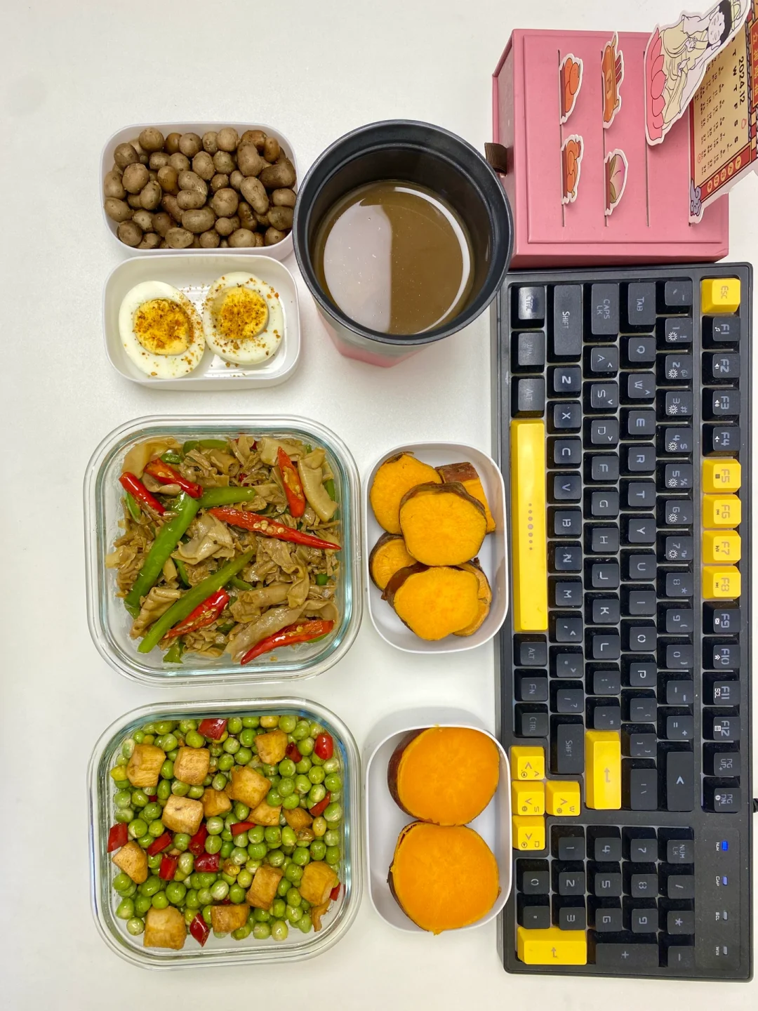 多带了一次饭[微笑R] 1⃣️早:山药豆、鸡蛋、黑咖啡(1.5💰) 2⃣️中:爆炒碎肠、红薯(1.6💰) 3⃣️晚:豌豆炒鸡胸肉、红薯(3.9💰) 碎肠还是十月一从老家带的0💰 合计:7💰