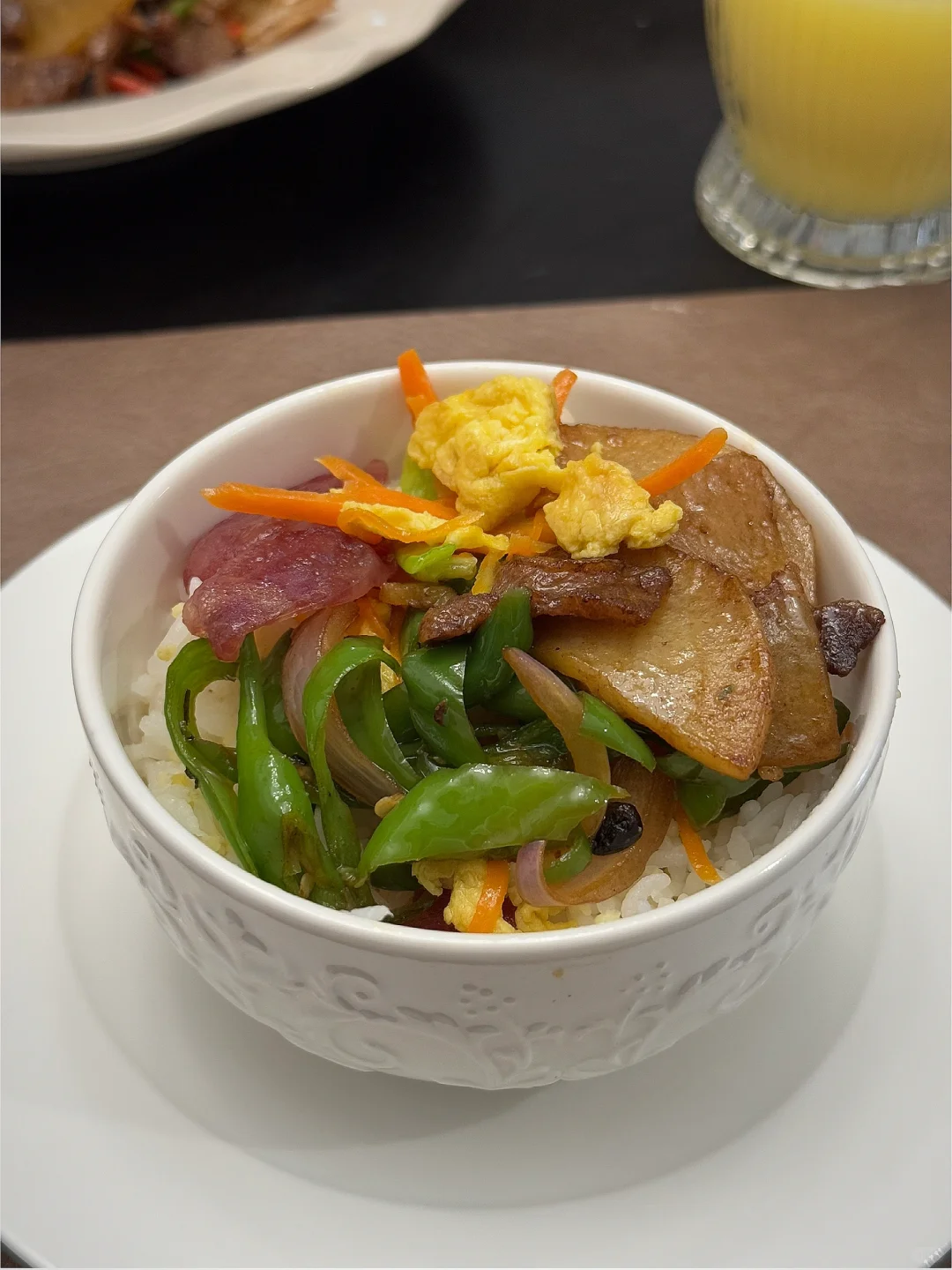若用心, 烟火的日子也可盛满悠然与惬意, 若热爱, 这一生都是关于喜悦和爱的相遇。 今天的饭菜没什么特别,就是好吃,土豆这样炒,没有放一滴水,就是要做出干锅土豆片的味道,很香很下饭! 现在的胡萝卜可真甜,炒鸡蛋好看也好吃。 香肠这么蒸是因为冰箱里多了小半根山药很久没吃怕坏了! [大笑R]玉米汁热乎乎的很落胃啊哈哈 🍽️今日菜单: 干锅土豆片 清蒸香肠 胡萝卜炒鸡蛋 五花肉炒青椒洋葱 饮品:🌽玉米汁